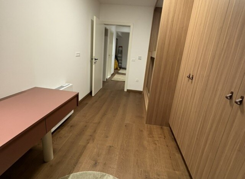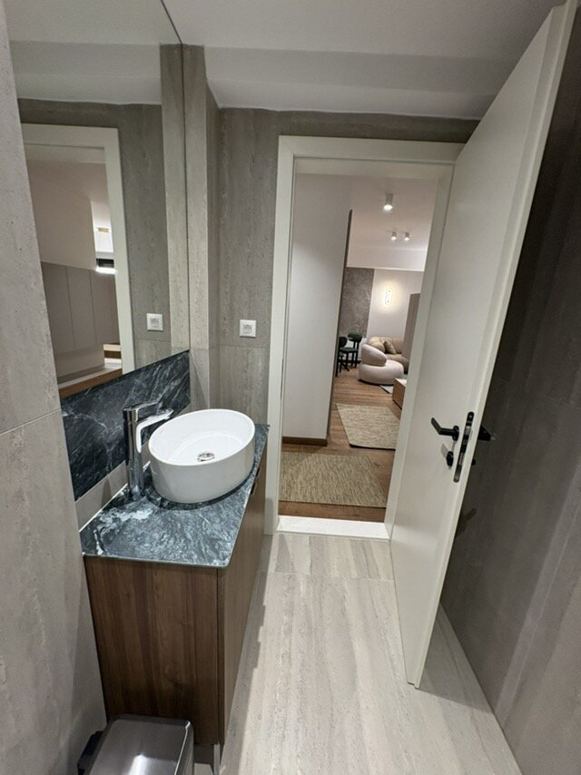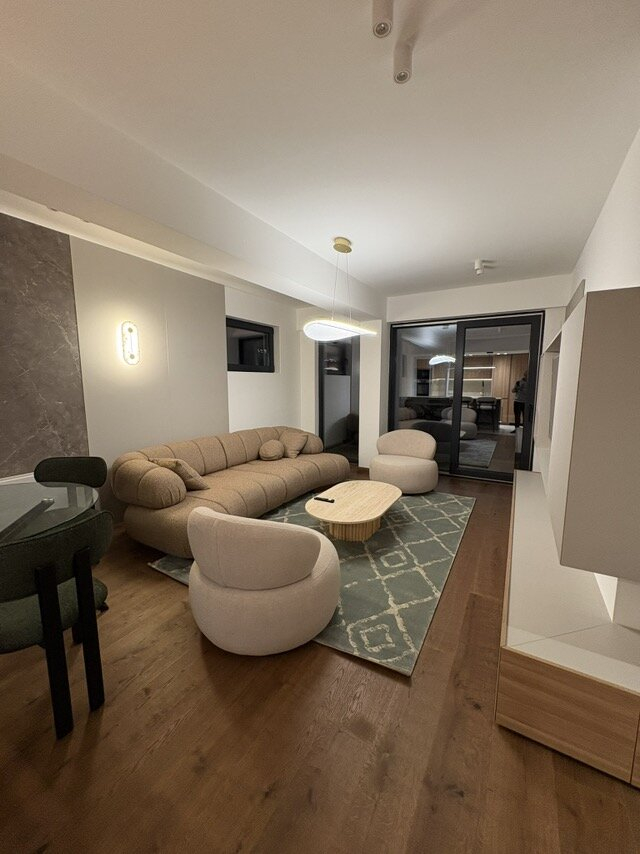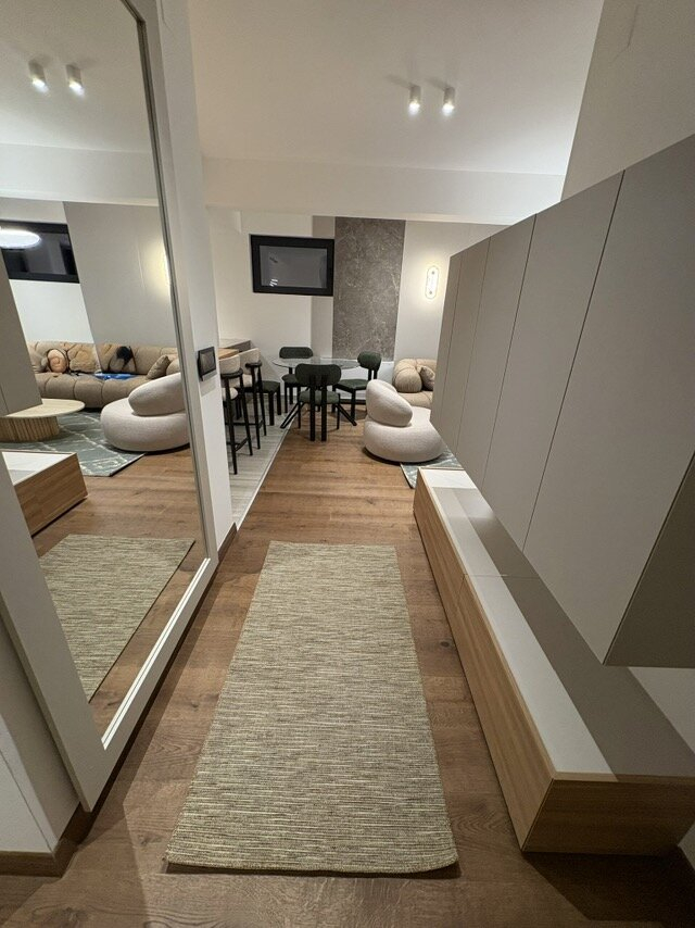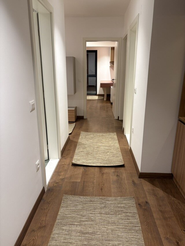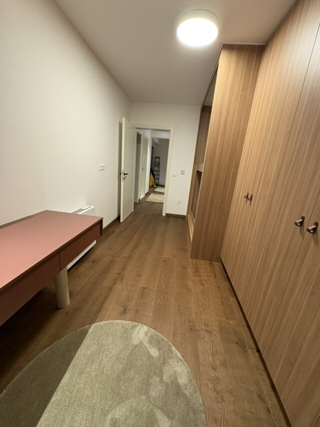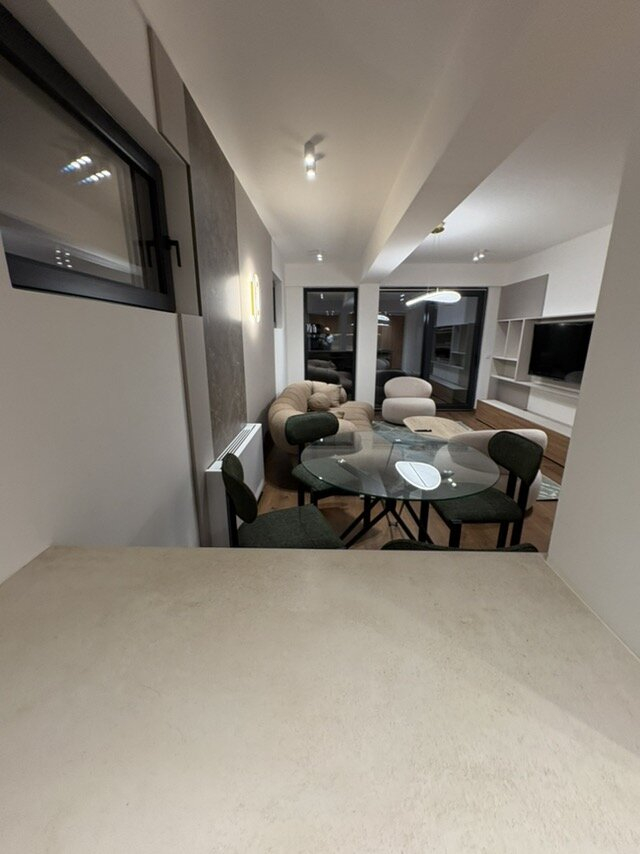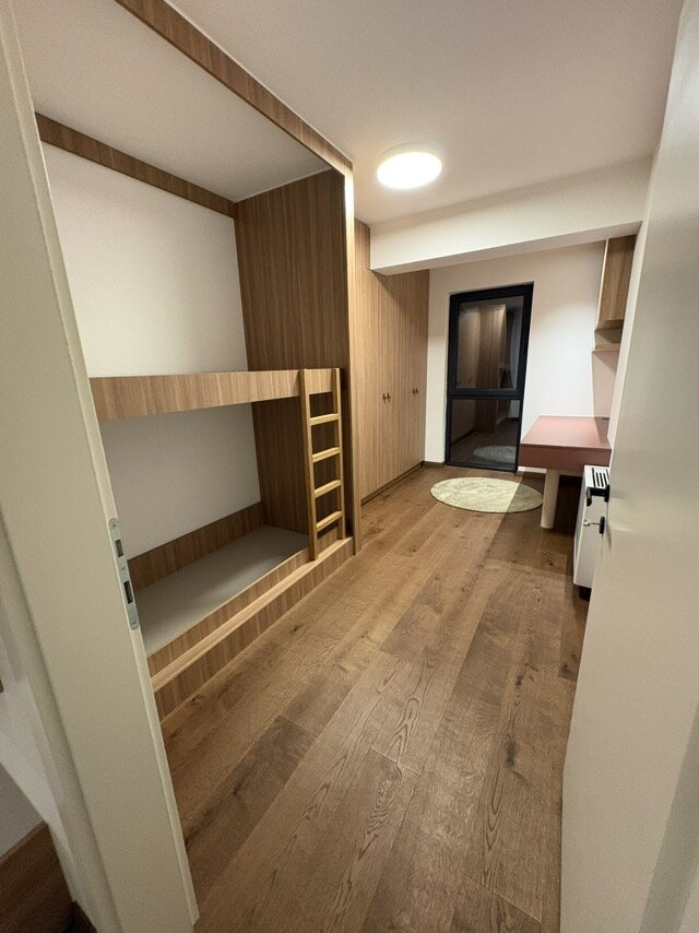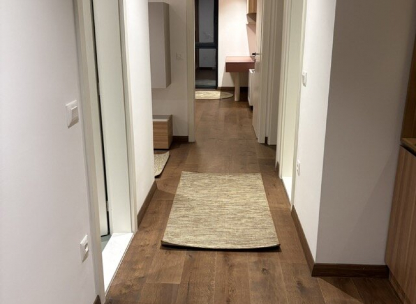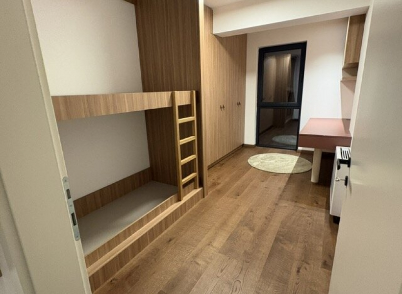 The apartment is in a building with only 4 units, offering high energy efficiency, video surveillance of the entrance and parking, as well as internet and TV installation in every room with a wireless router. It is equipped with children's beds with solid wooden stairs, a comfortable sofa, and rotating armchairs, while the carpets are Belgian-made and anti-allergic. The location is peaceful and quiet, just a 10-minute walk to Diamond Mall, and close to kindergartens, a primary school, playgrounds, and a market.