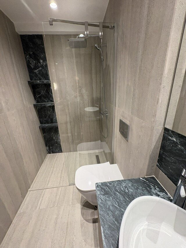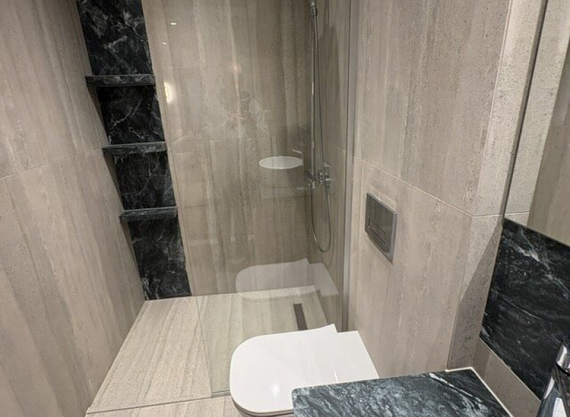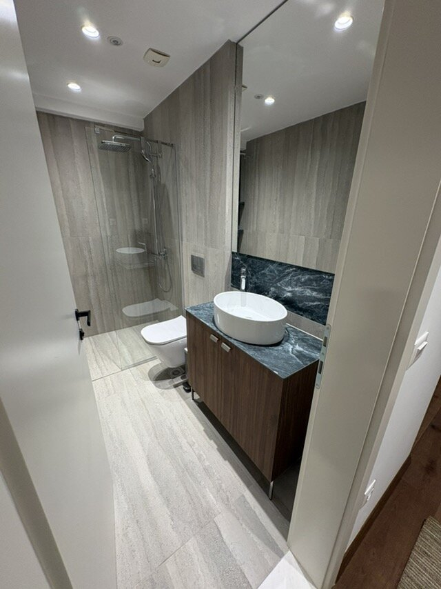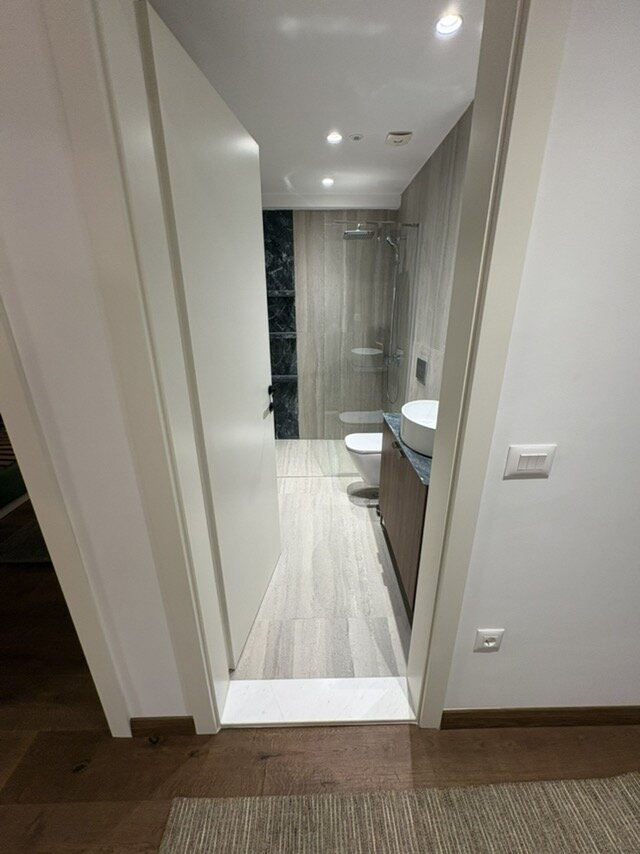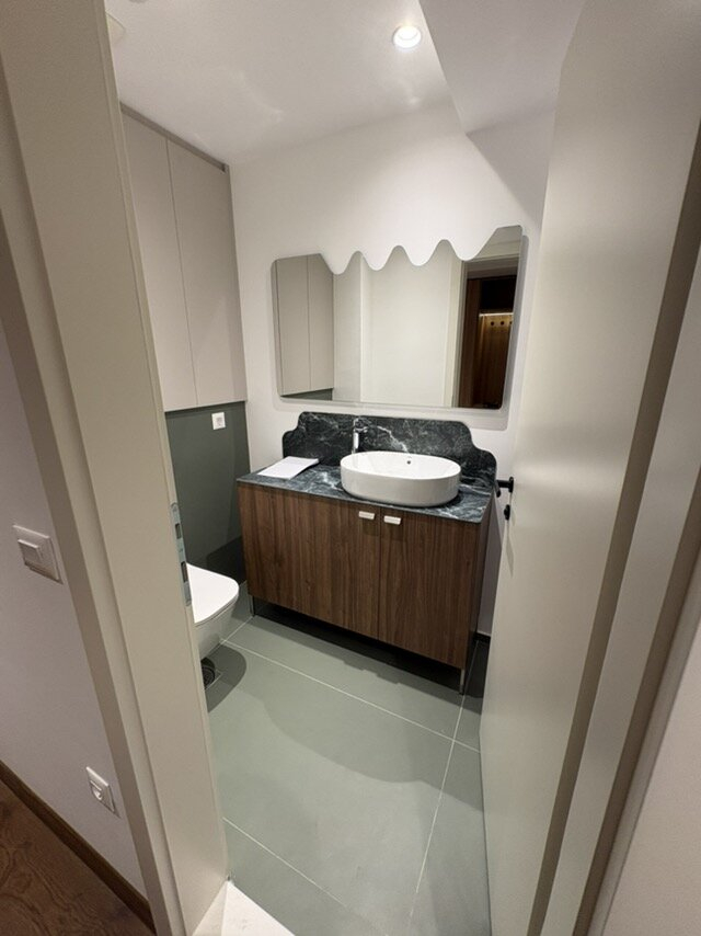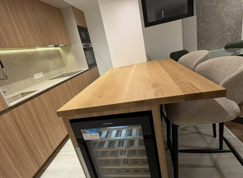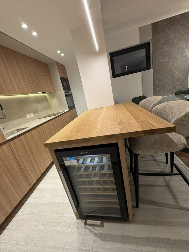 The apartment is located on the first floor with eastern orientation and is built with high-quality materials, including German parquet, Italian stone for kitchen surfaces and tiles, and Rehau windows with 7 layers of glass. The layout is carefully organized for maximum comfort and functionality.