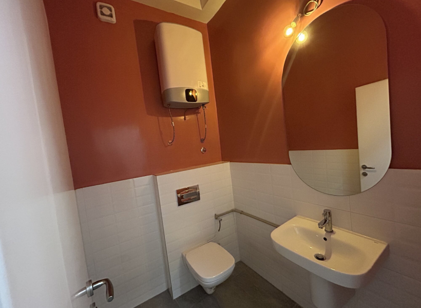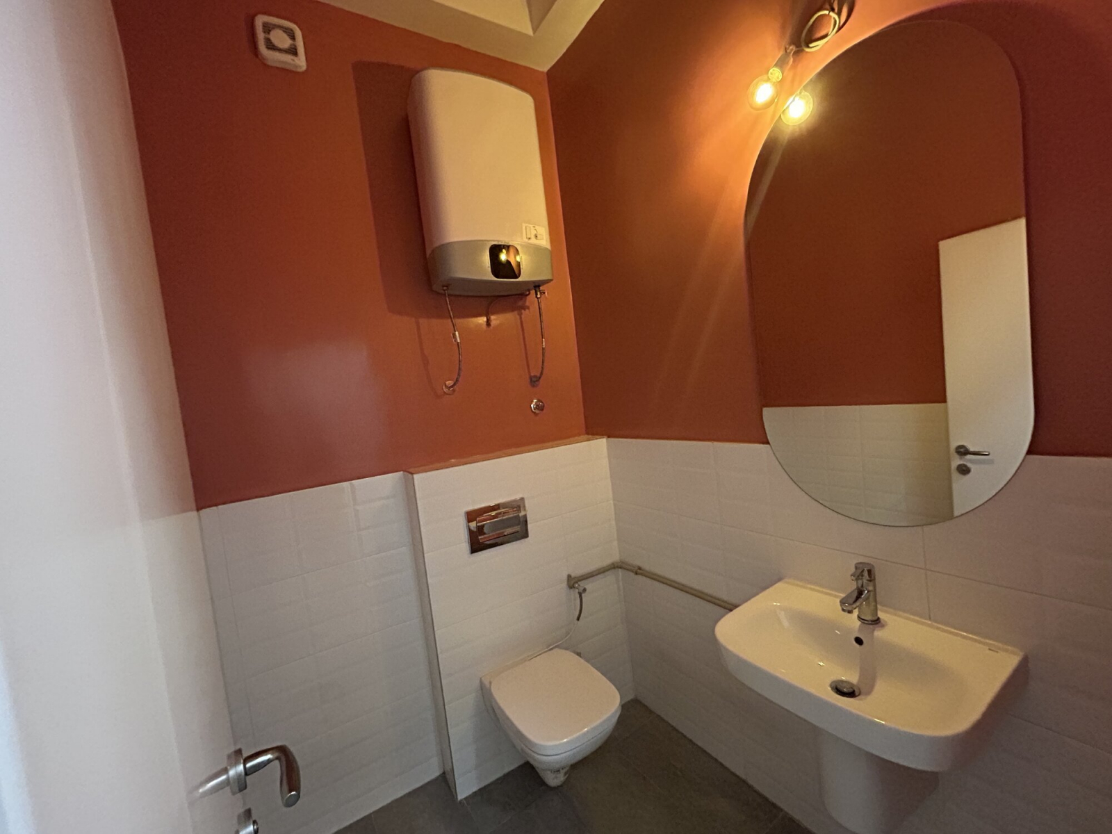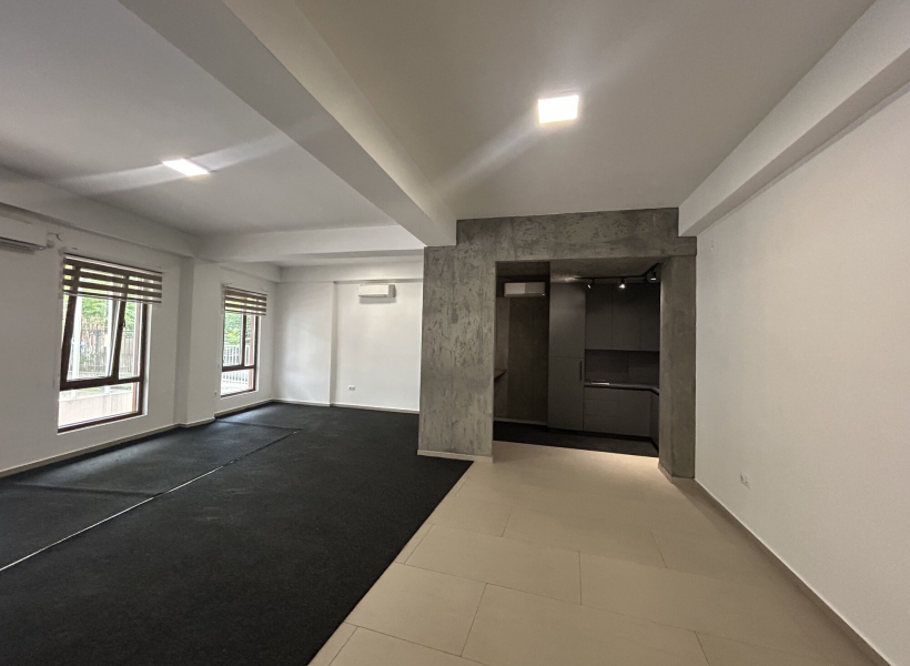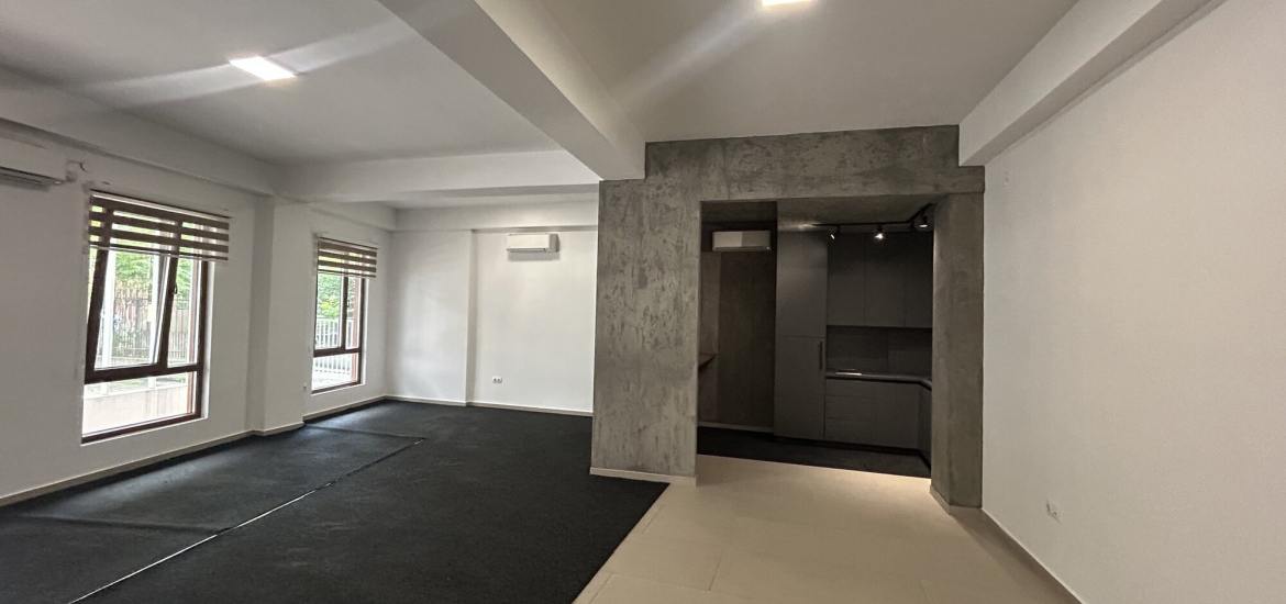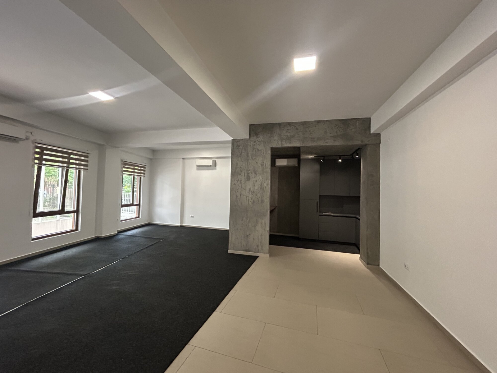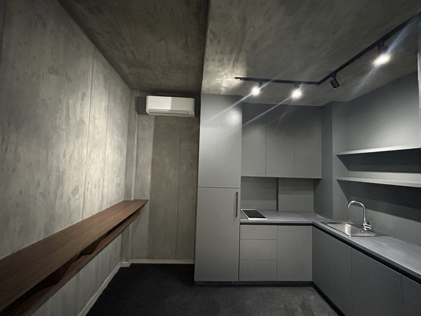 The space features an open working area, two offices (one larger and one smaller), and a fully equipped kitchen. It comes with 5 air conditioning units connected to a multi-split system for both heating and cooling.