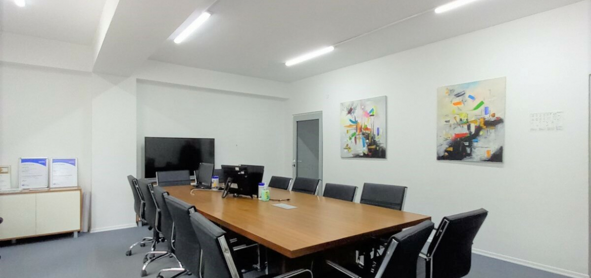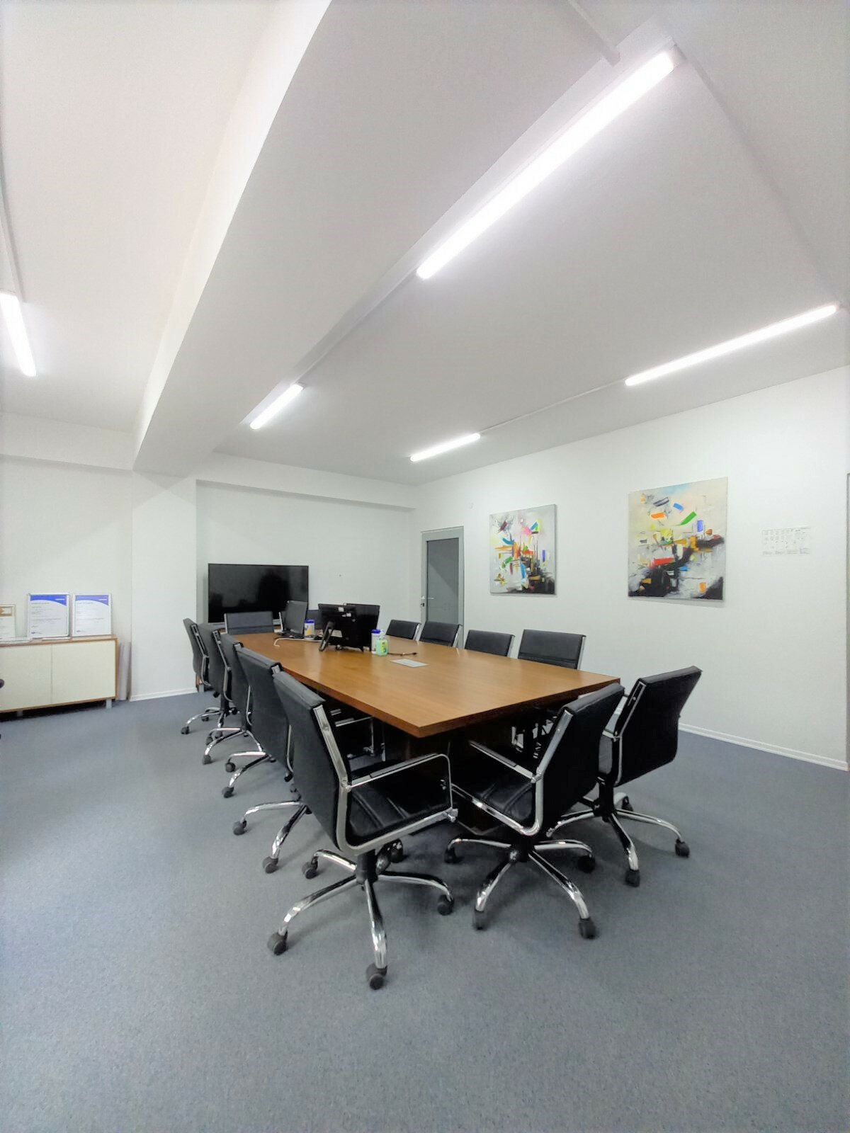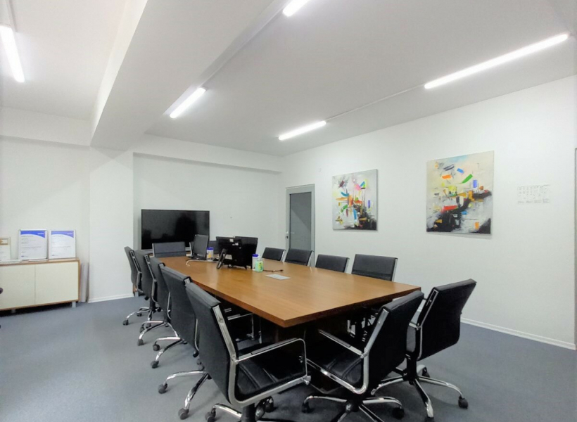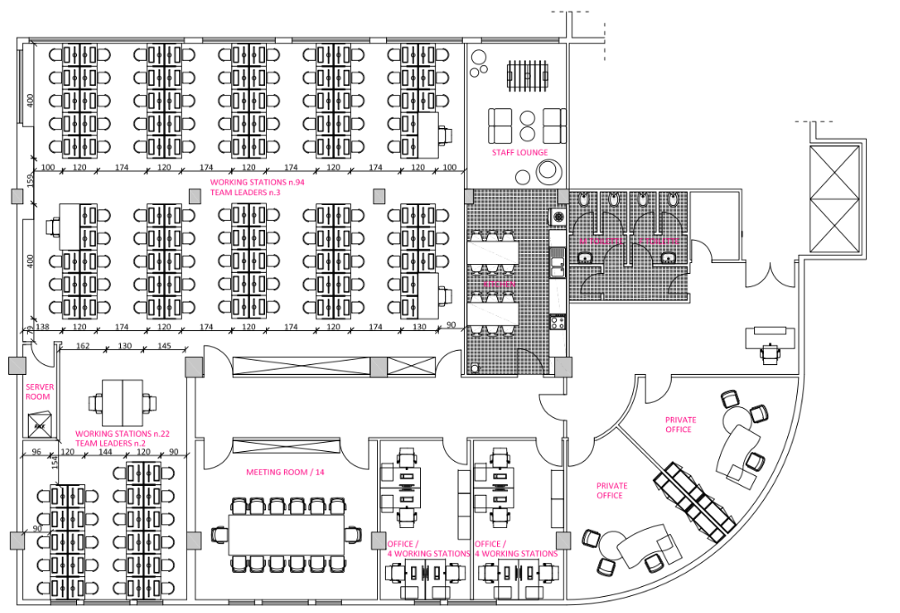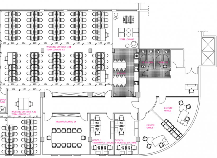 The office space is located on the 1st floor and has an open space with 94 work positions, two management offices, two offices with 4 work positions, a conference room for 14 people, office with 24 work positions, server room, kitchen and toilets.