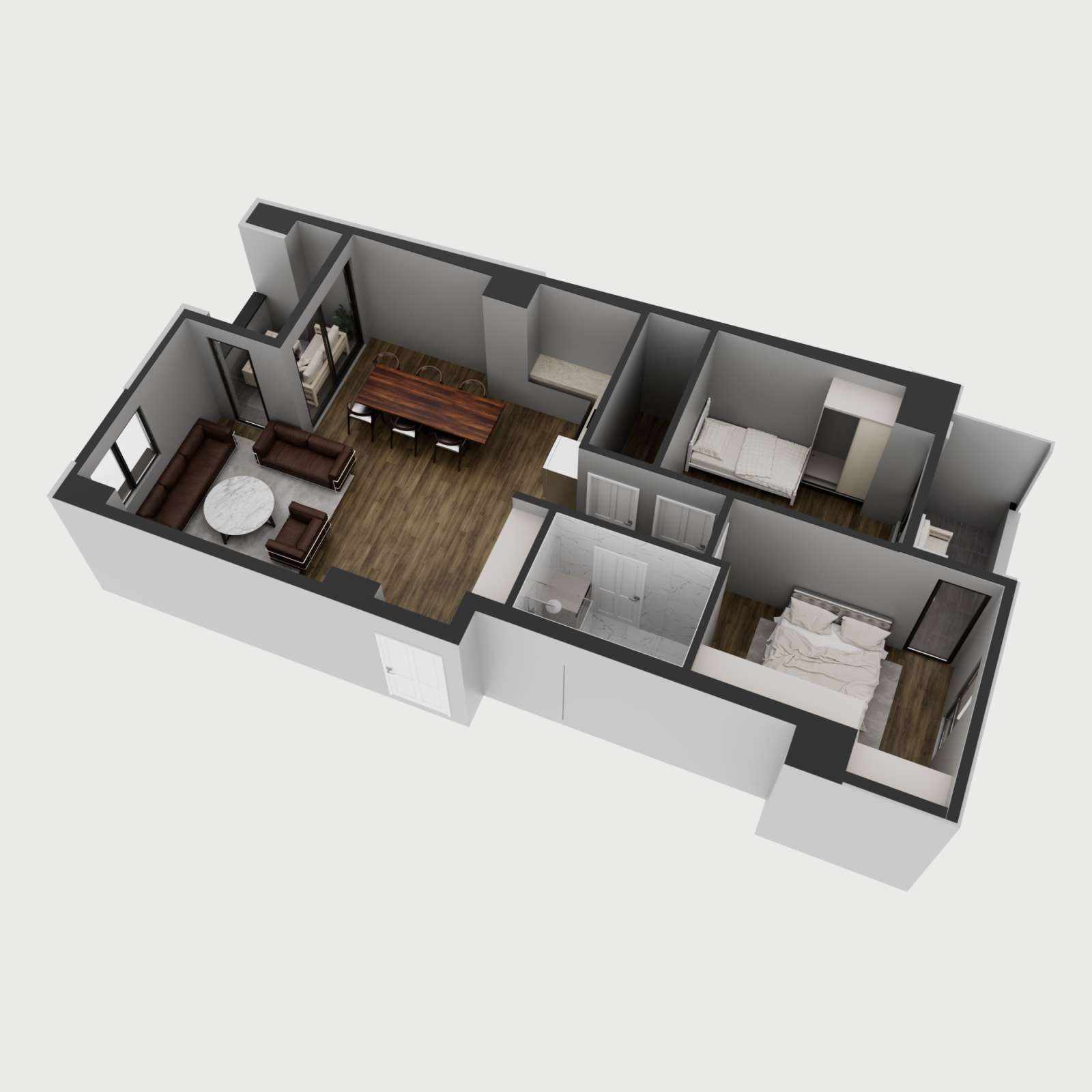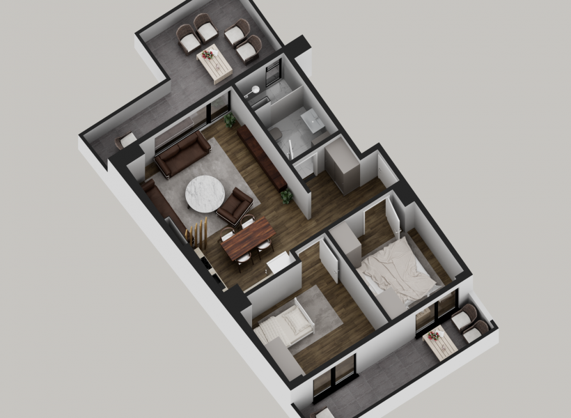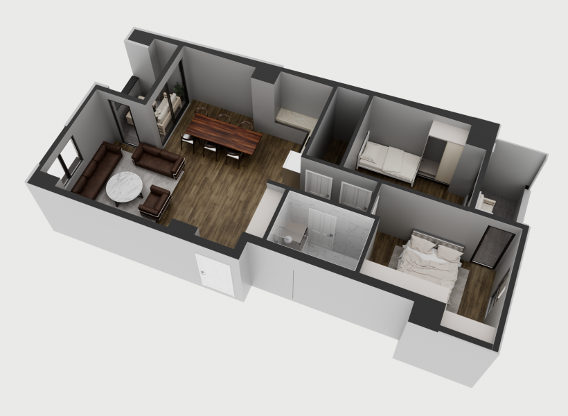 Стан 2 – 60м²: дневна соба, кујна со трпезарија, две спални соби и бања