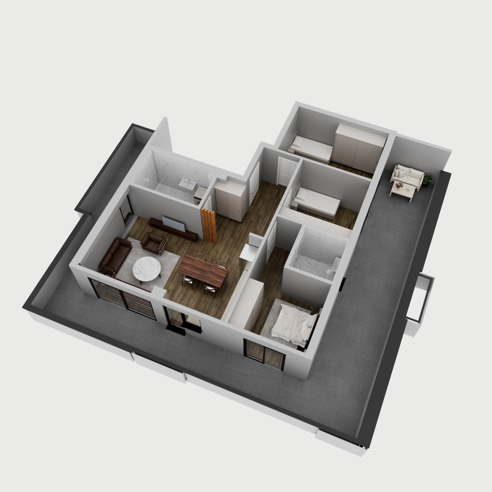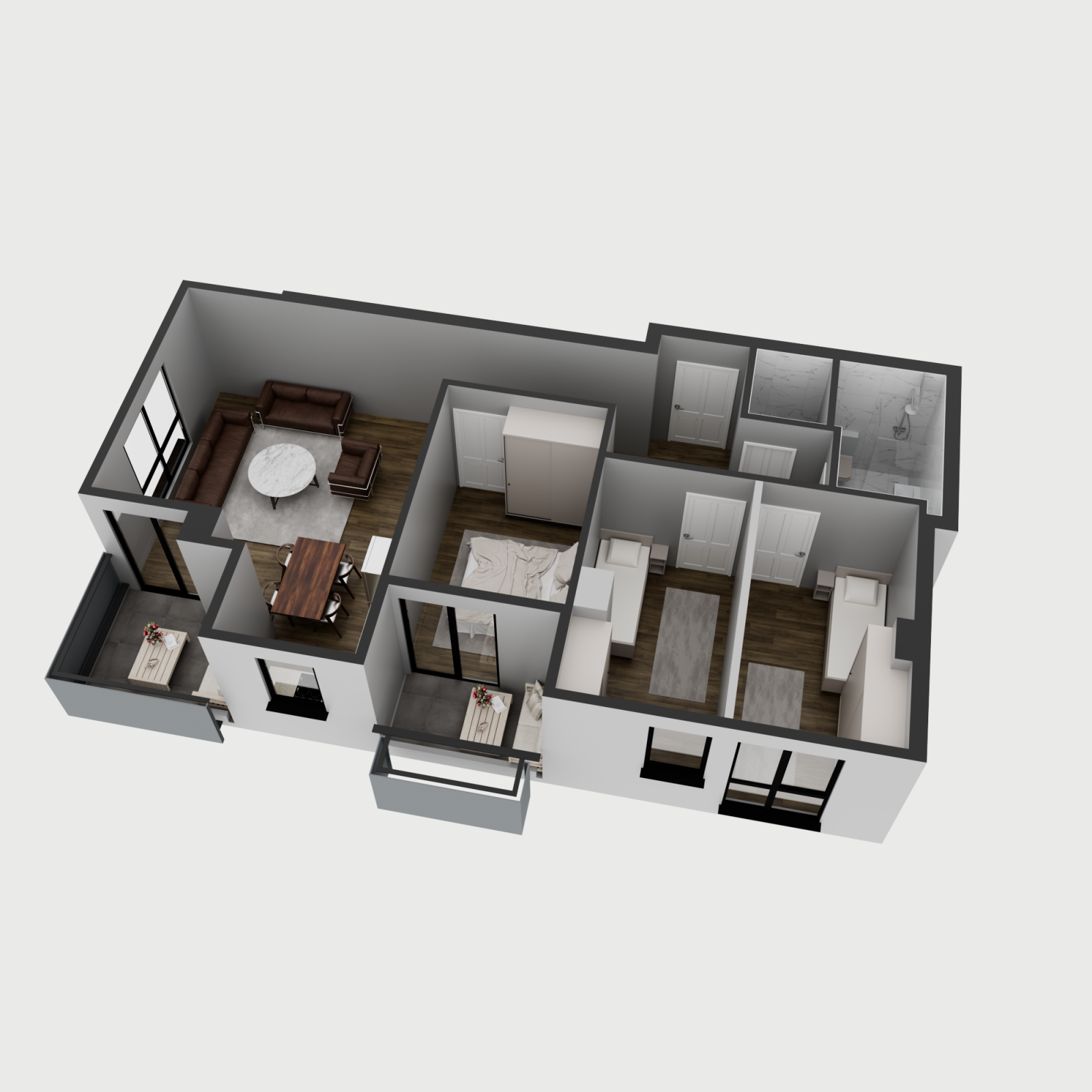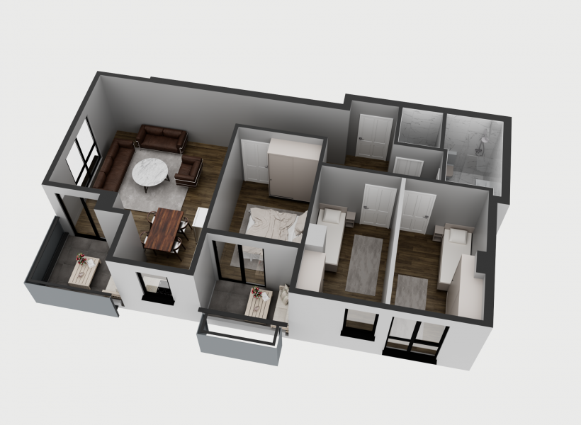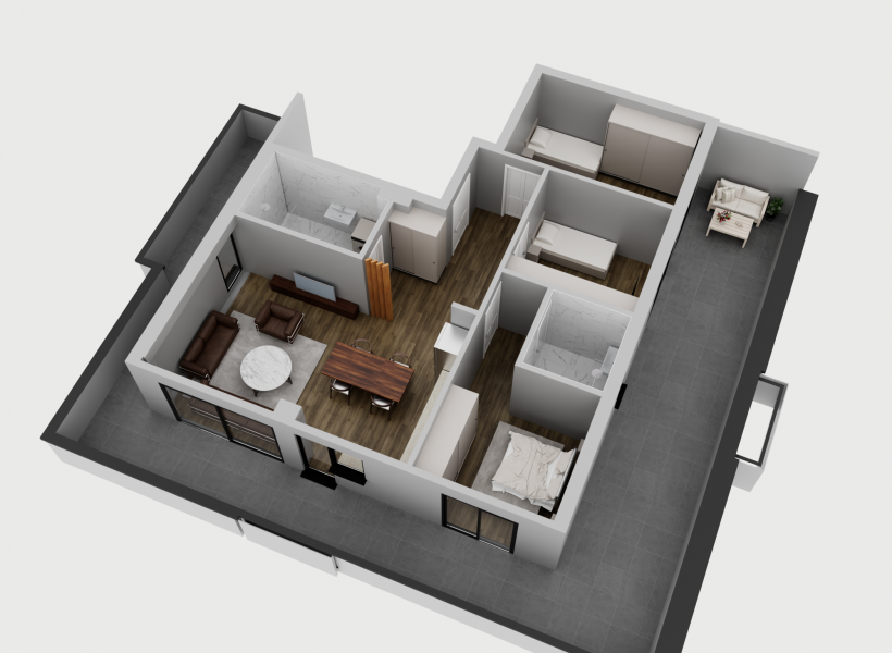 Стан 5 / 8 / 11 / 14 – 79м²: дневна соба, кујна со трпезарија, три спални соби, бања, тоалет и тераса