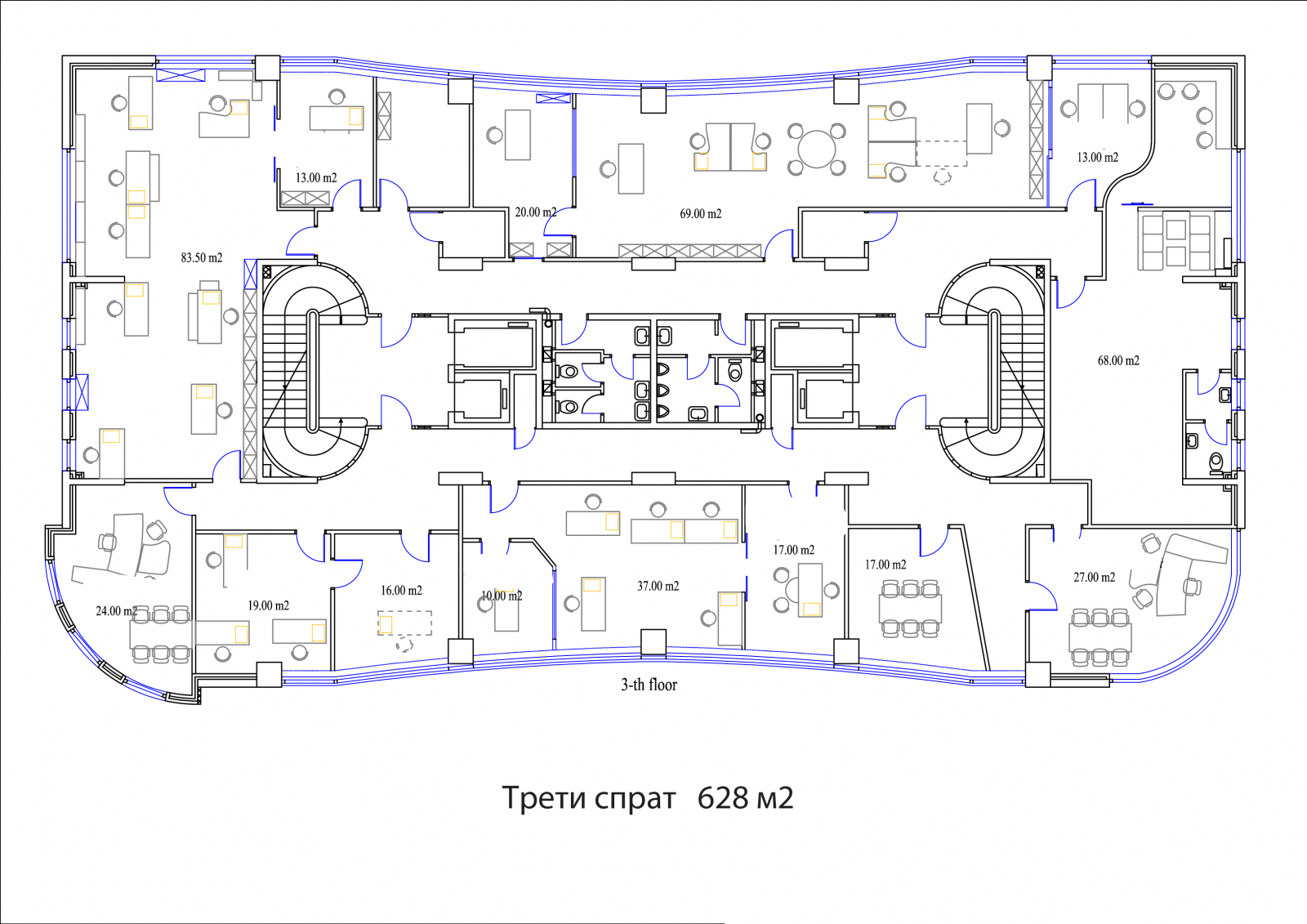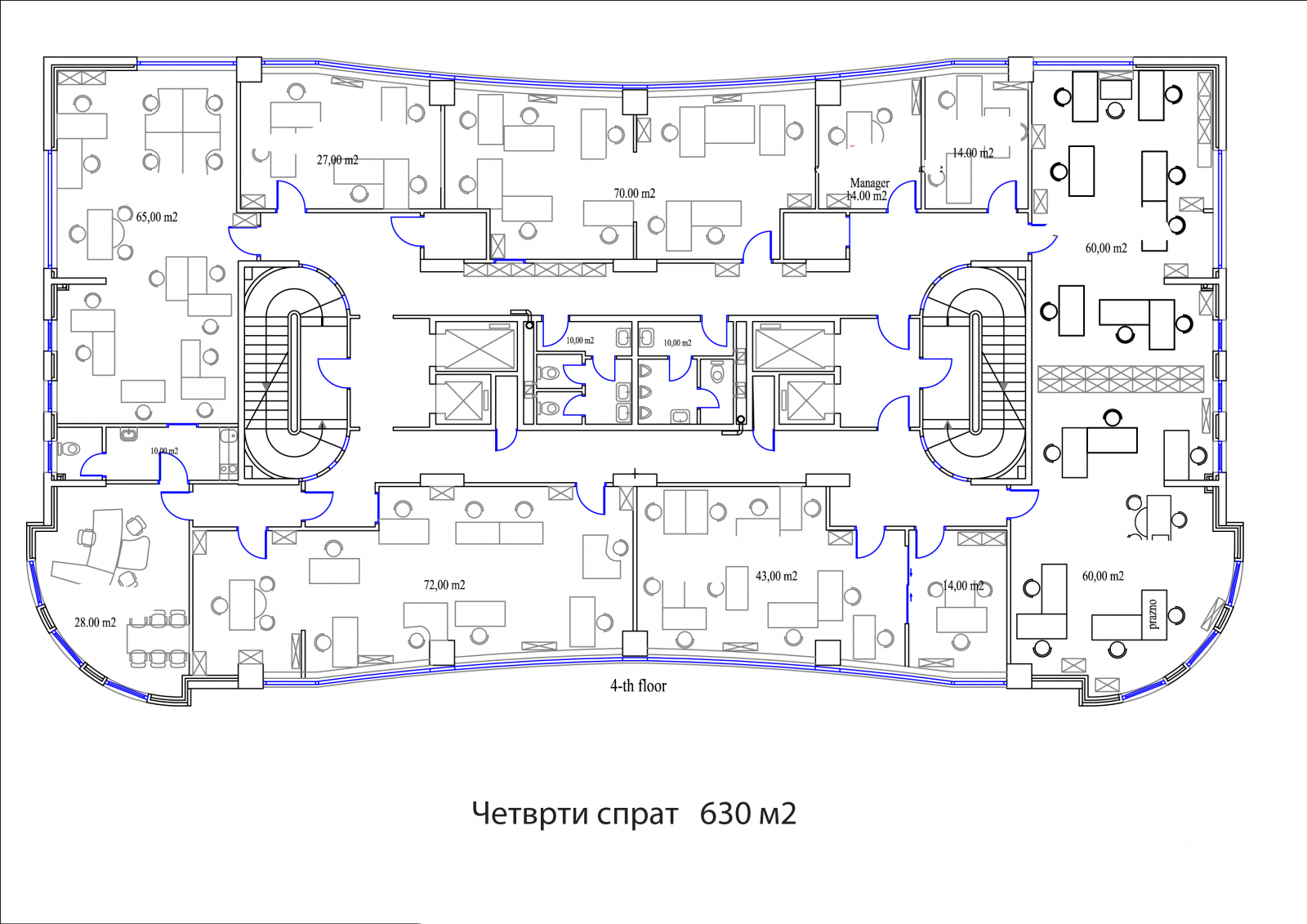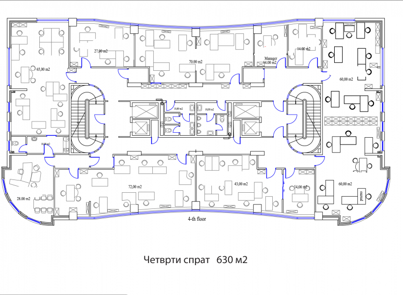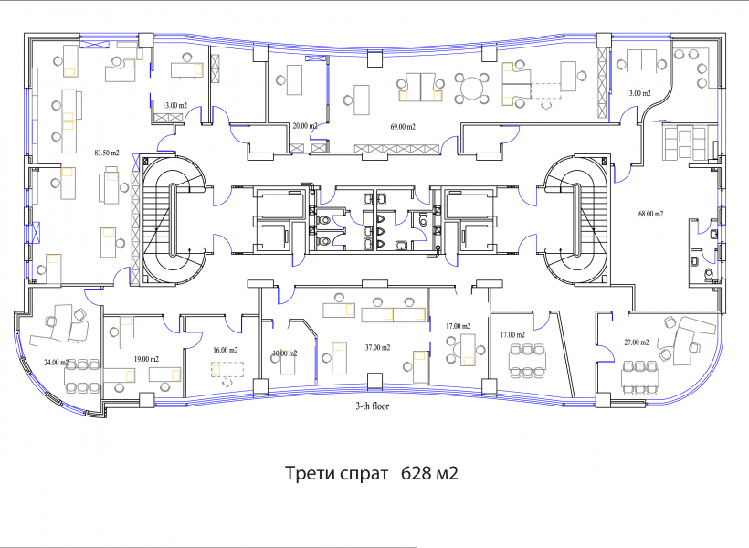Деловните простори се лоцирани на 3ти и 4ти кат со површина од 630м2 по кат, односно вкупна површина од 1890м2.