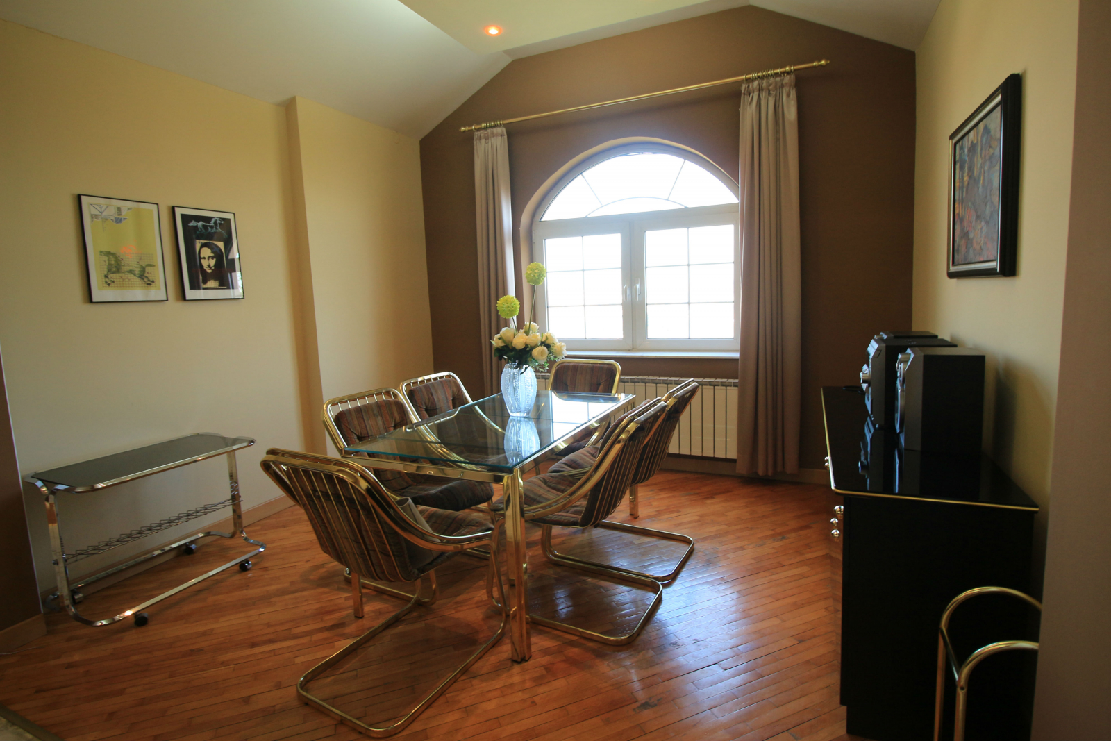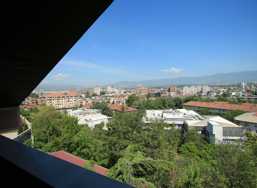 It consists of a living room, a dining room and a fully equipped kitchen . The apartment has two bedrooms and two terraces, one with a view of Vodno (in the bedroom) and the other with a view of the city center. The bedroom has one bath.