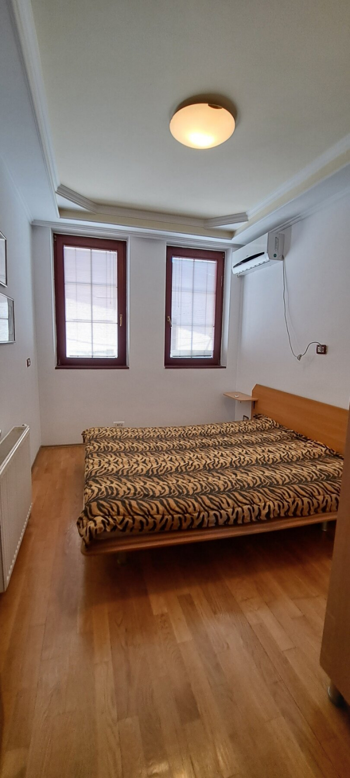 The heating and cooling of the apartment are regulated through a heat pump and air conditioners in each room.