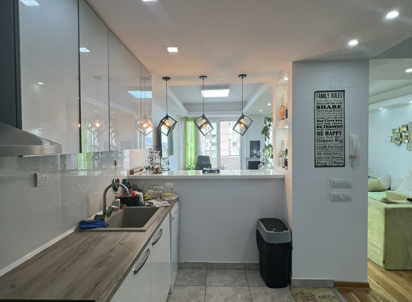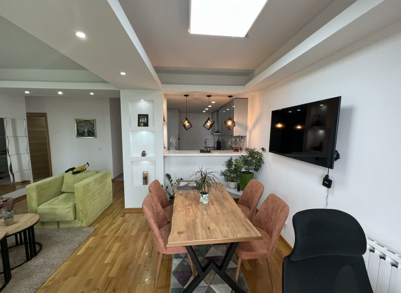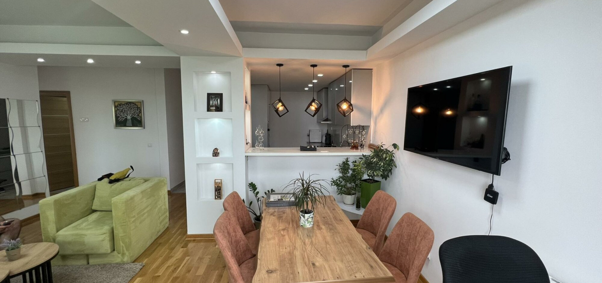 The apartment is fully furnished and has two bedrooms, comfortable living room with fully equipped kitchen, dining room and toilet.
