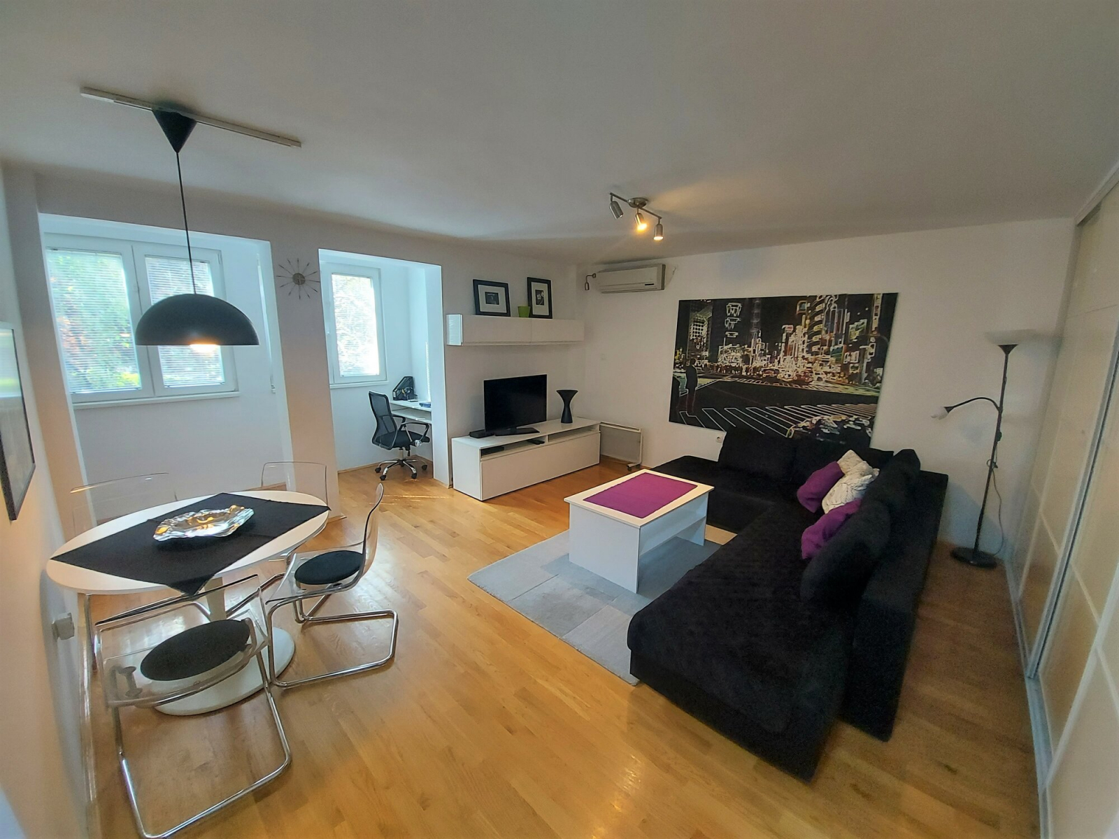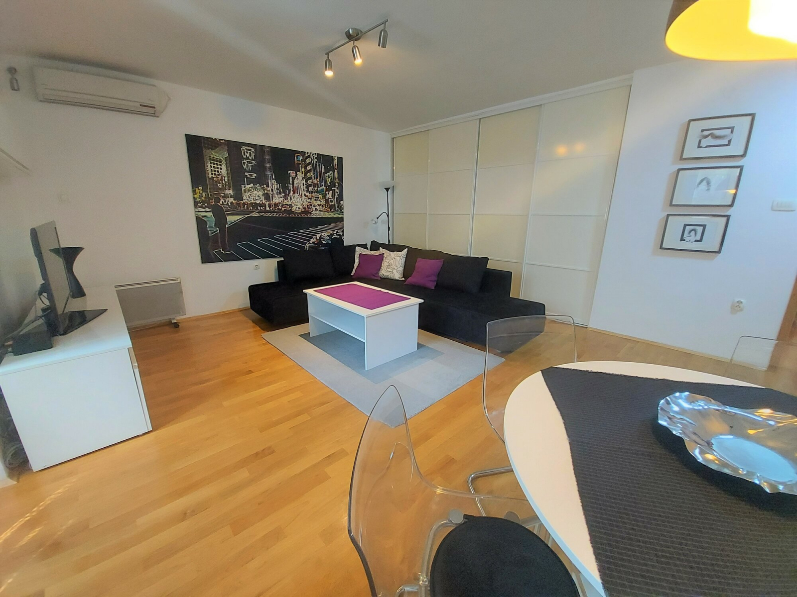 Heating and cooling of the apartment is regulated by inverter air conditioners and heating panels.