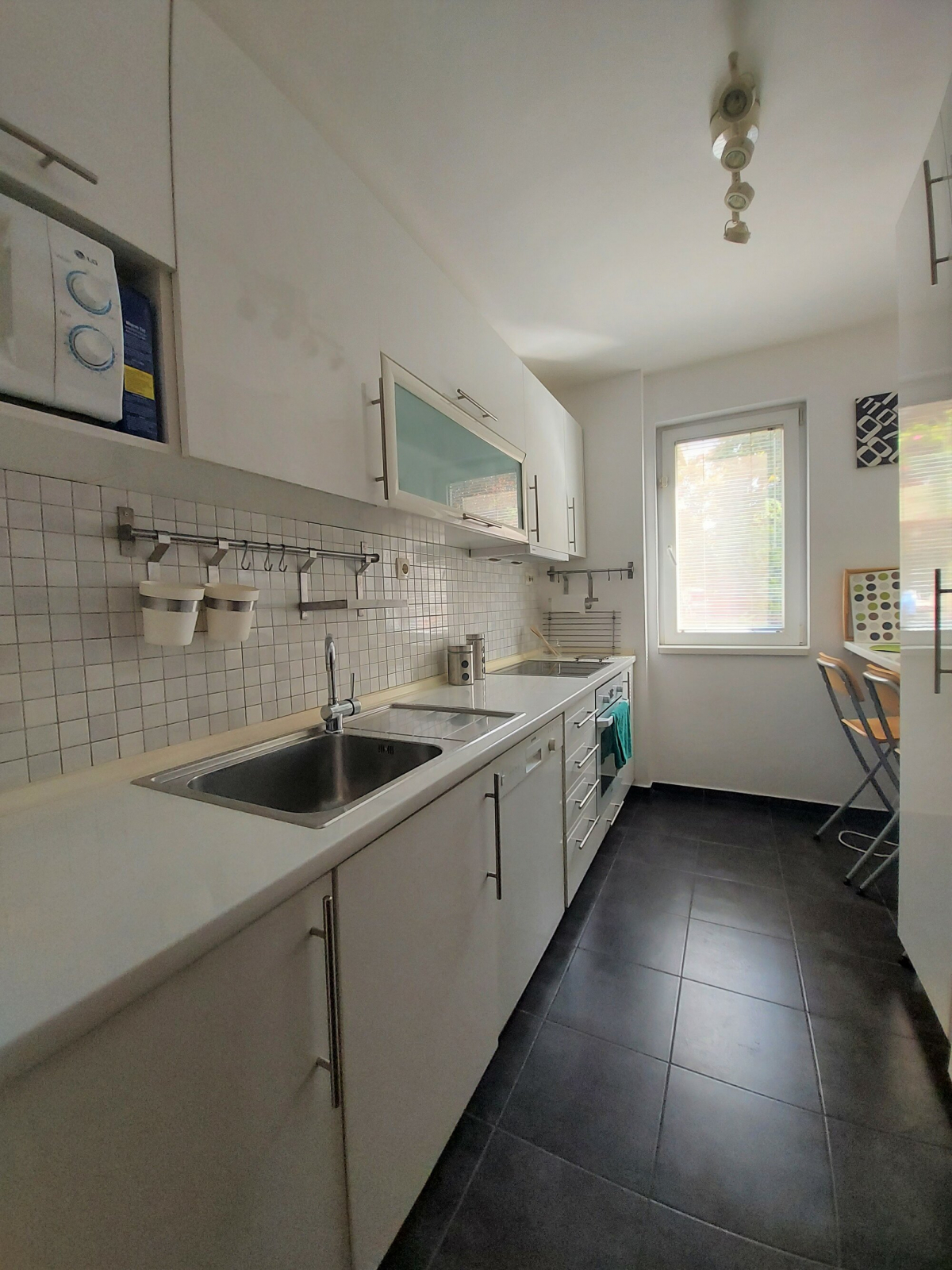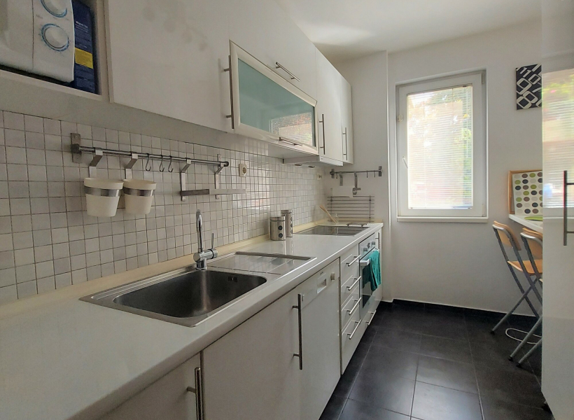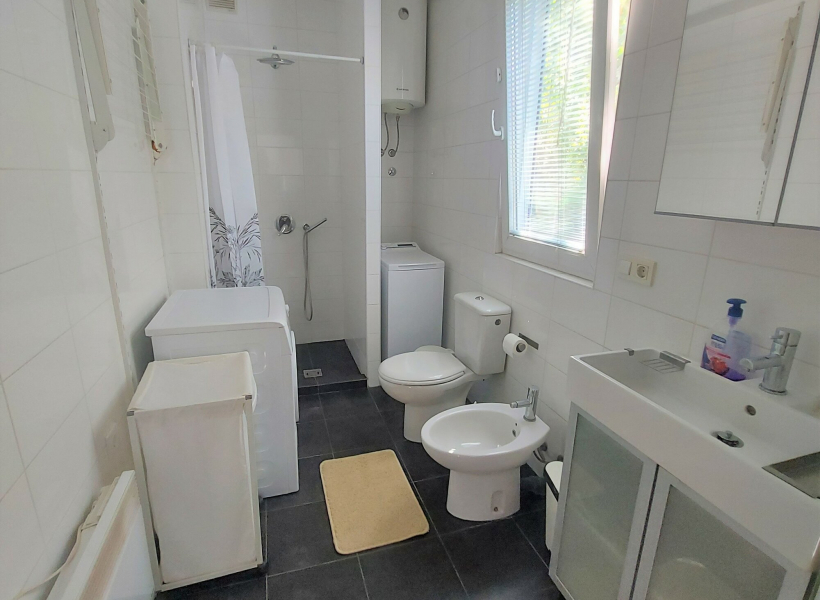 The apartment is located on the high ground floor of a house and has a spacious living room, dining room, fully equipped kitchen, two bedrooms and one bathroom.