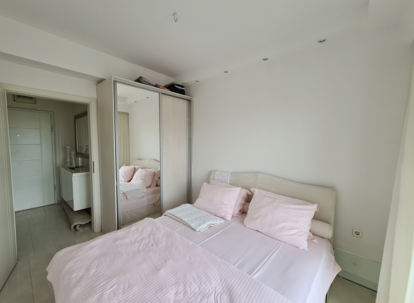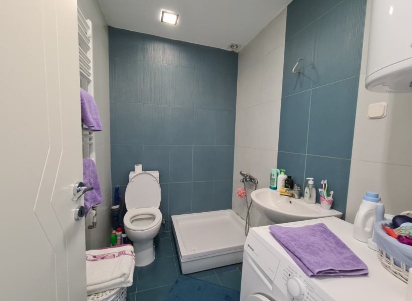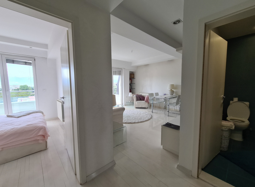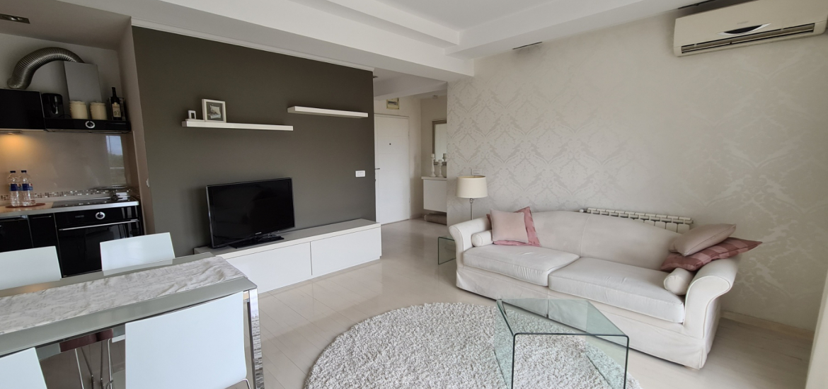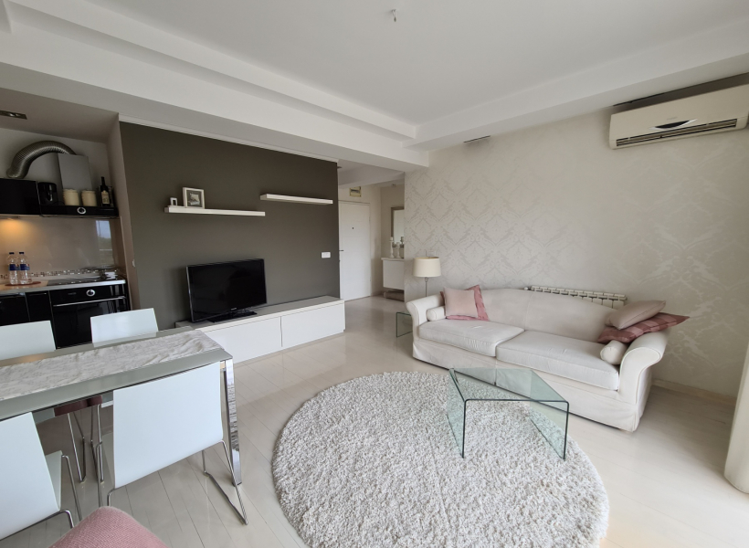 The apartment is located on the third floor in a small building and has a total area of 47m2, has a living room with dining area and kitchen with exit to the balcony, bathroom, and one bedroom also with an exit to the balcony.