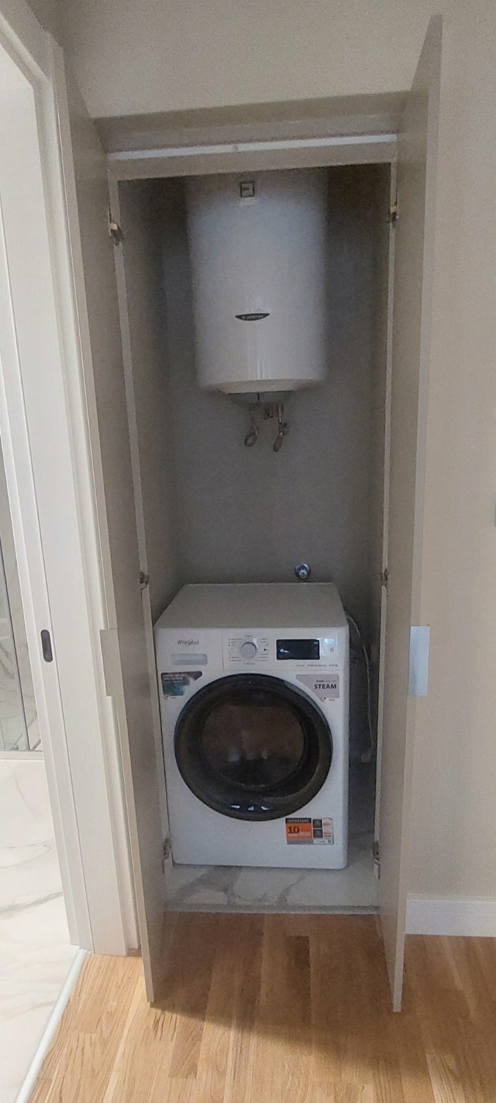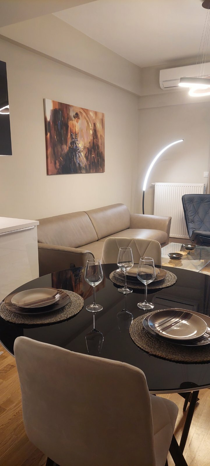 Heating and cooling in the apartment are regulated through a central system and air conditioners.