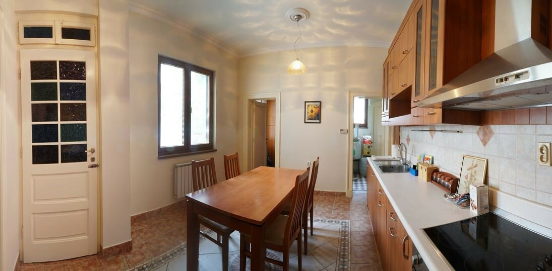 The apartment is located on the upper ground floor and has one spacious living room and an additional salon for tea/coffee, a large kitchen with a dining room, a toilet, and bathroom.
