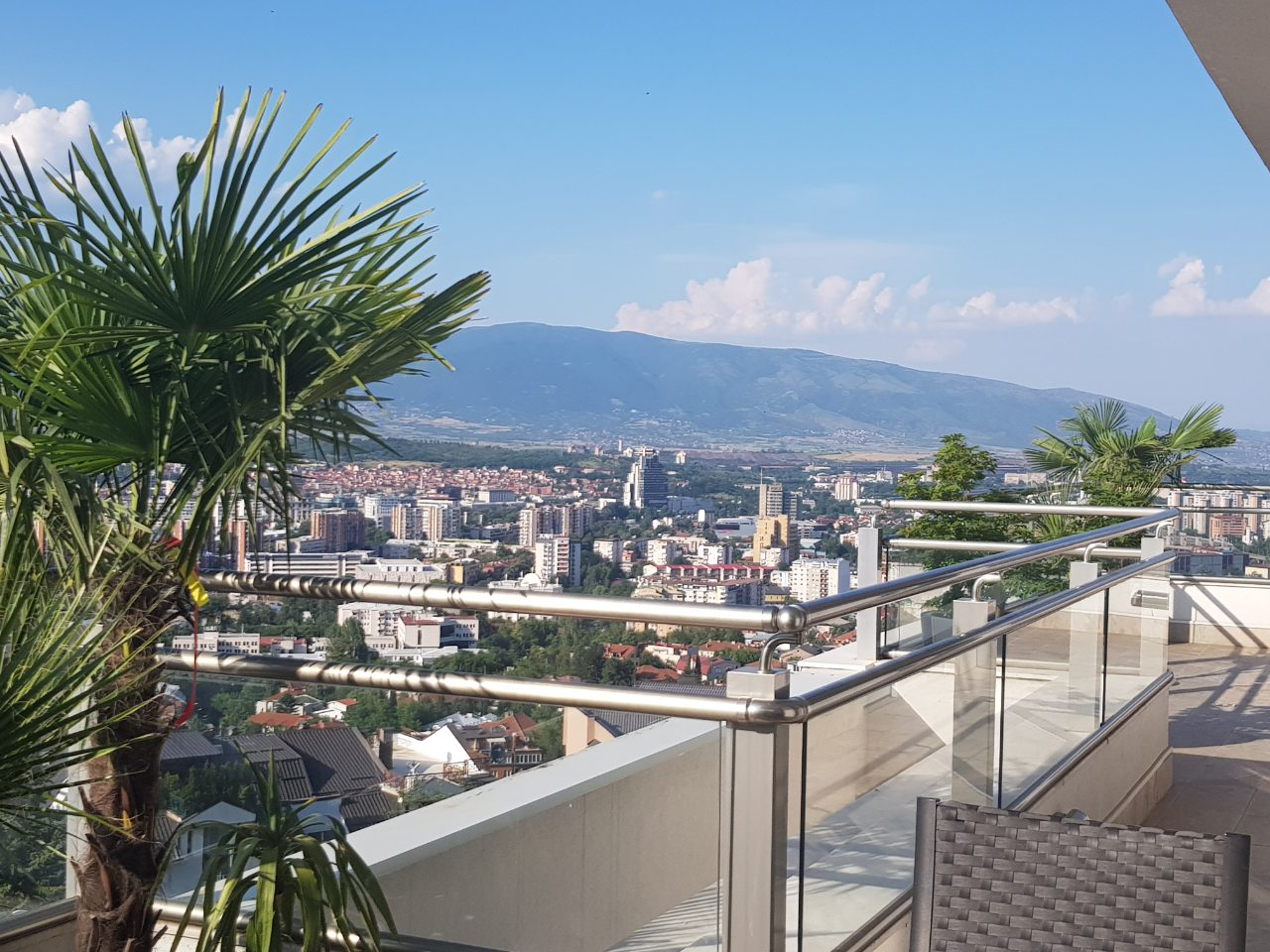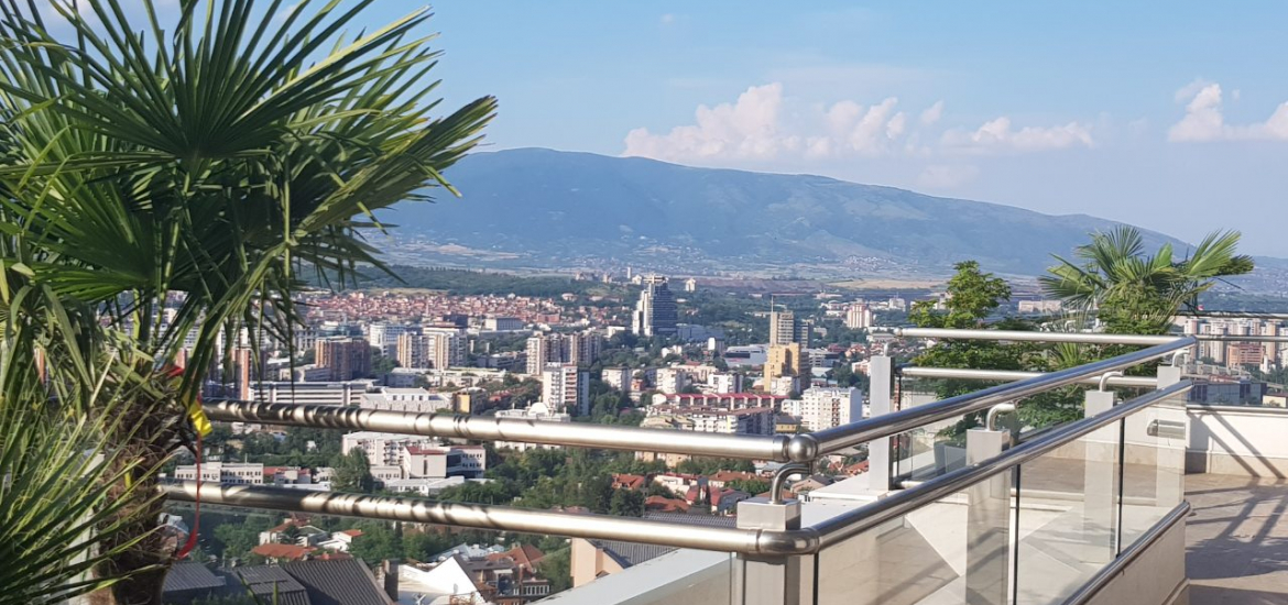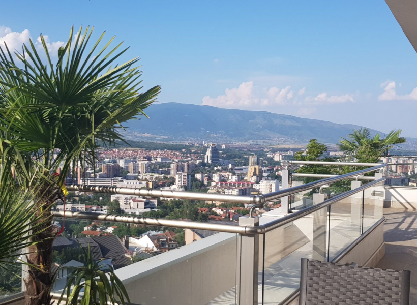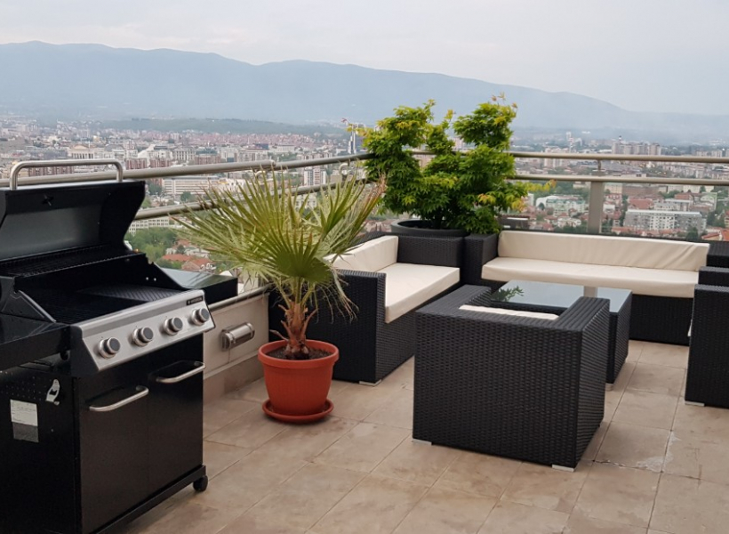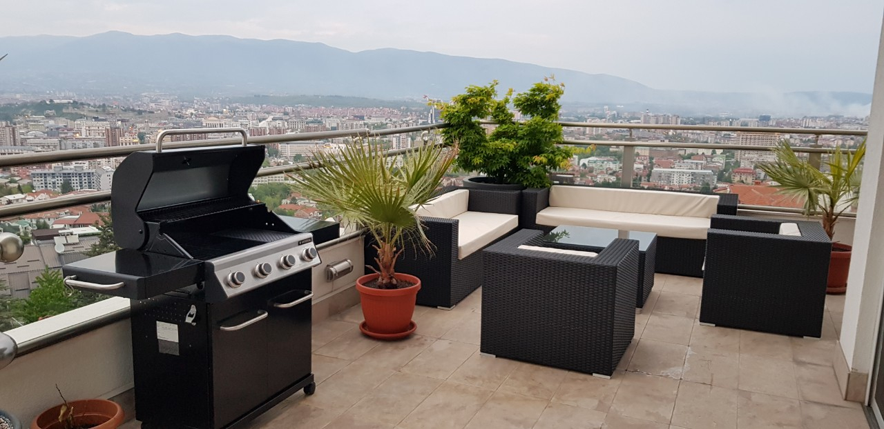 On the terrace there is an outdoor furniture and dining table with a beautiful view of the city of Skopje.