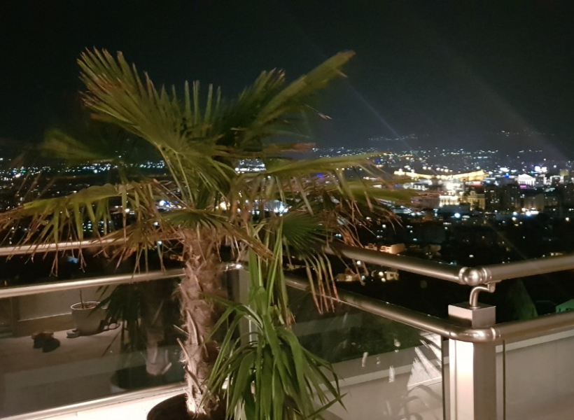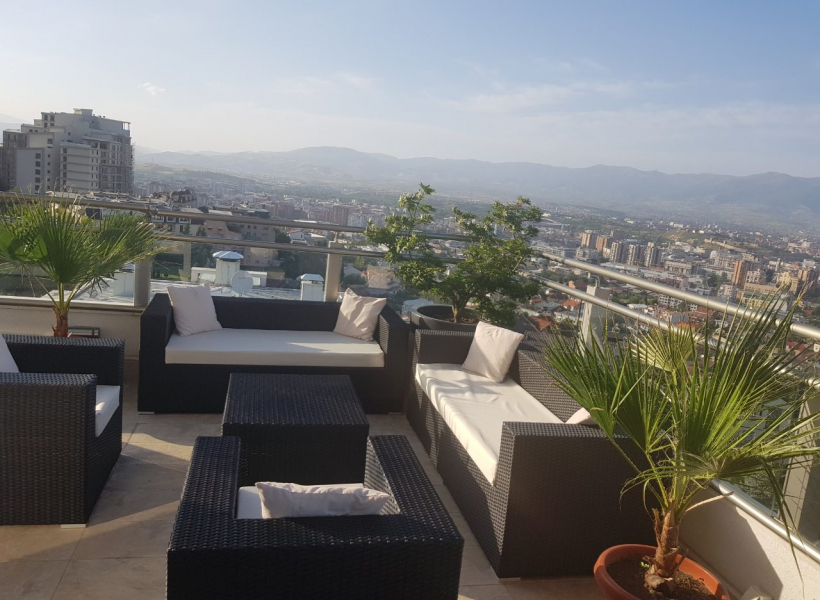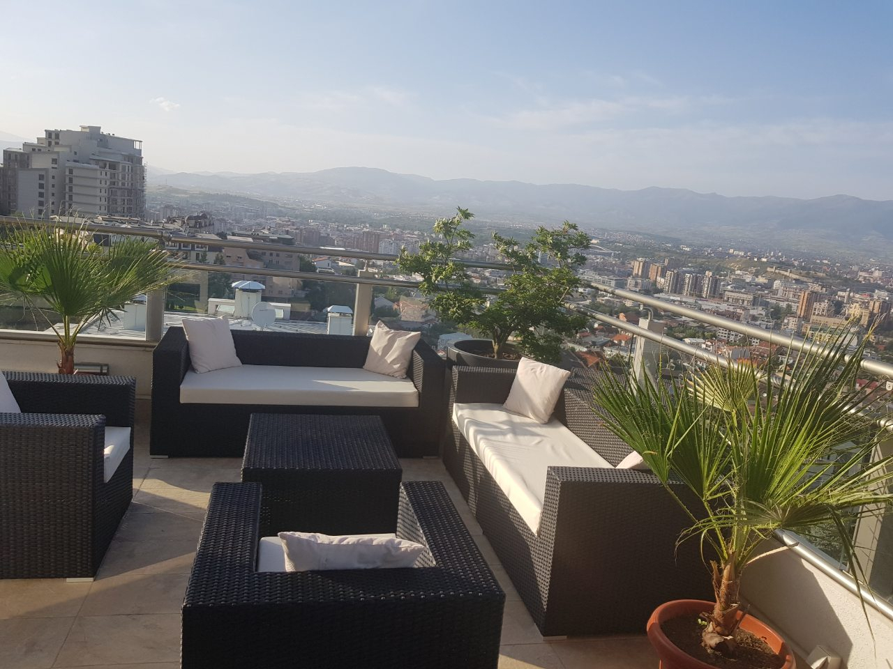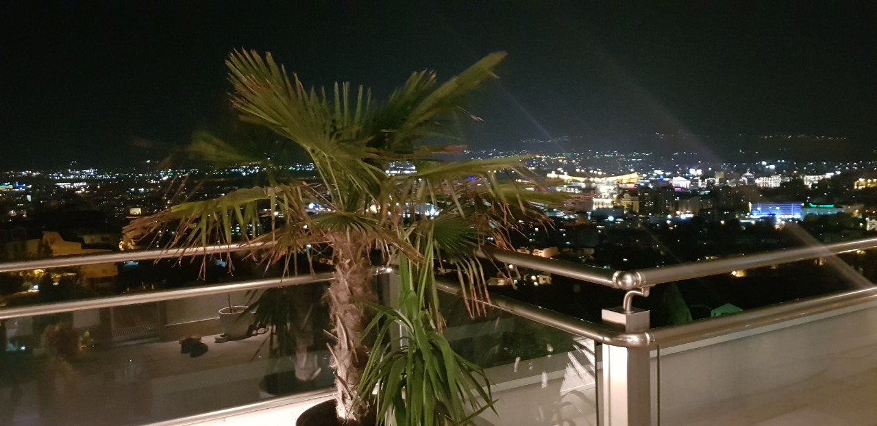On the terrace there is an outdoor furniture and dining table with a beautiful view of the city of Skopje.