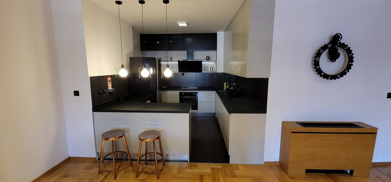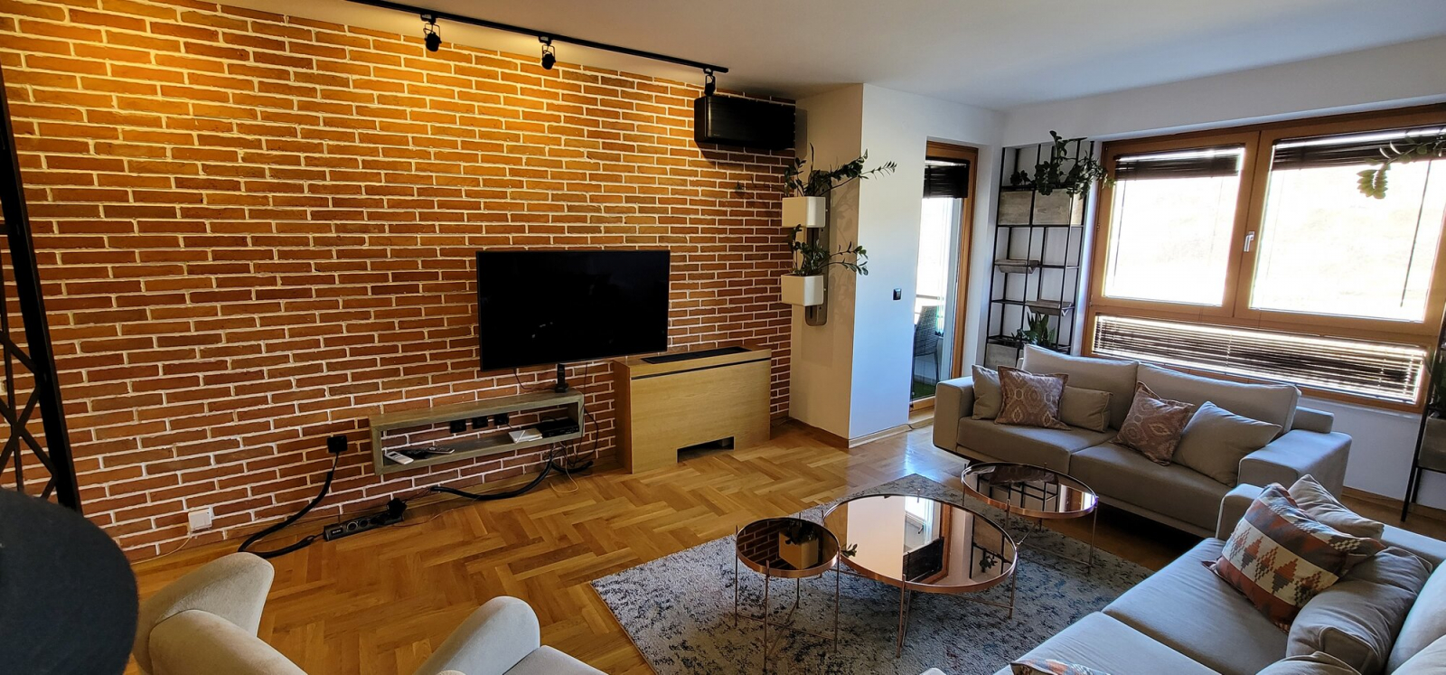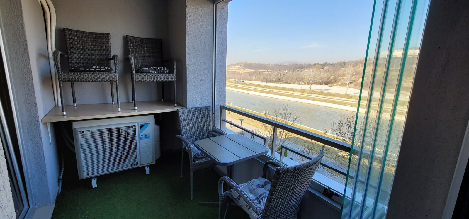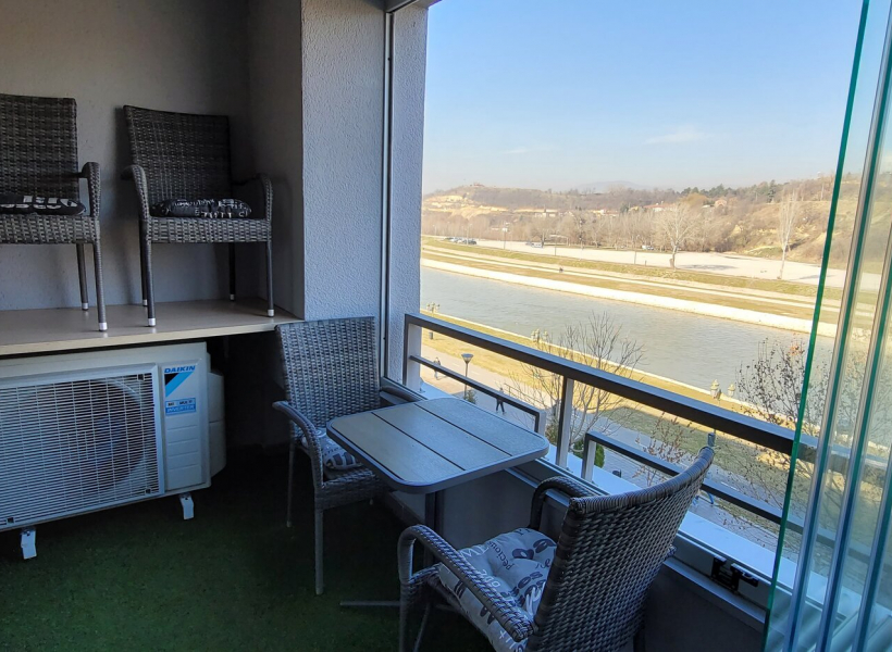 The apartment has 2 bedrooms, a spacious living room and a terrace overlooking Vardar riverside.
