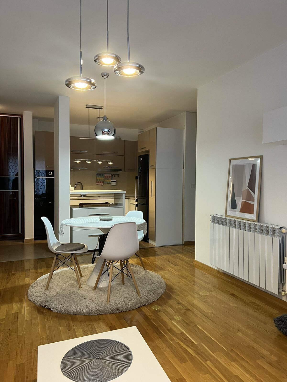 Heating and cooling in the apartment is regulated through central heating and inverter air conditioners.