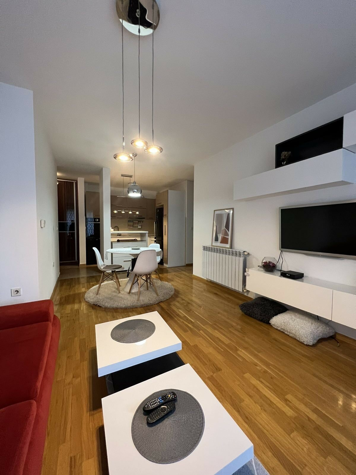 Heating and cooling in the apartment is regulated through central heating and inverter air conditioners.