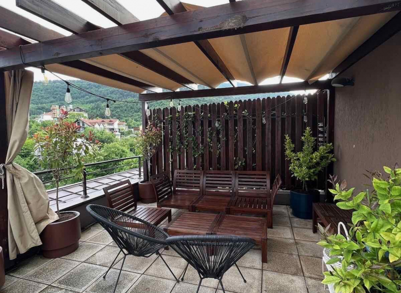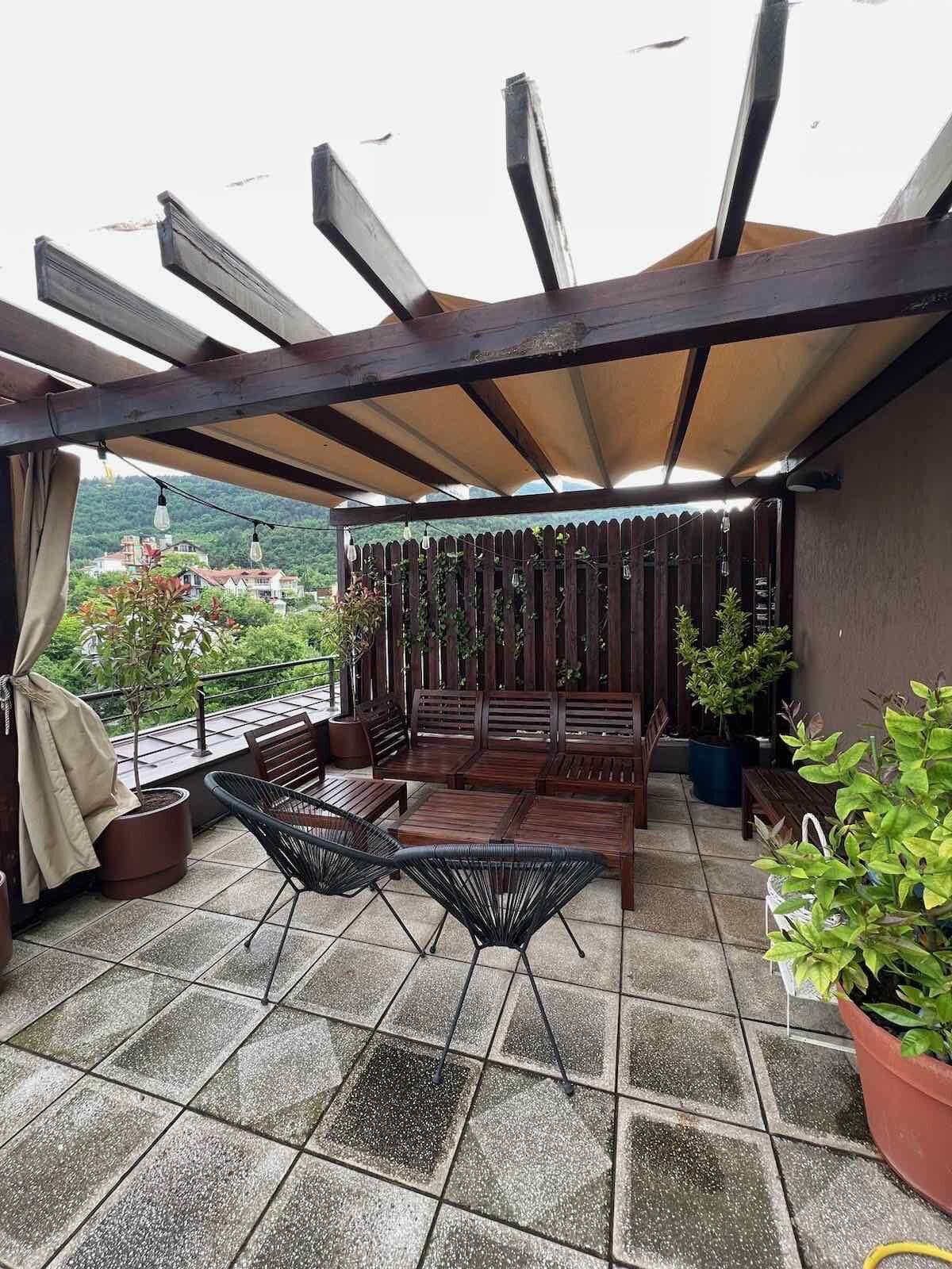 - Roof-top terrace (additional 40m2) furnished with a seating set and a wooden pergola and additional toilet