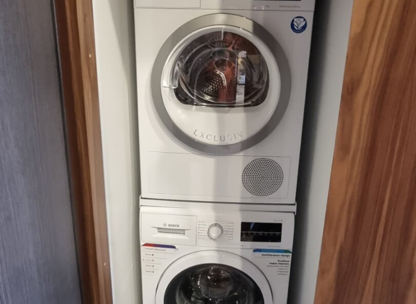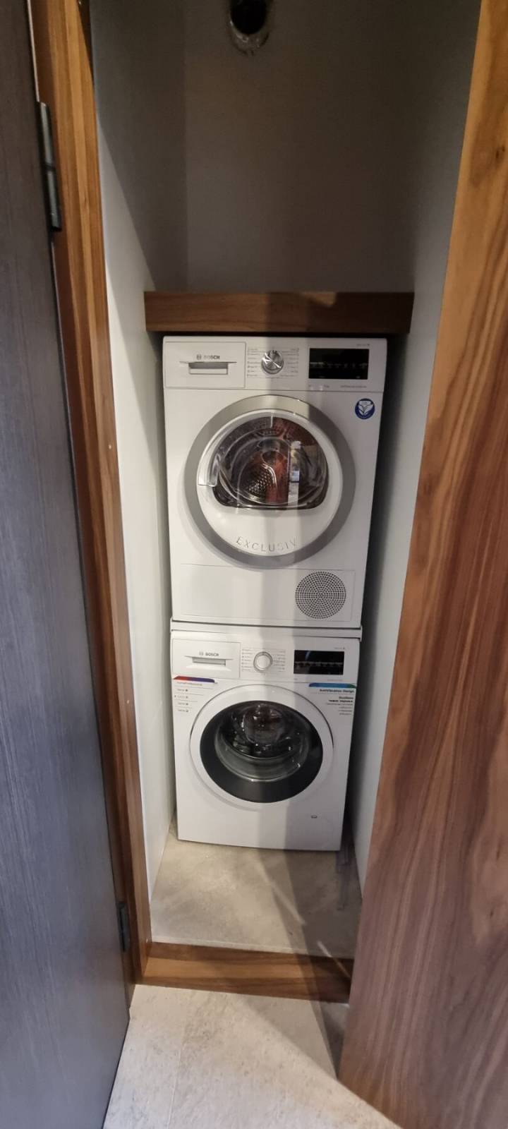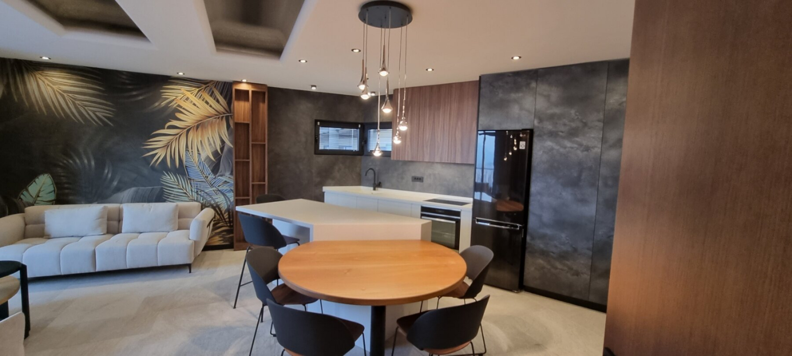 The apartment has a luxuriously equipped living room with beautiful city views, fully equipped kitchen and dining room, two bedrooms, two bathrooms and storage room.