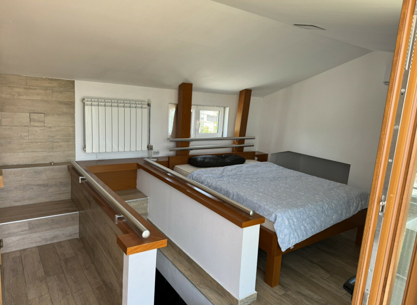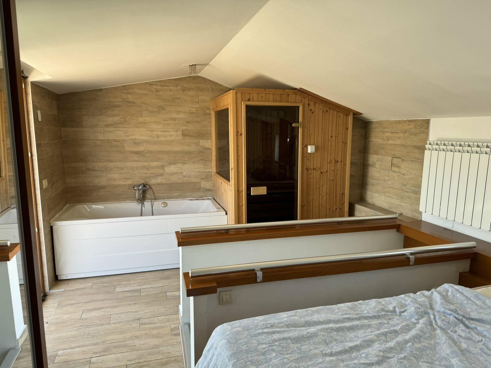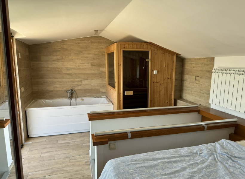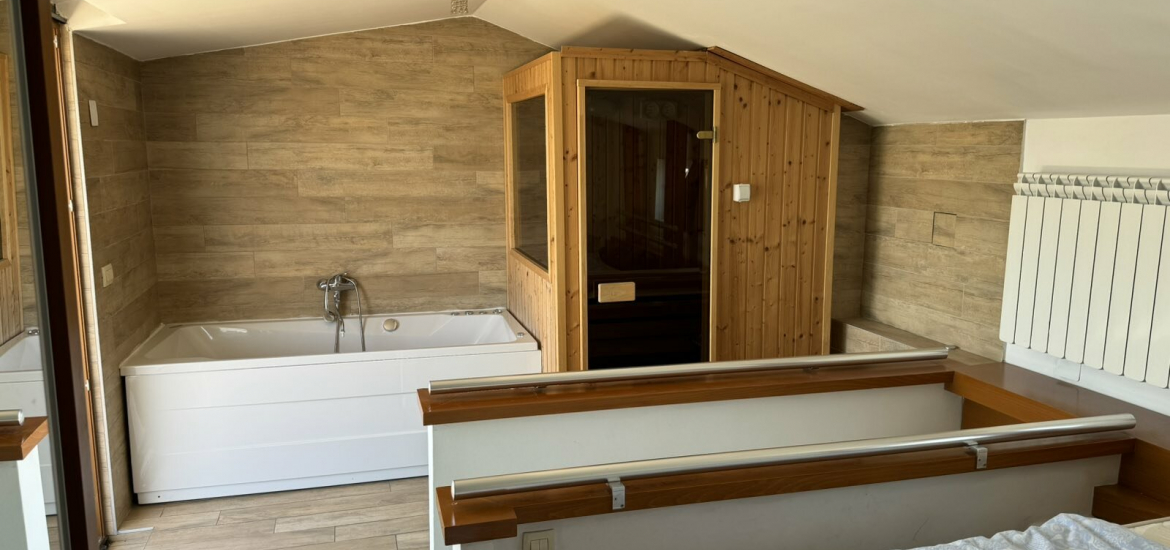 There are internal stairs that lead to the second floor, where the bedroom with a jacuzzi, a sauna and a terrace are located.