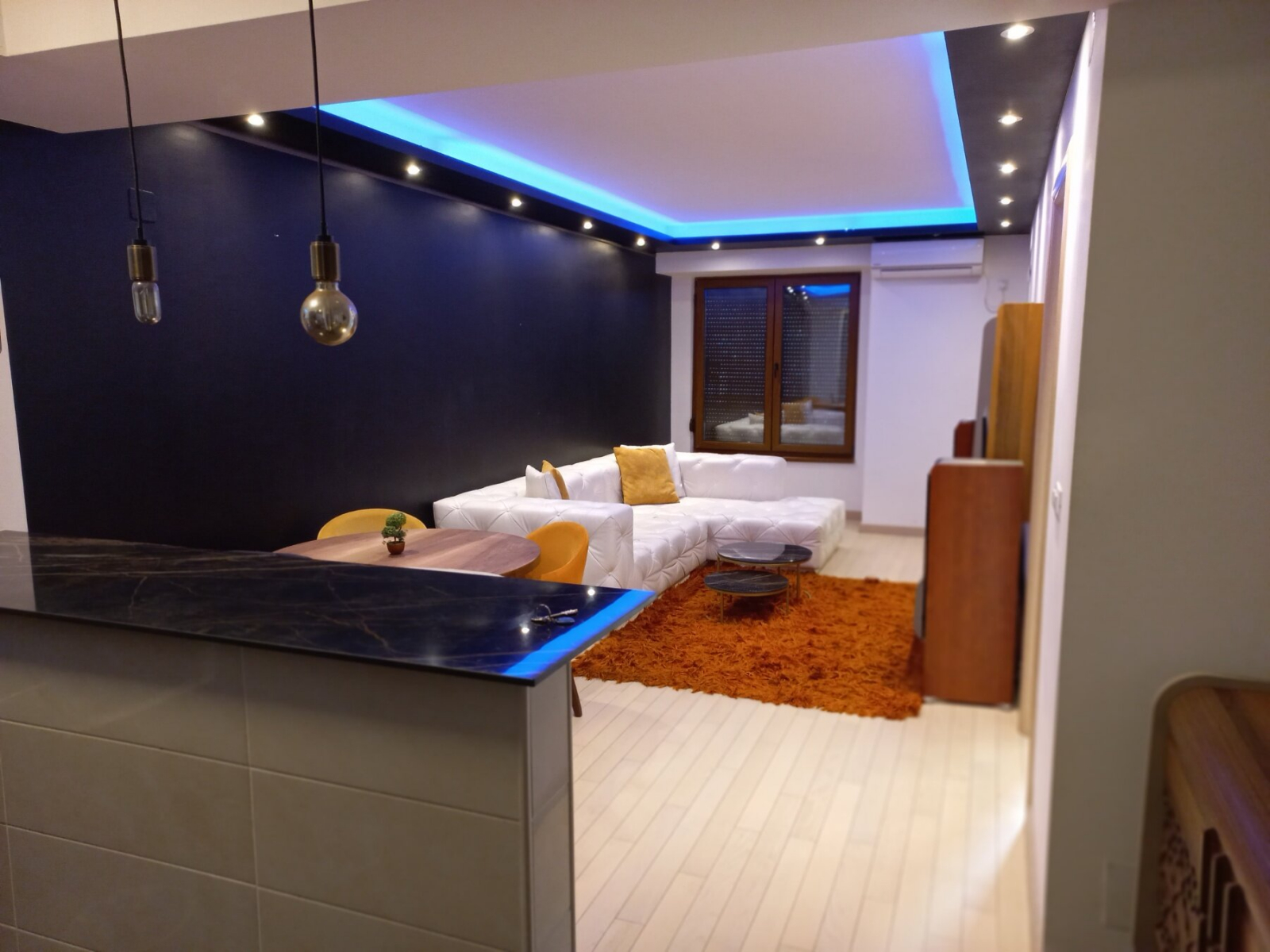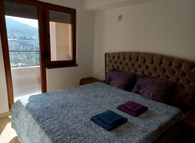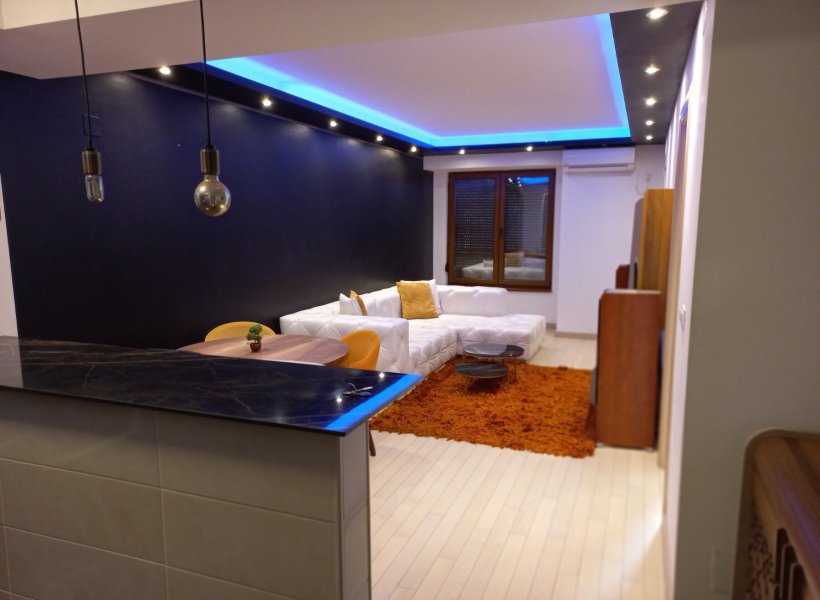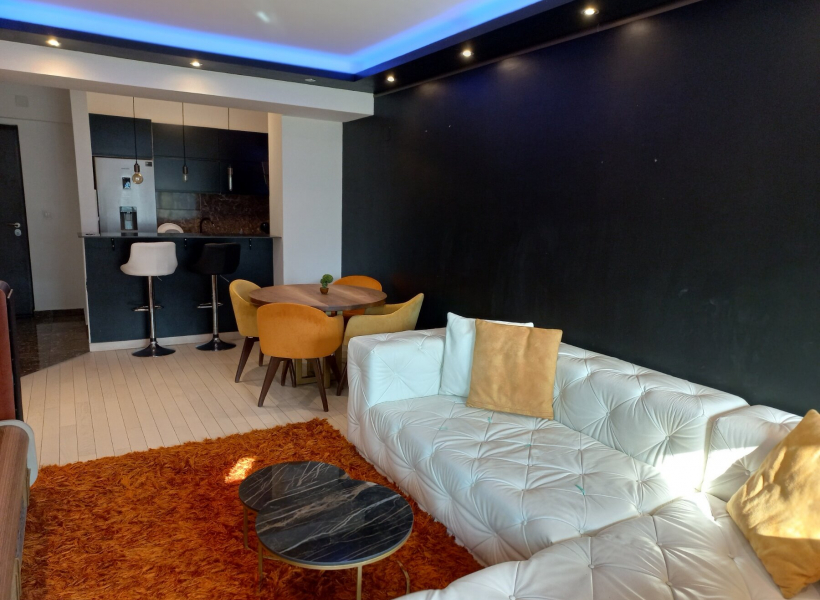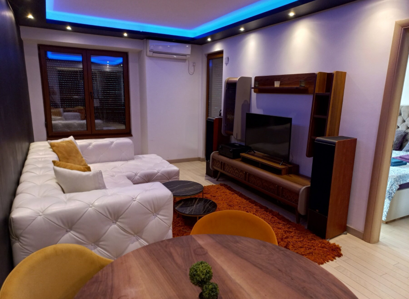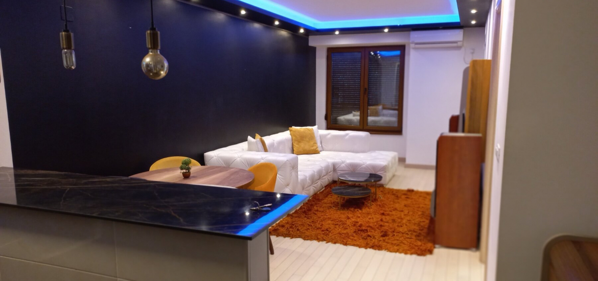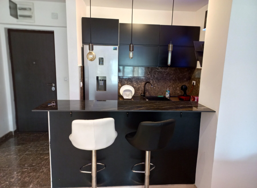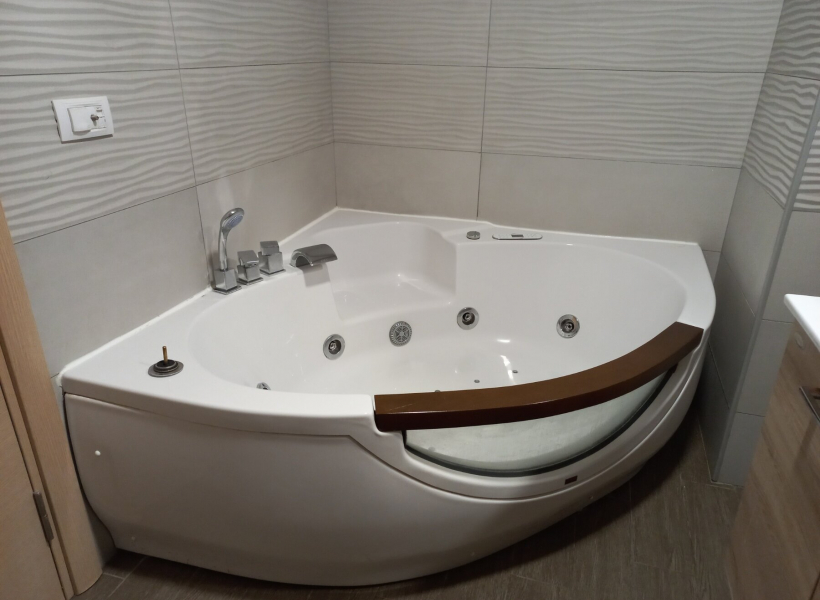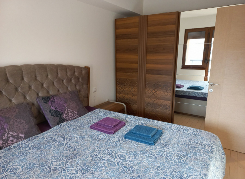 The apartment has one bedroom, living room with dining area, fully equipped kitchen, bathroom with jacuzzi and terrace.