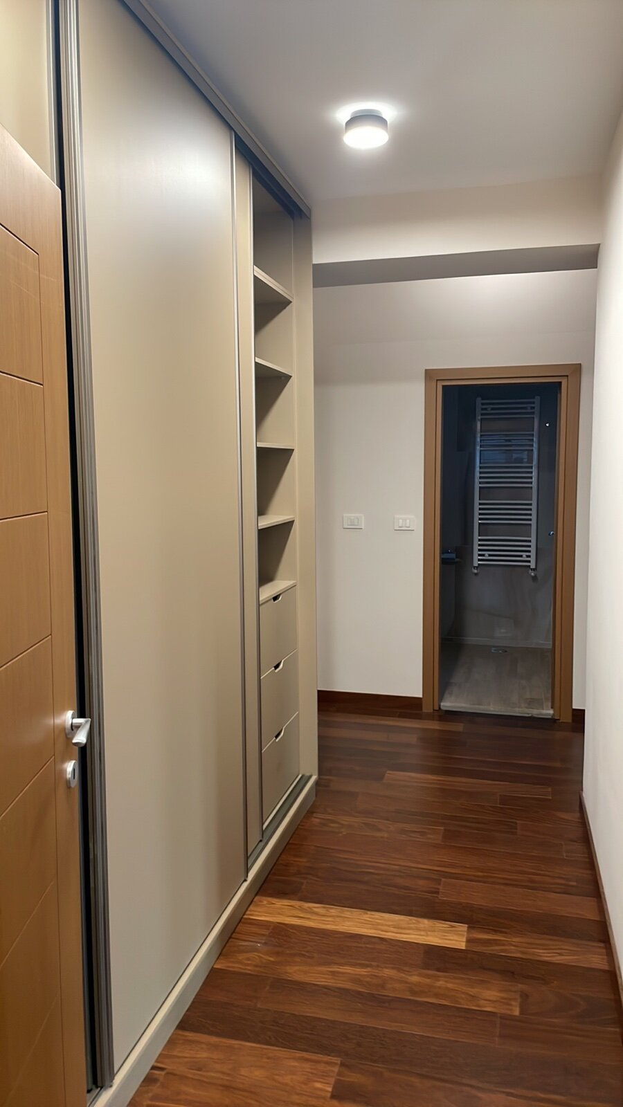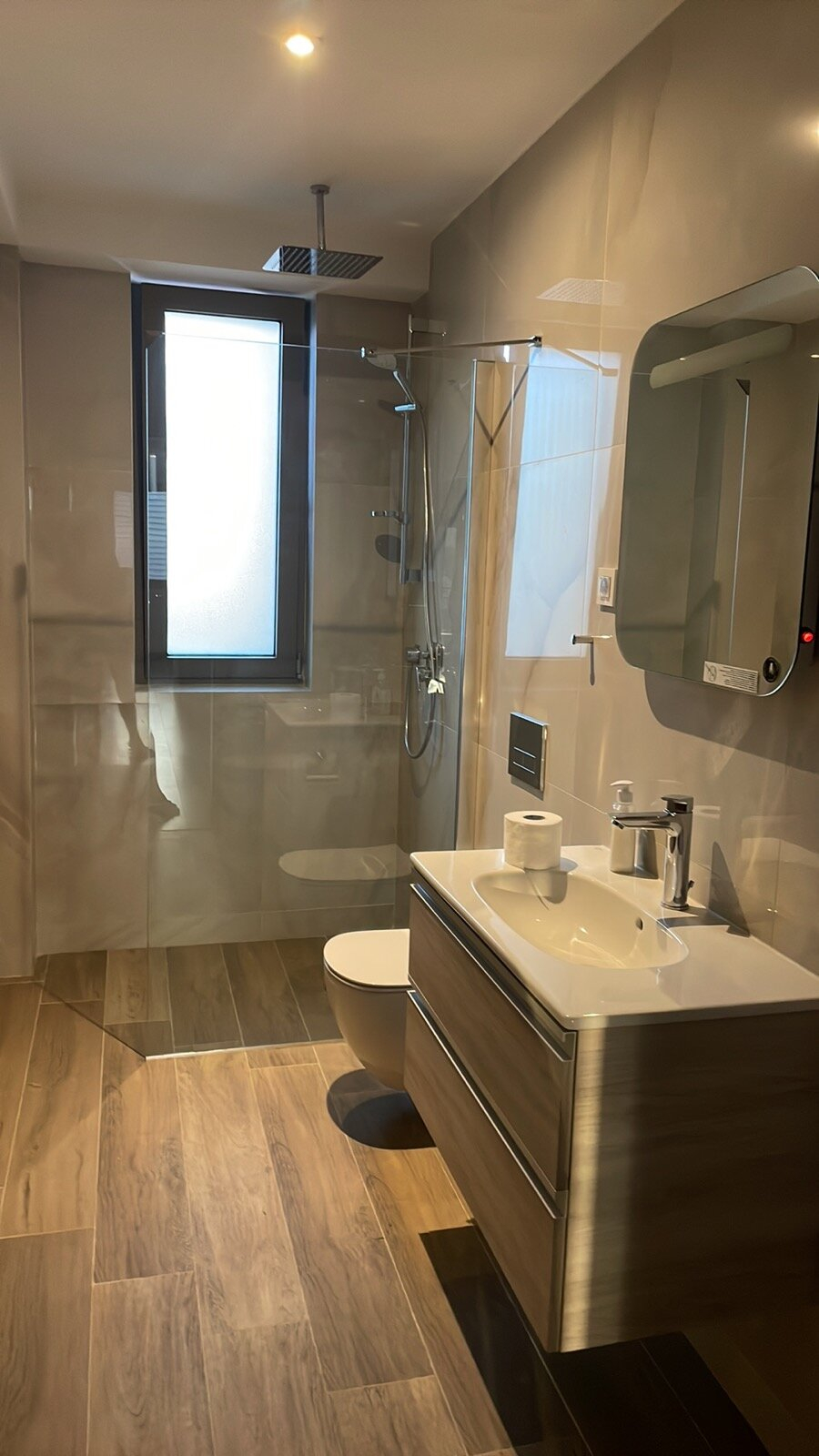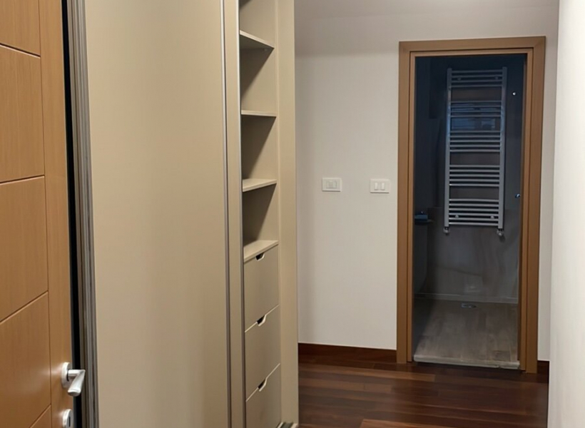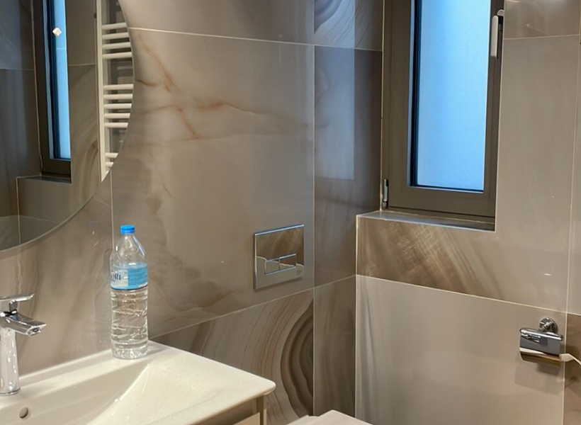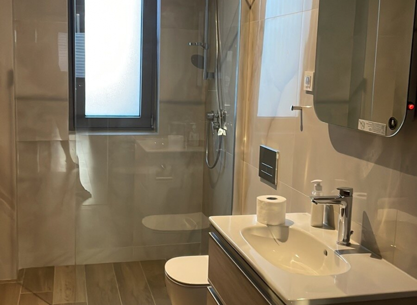 It has three bedrooms, three terraces and two bathrooms in a new building.