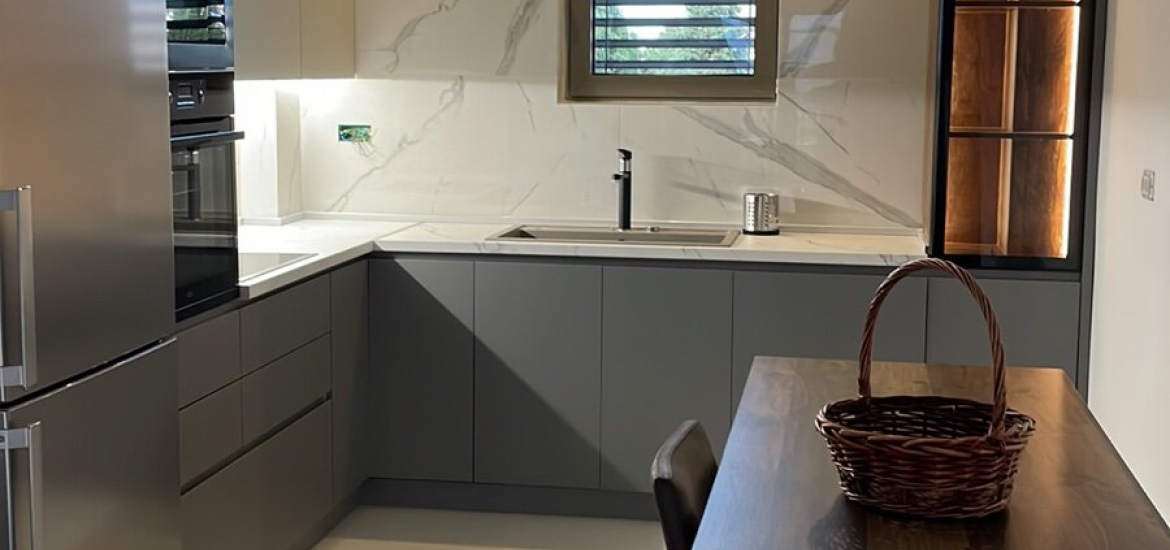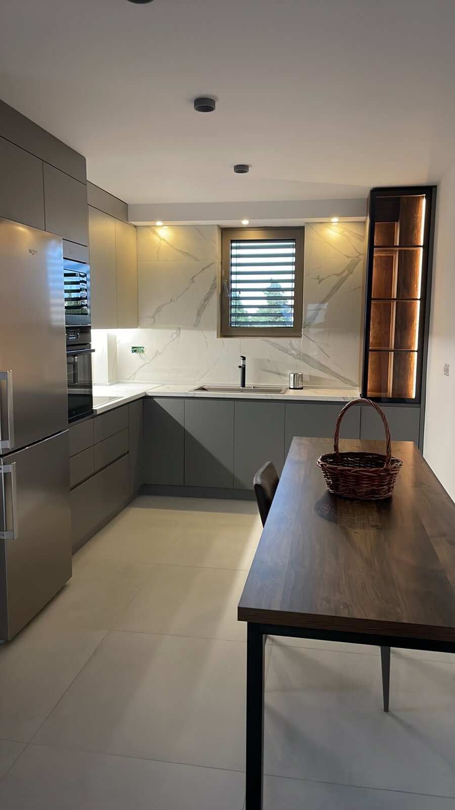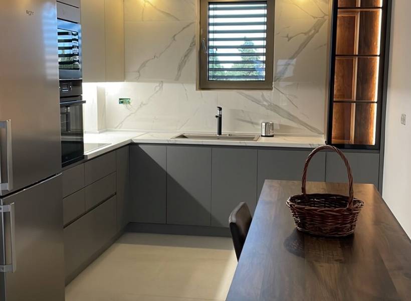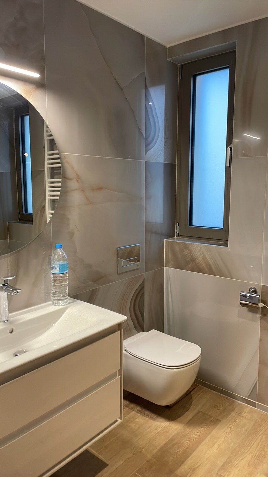 It has three bedrooms, three terraces and two bathrooms in a new building.