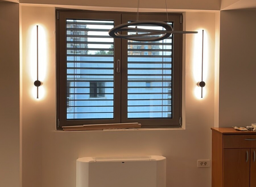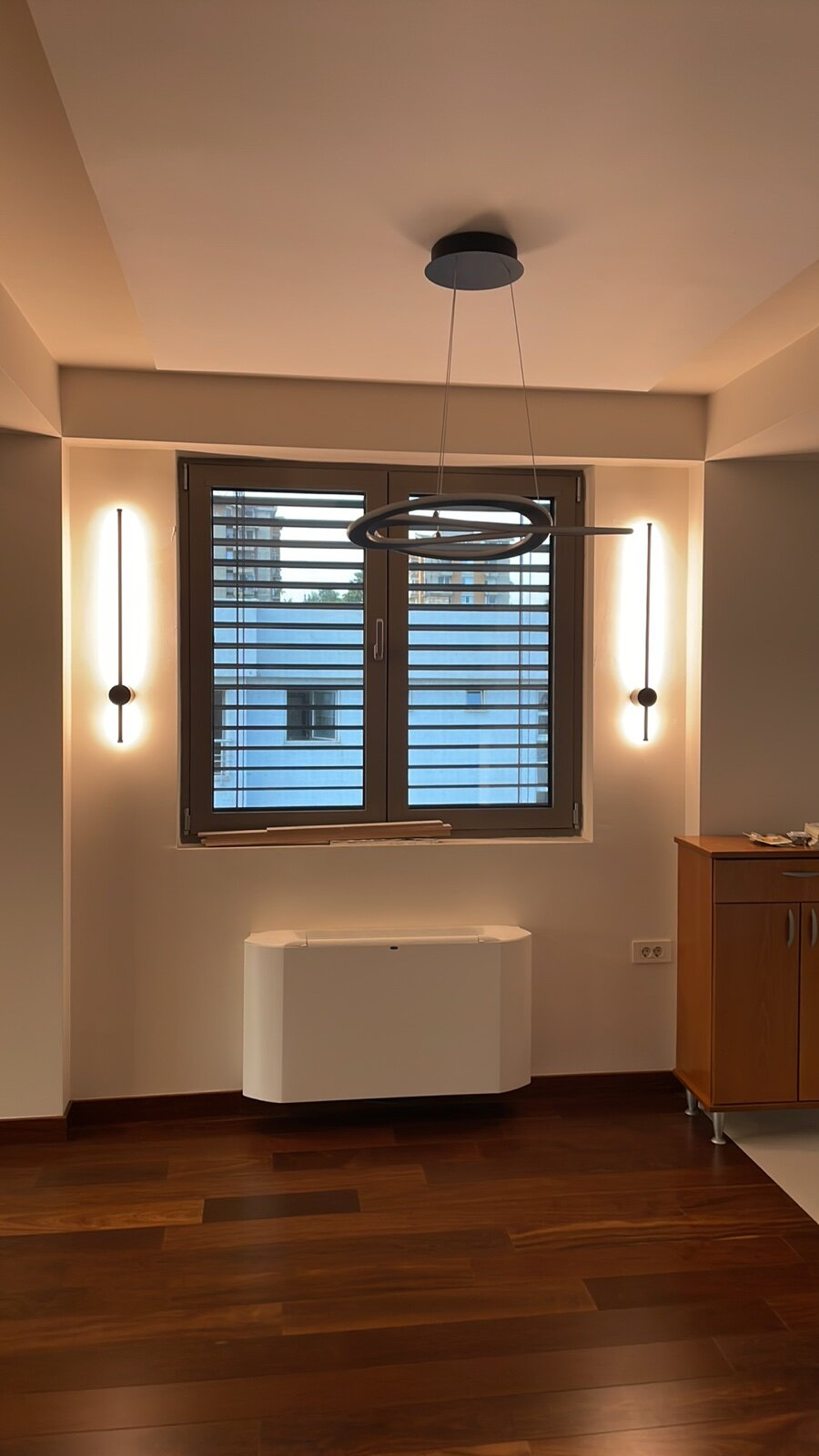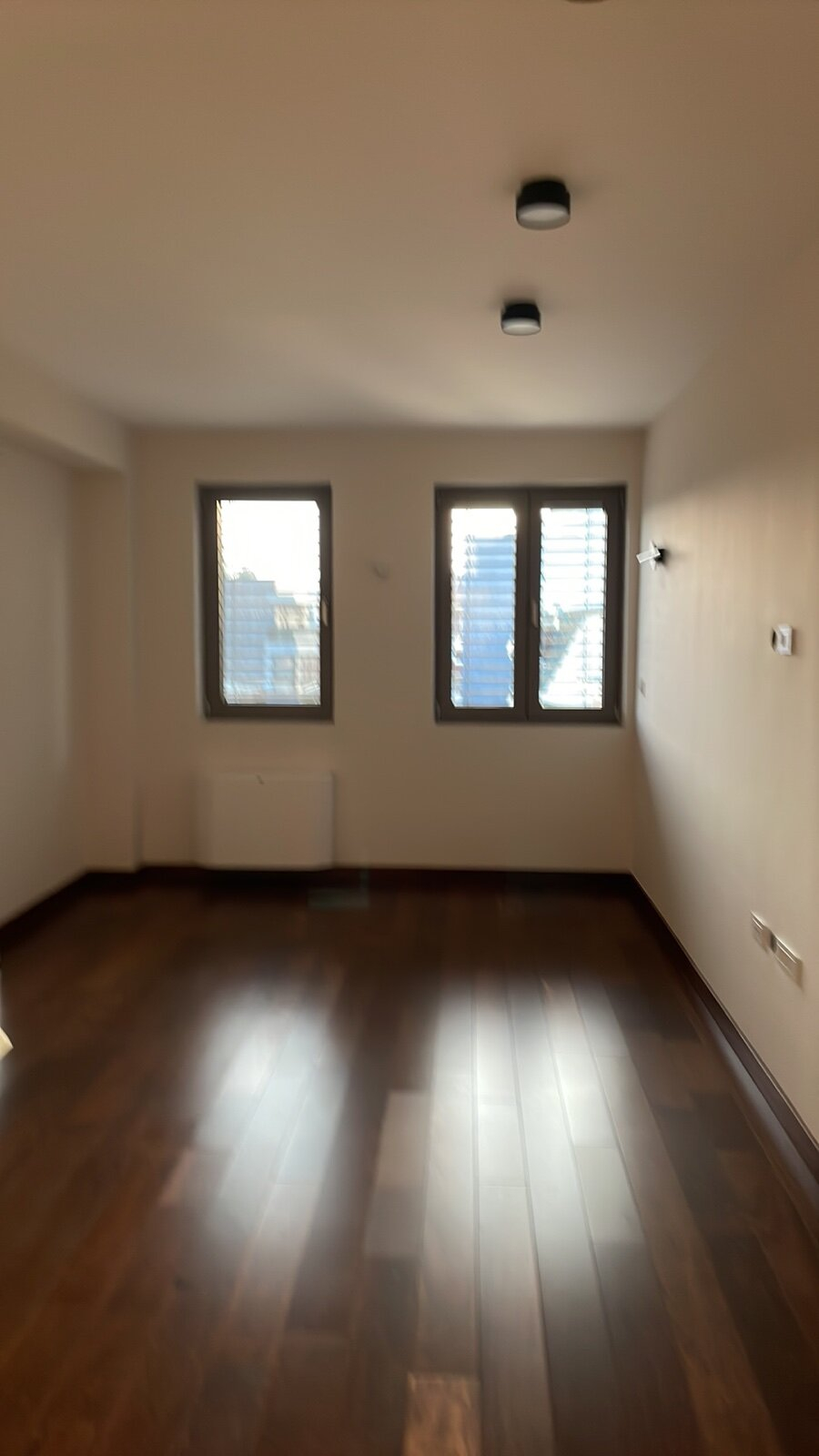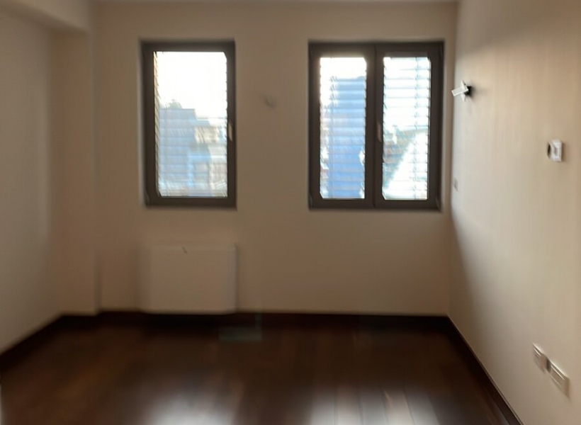 The apartment is located in a building of four apartments, where each floor is a separate apartment that looks out on all four sides and is located on the second floor.