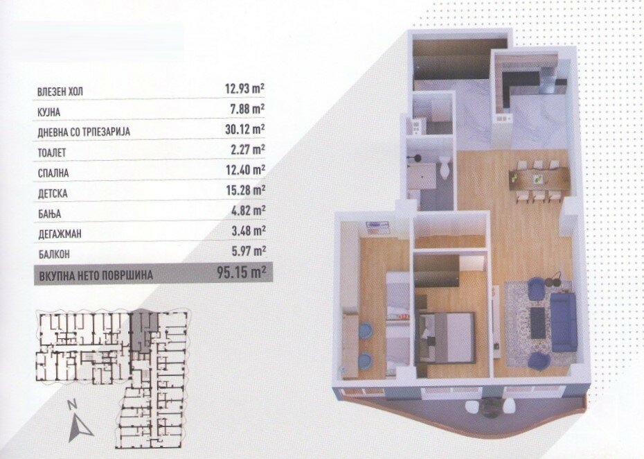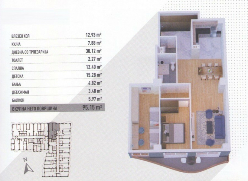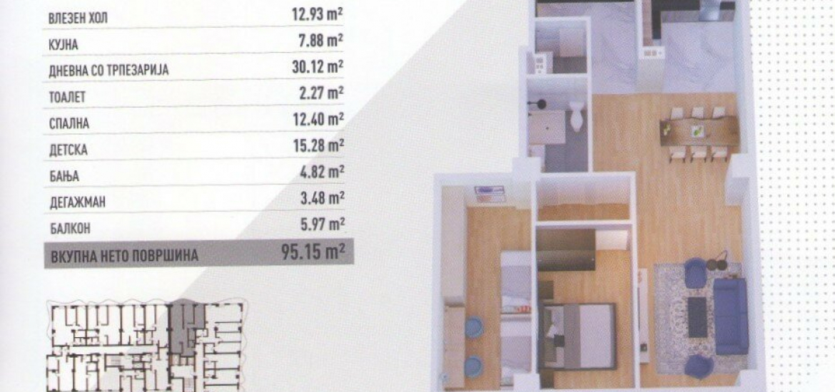 The apartment has a spacious living room, kitchen with dining room, bedroom, children's room, bathroom, pantry and terrace.