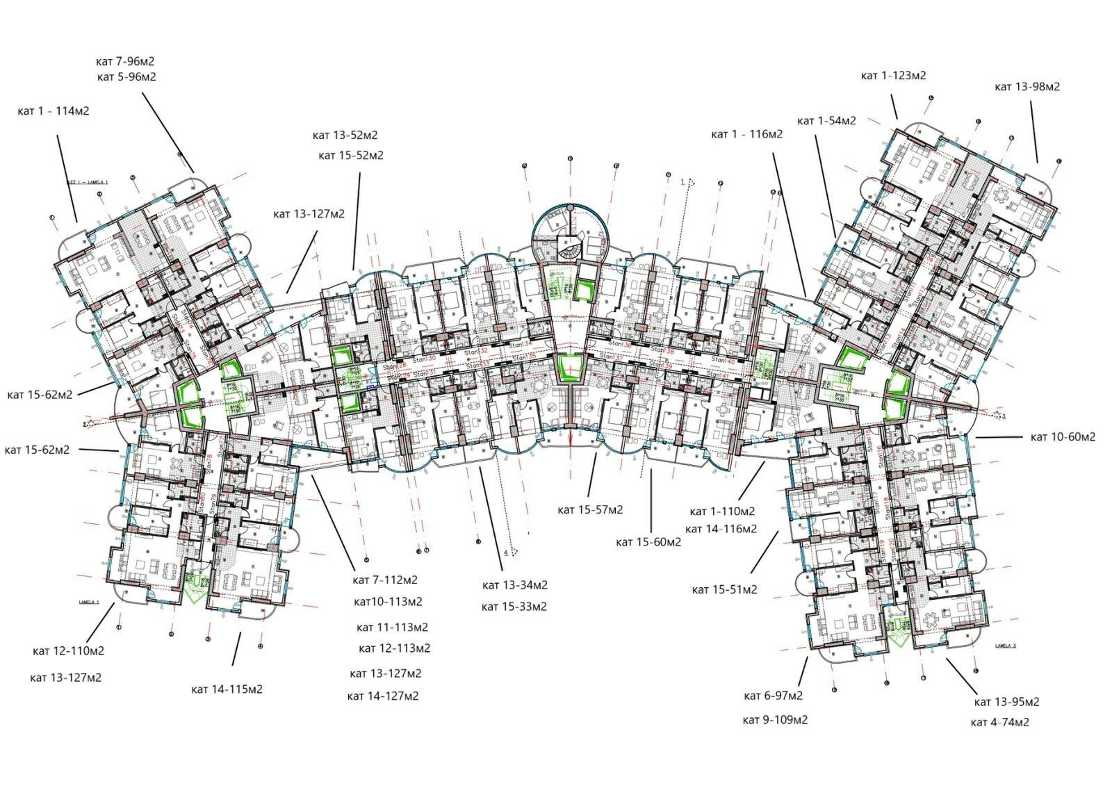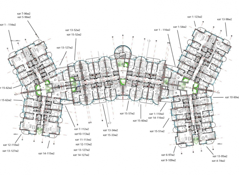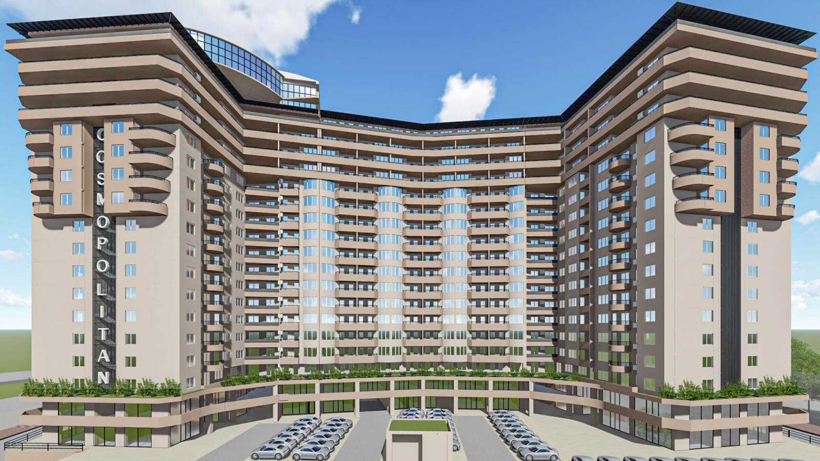 The building has three underground levels that are used as a garage parking, a ground floor and a mezzanine that are intended for business premises, and fourteen floors of residential space with 505 apartments.
