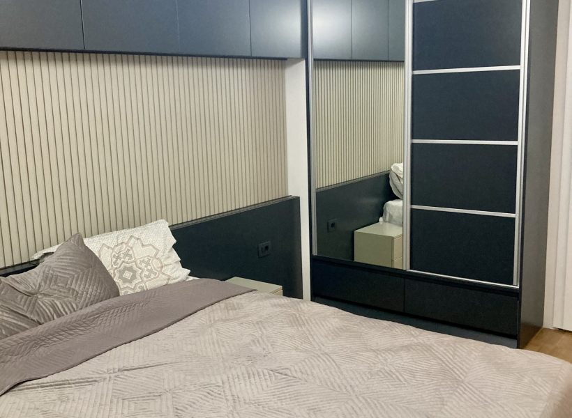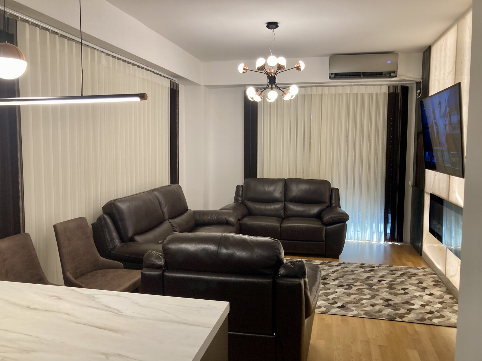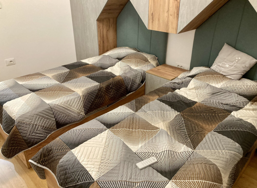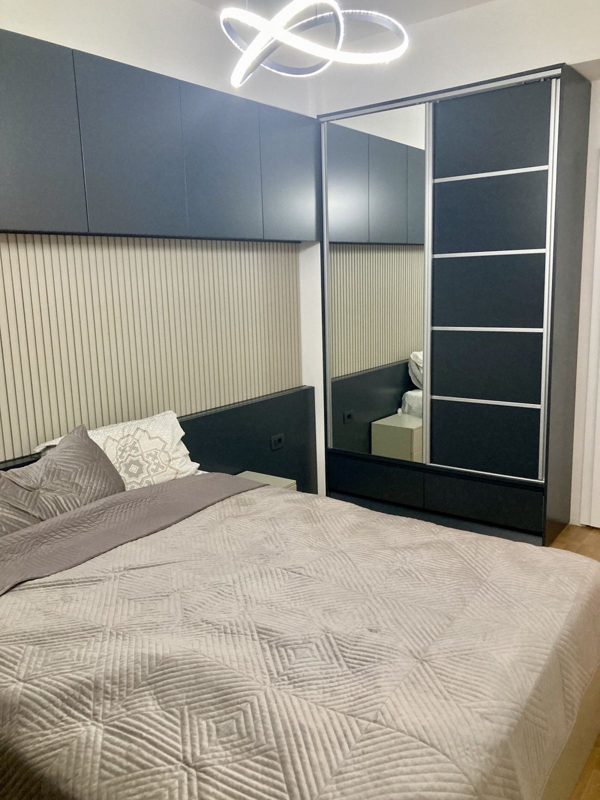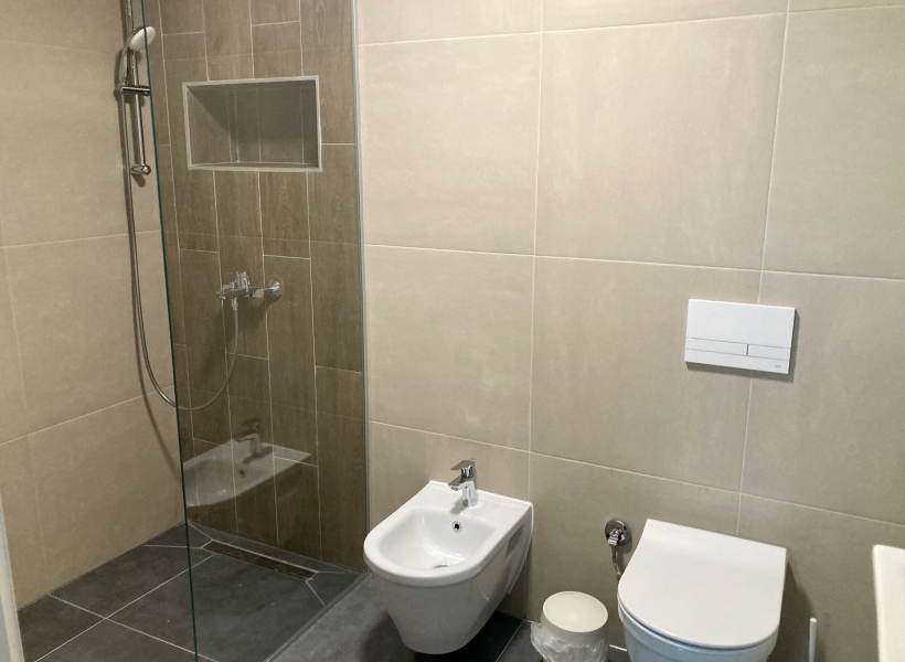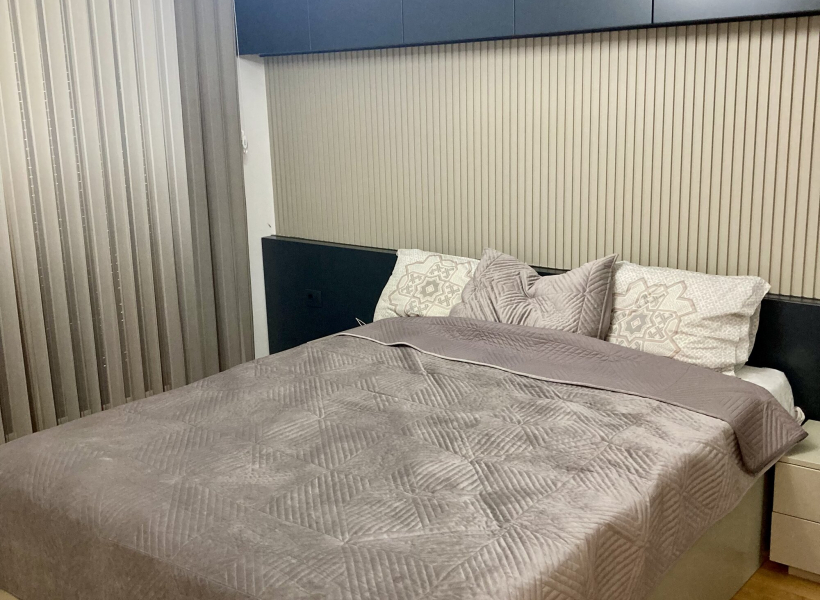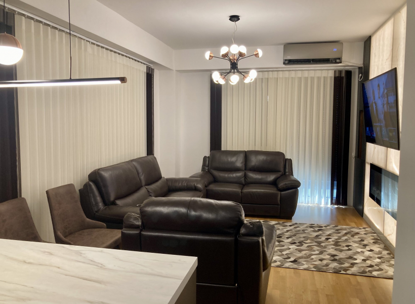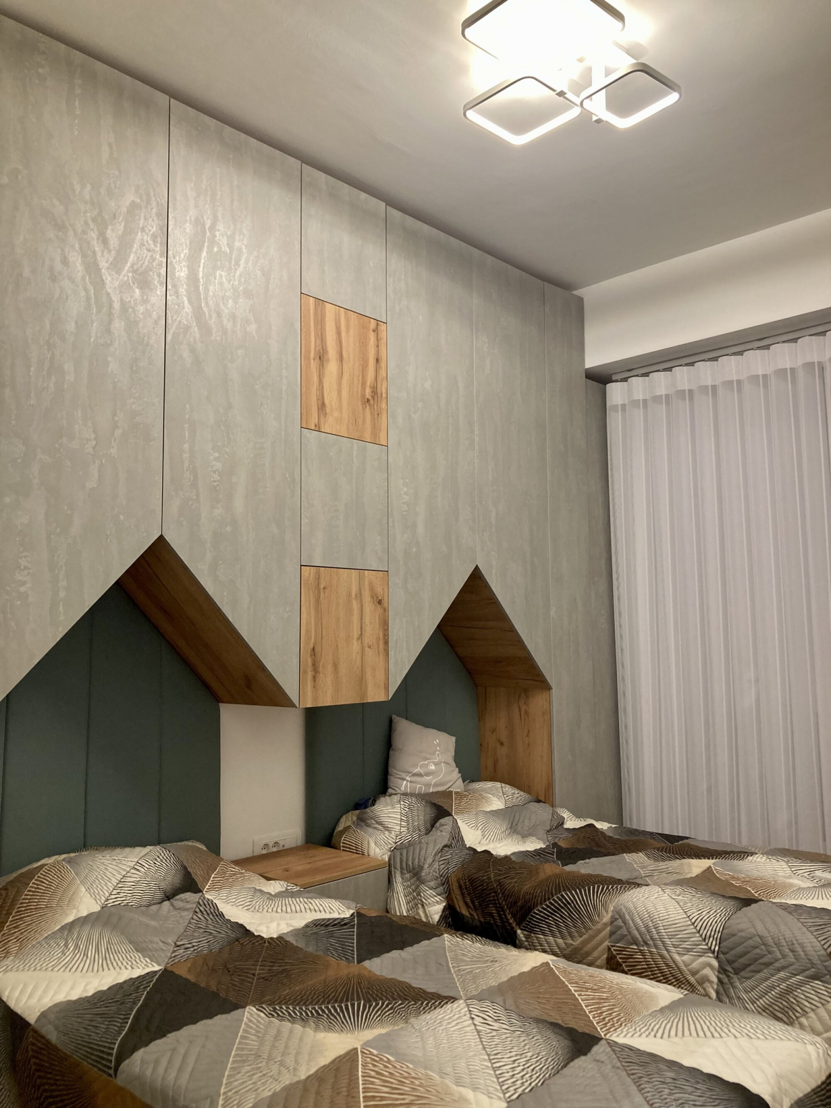 This modern apartment has one bedroom, children's room, comfortable living room with a dining room and a marble bar, as well as two bathrooms with showers and a pantry.
