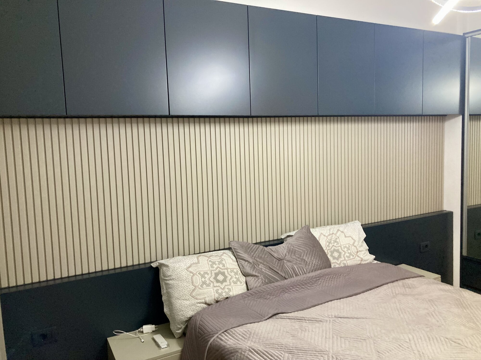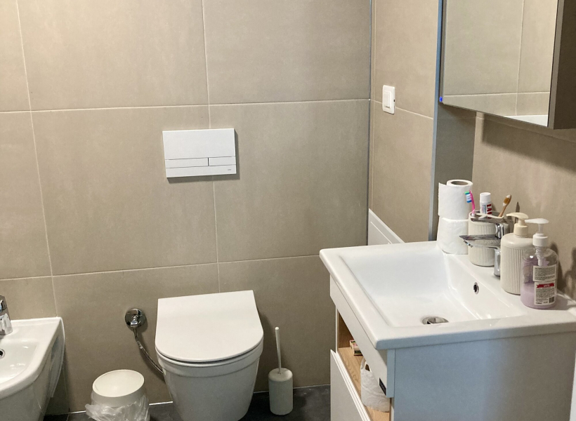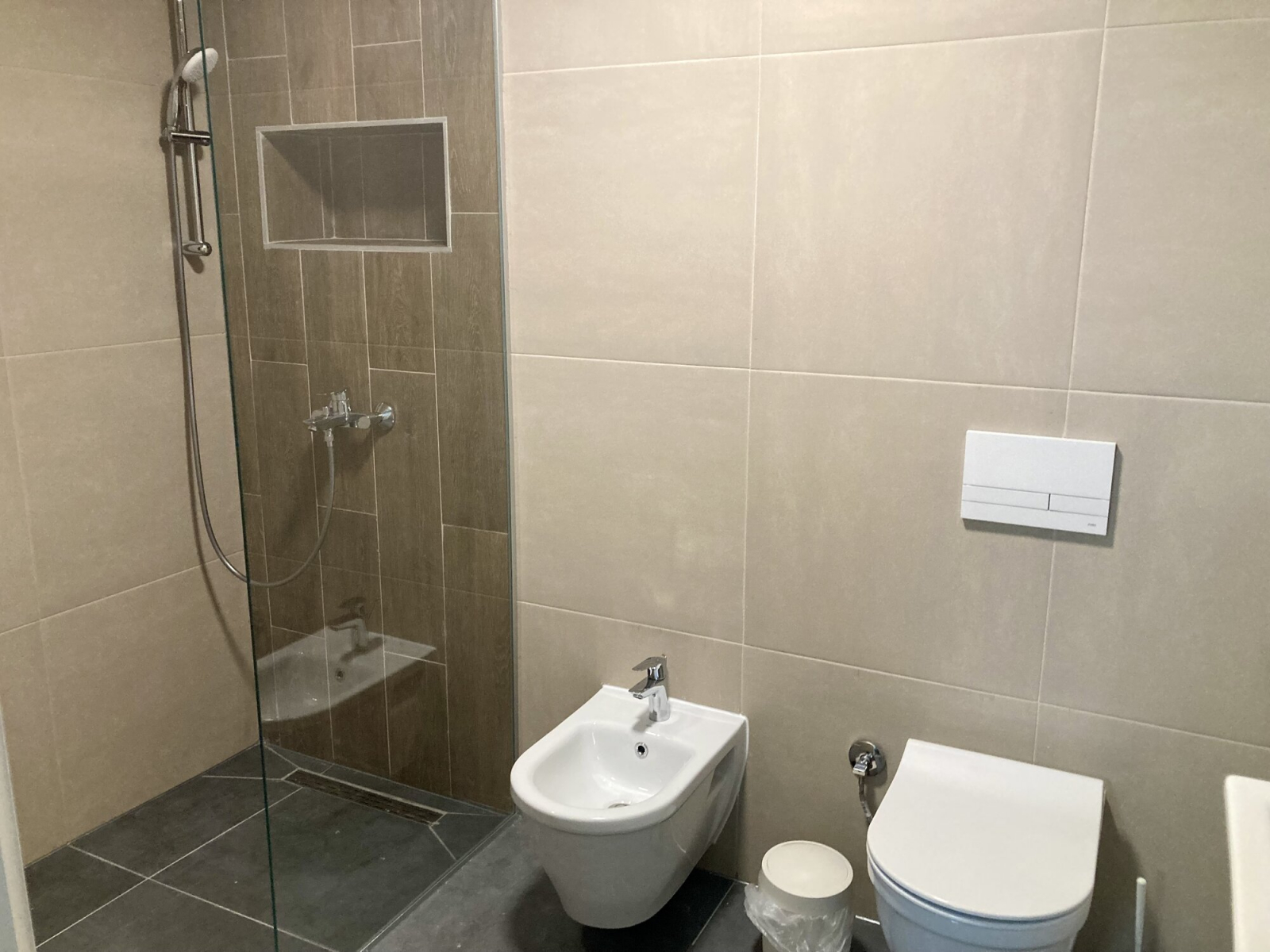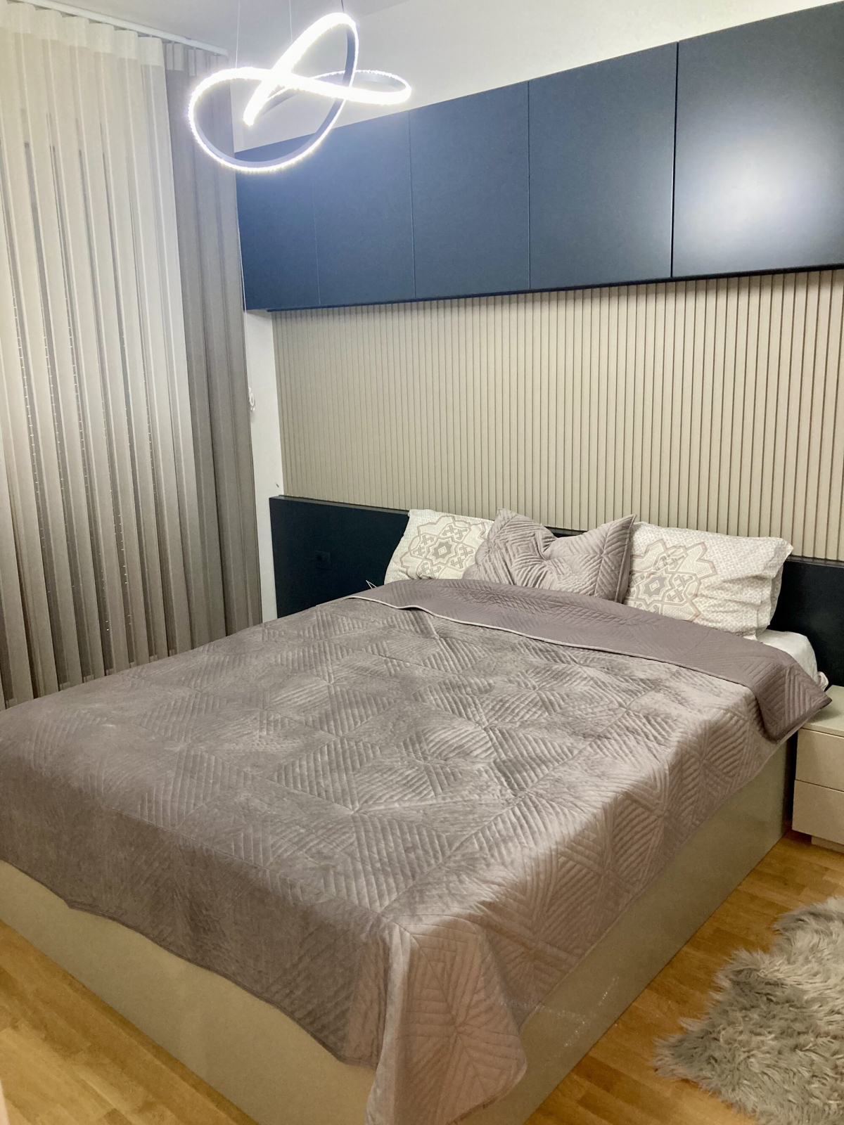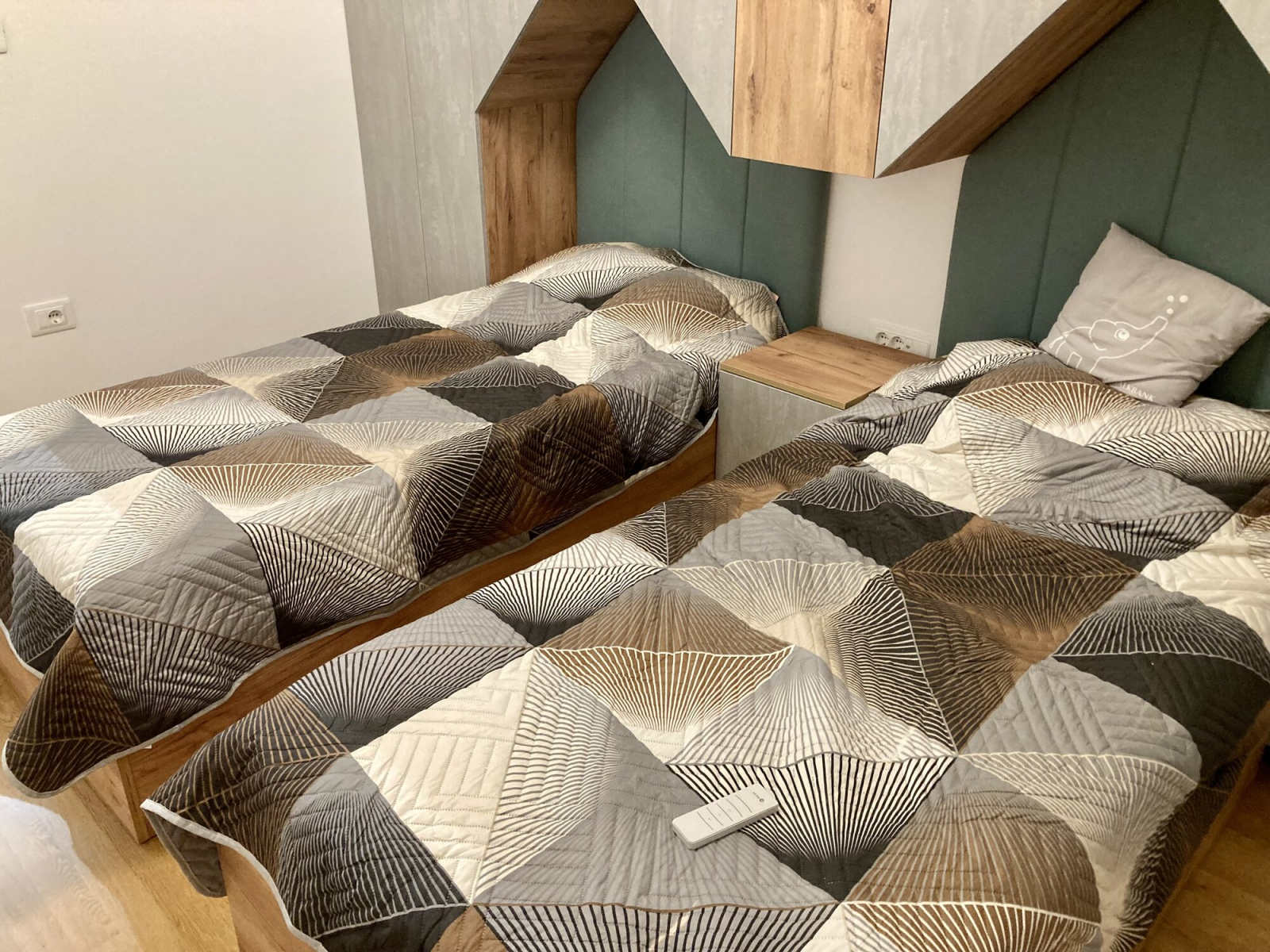 This modern apartment has one bedroom, children's room, comfortable living room with a dining room and a marble bar, as well as two bathrooms with showers and a pantry.