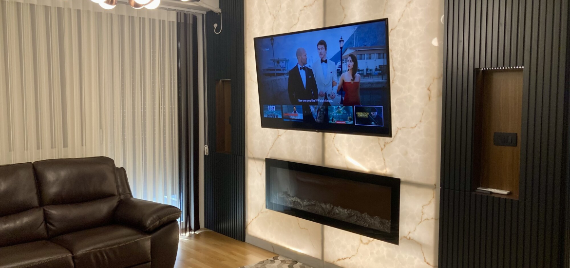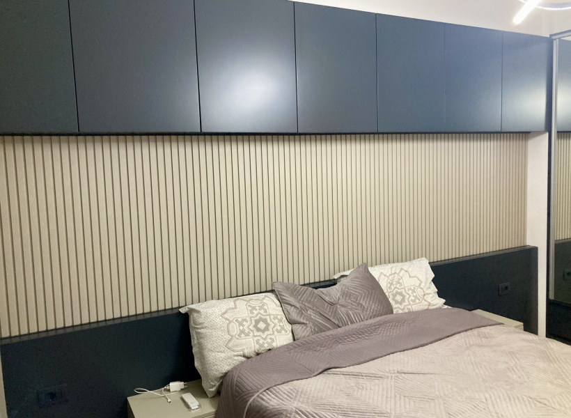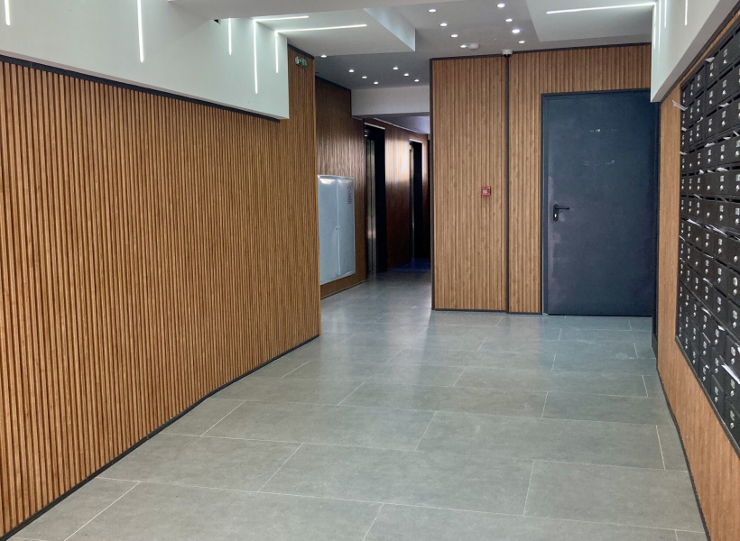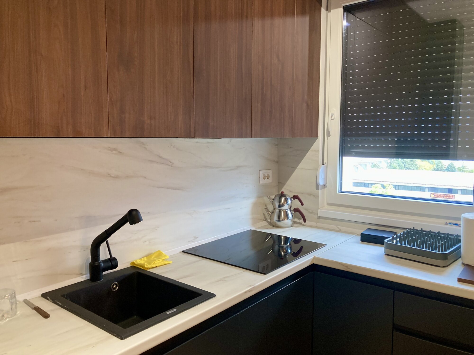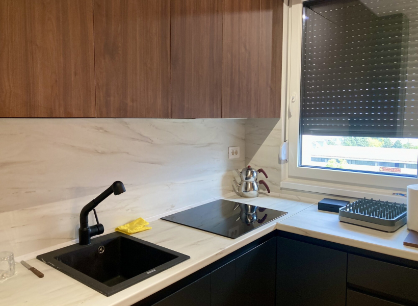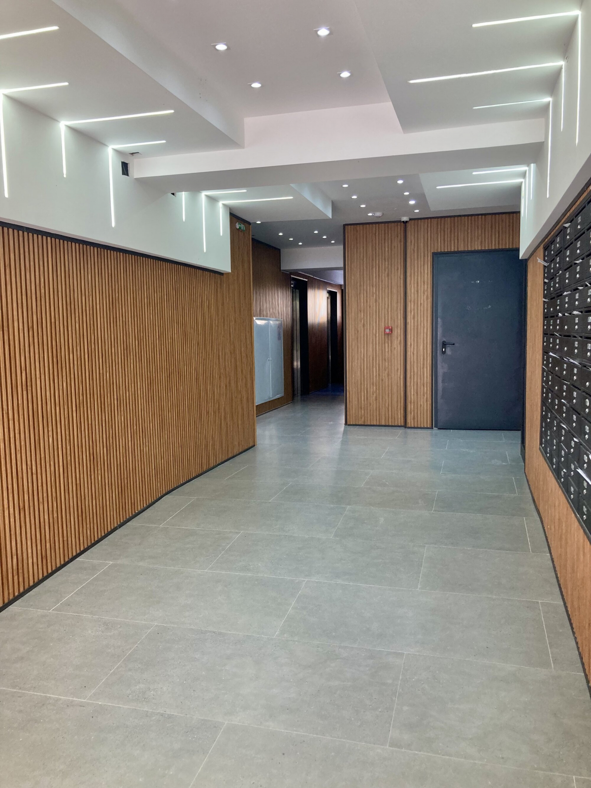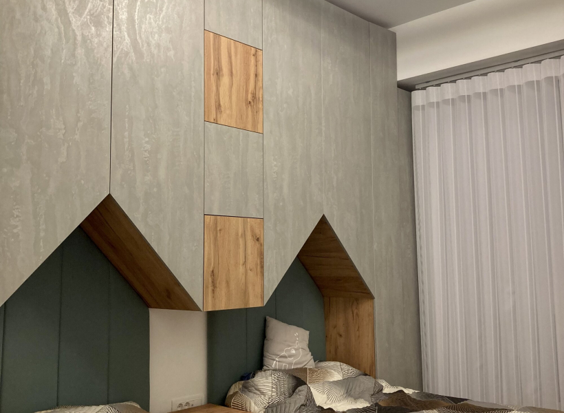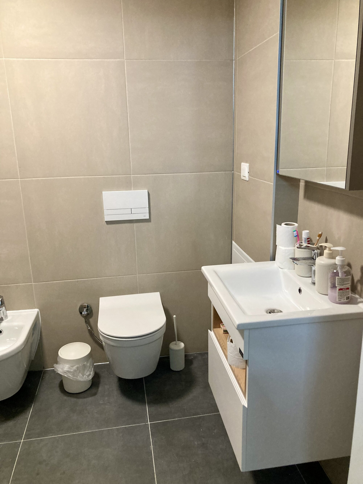 This modern apartment has one bedroom, children's room, comfortable living room with a dining room and a marble bar, as well as two bathrooms with showers and a pantry.