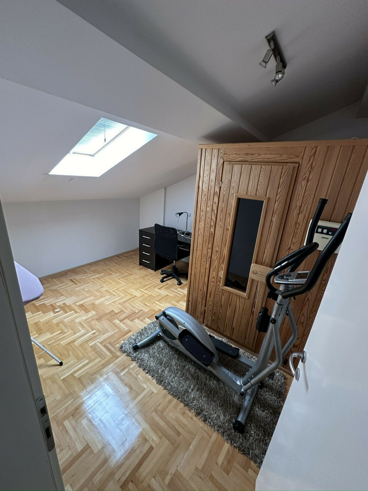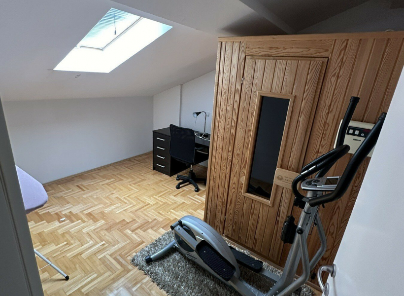 The apartment has a living room, a kitchen and a dining room, a separate room equipped with a fitness room and a sauna for relaxation, two bathrooms, a guest toilet and a terrace with a city view.