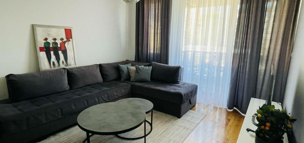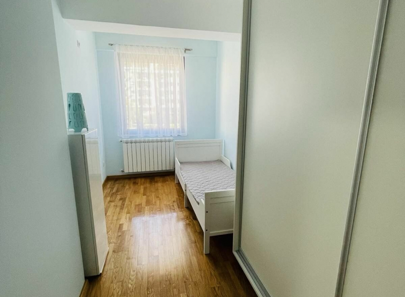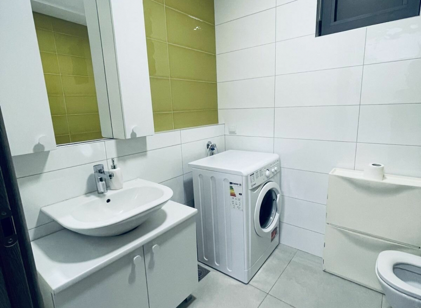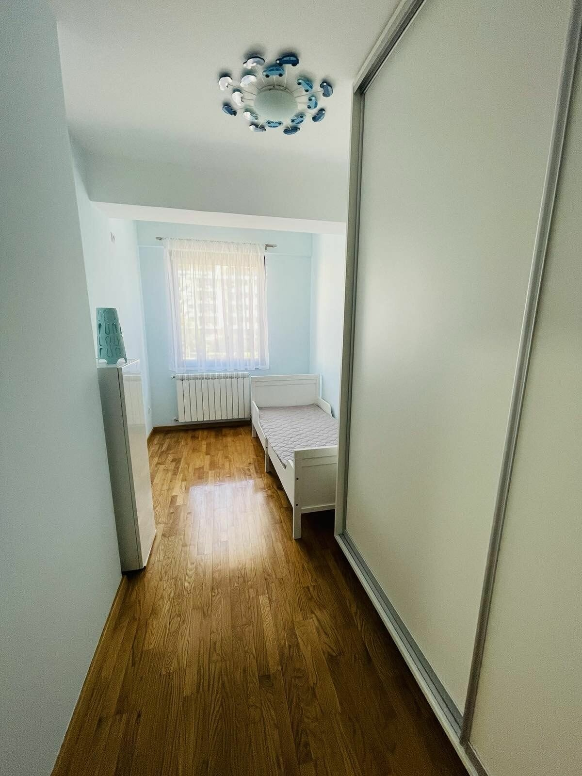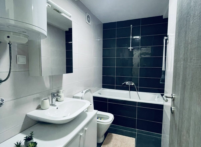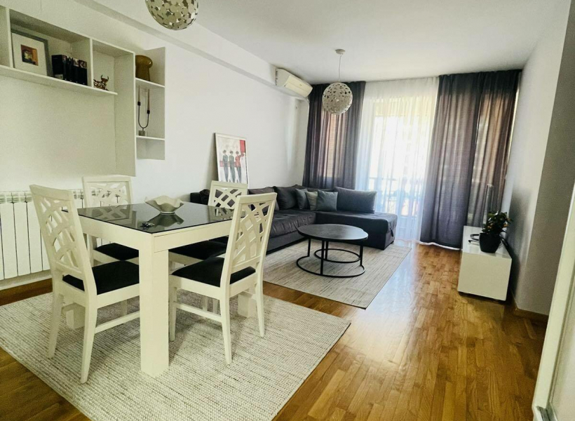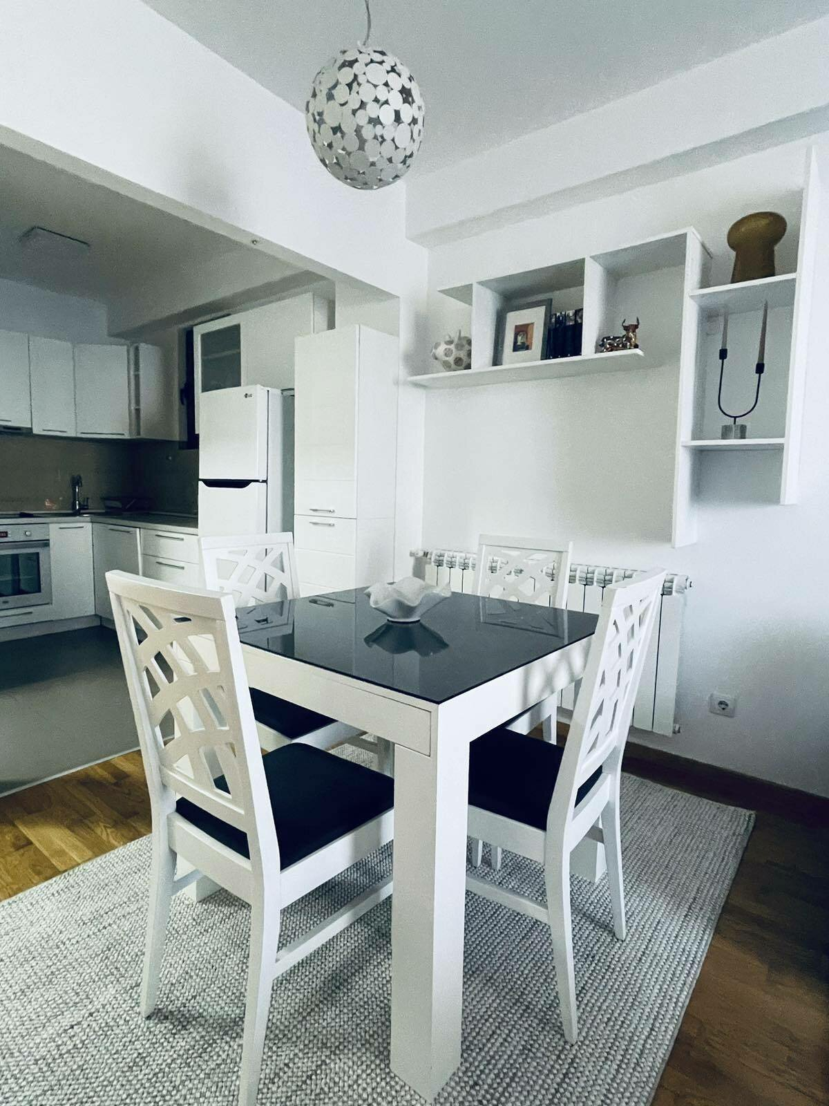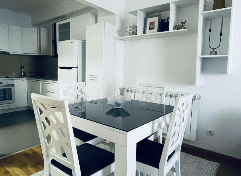 The apartment is located on the first floor and has one living room, a kitchen and a dining room, two bedrooms, a bathroom, a guest toilet and a terrace.