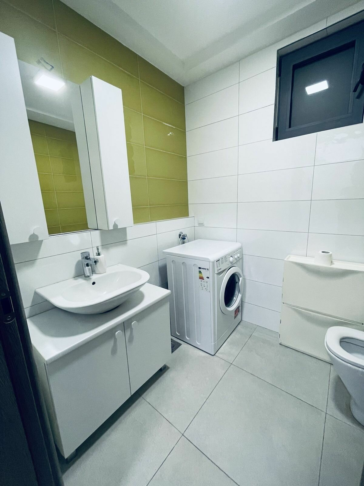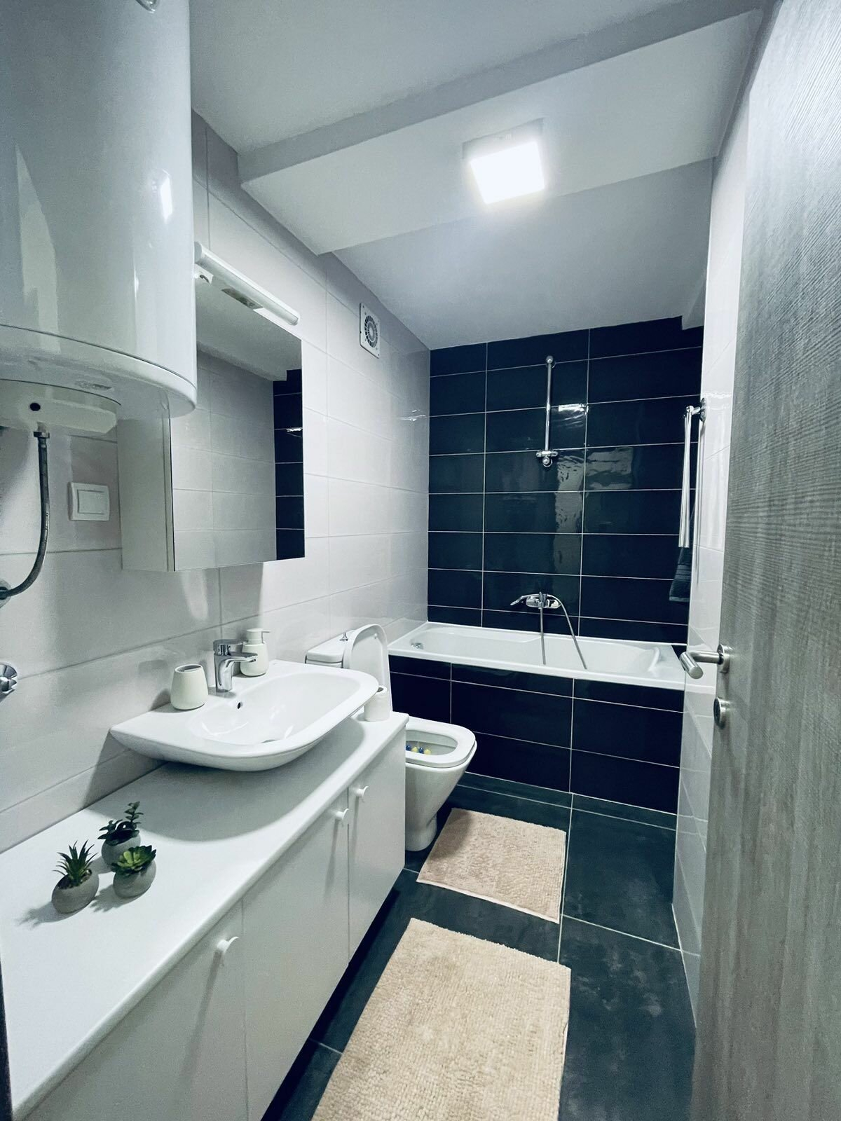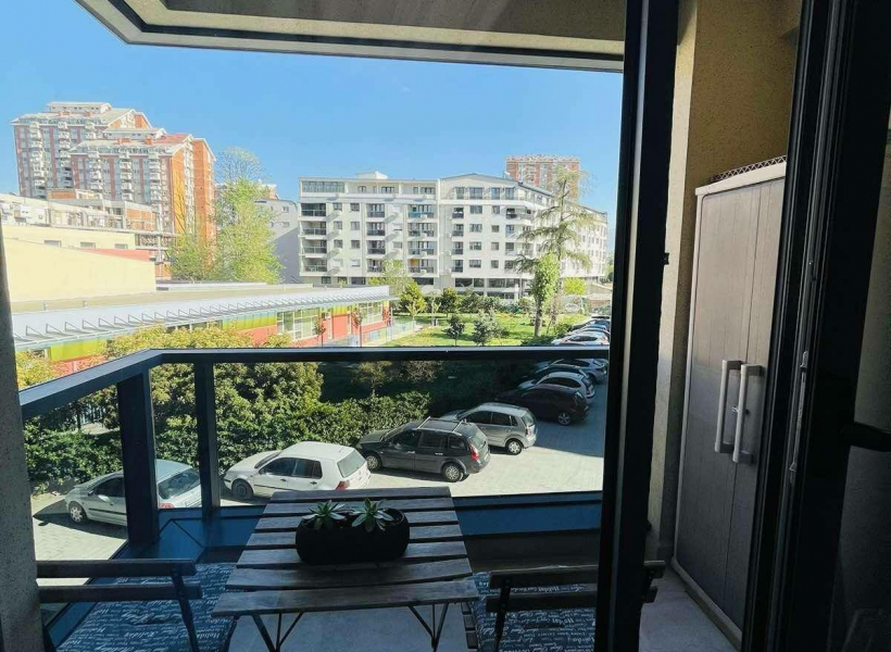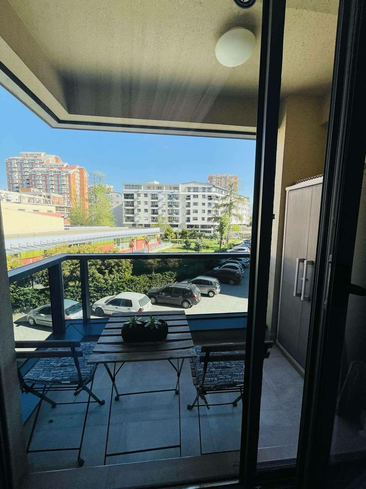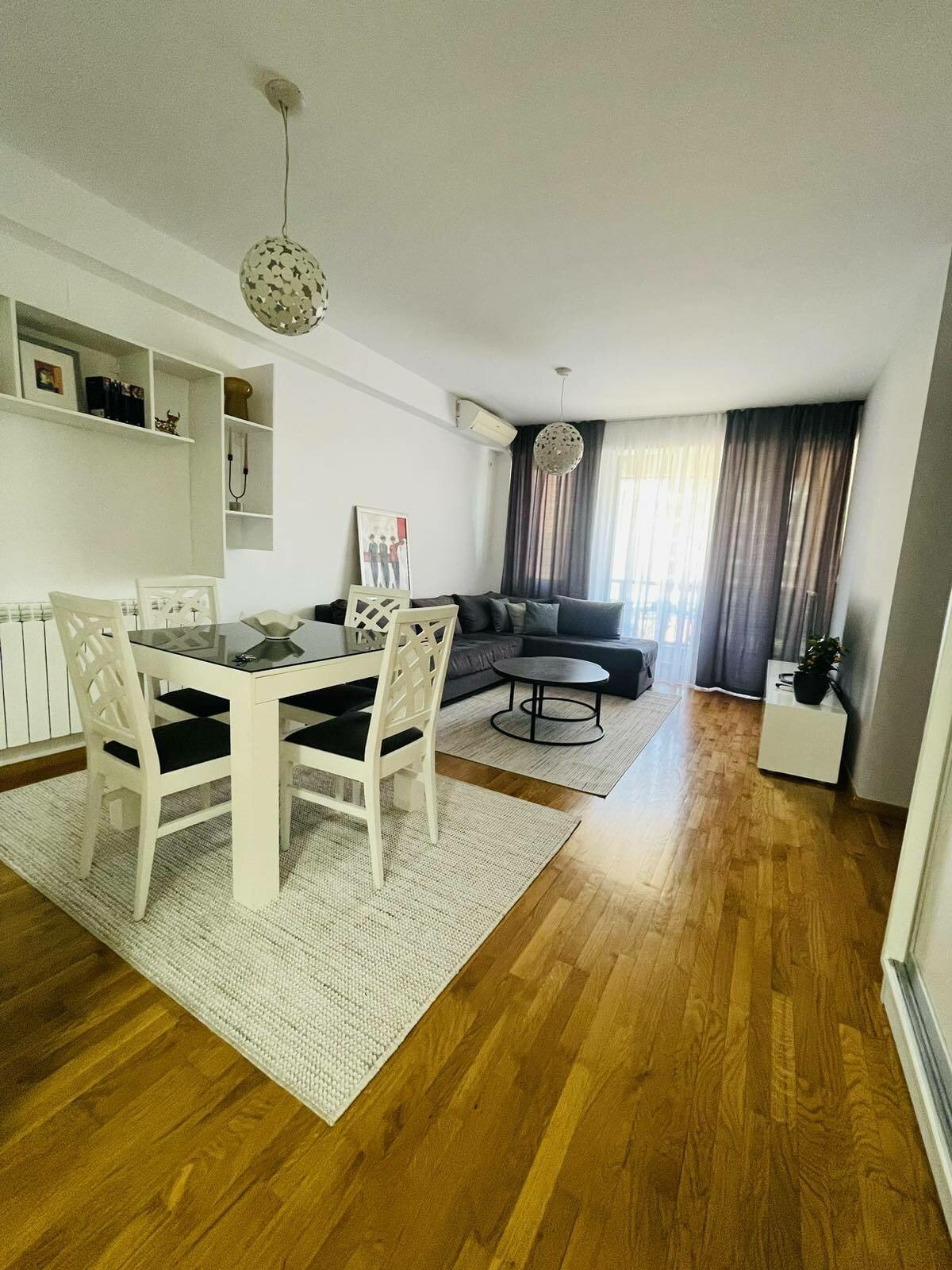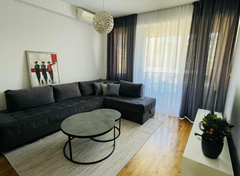 The apartment is located on the first floor and has one living room, a kitchen and a dining room, two bedrooms, a bathroom, a guest toilet and a terrace.