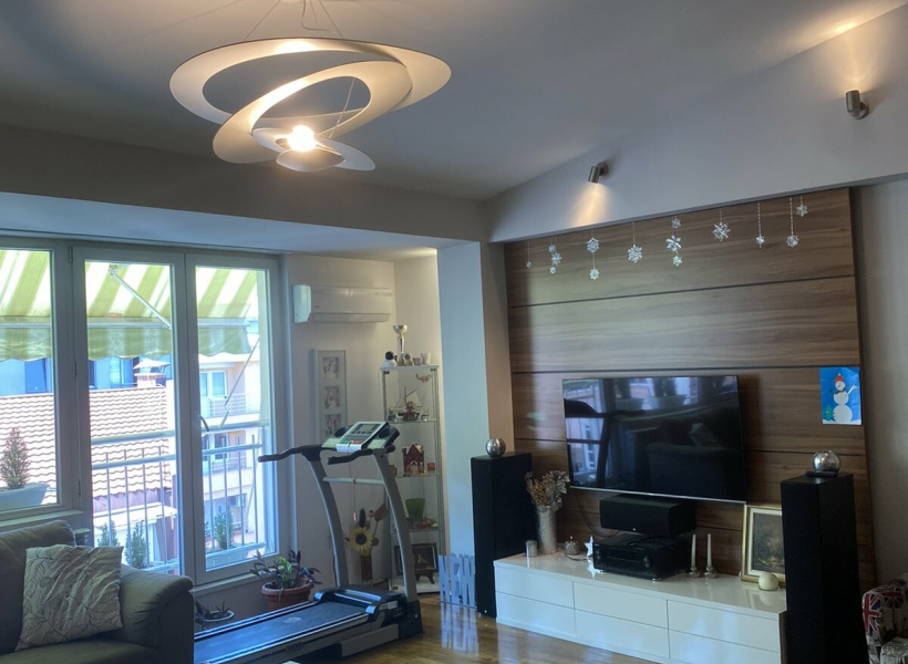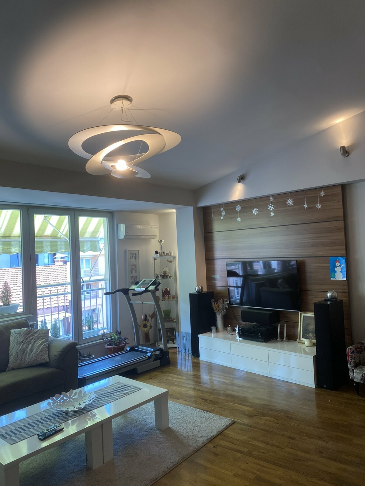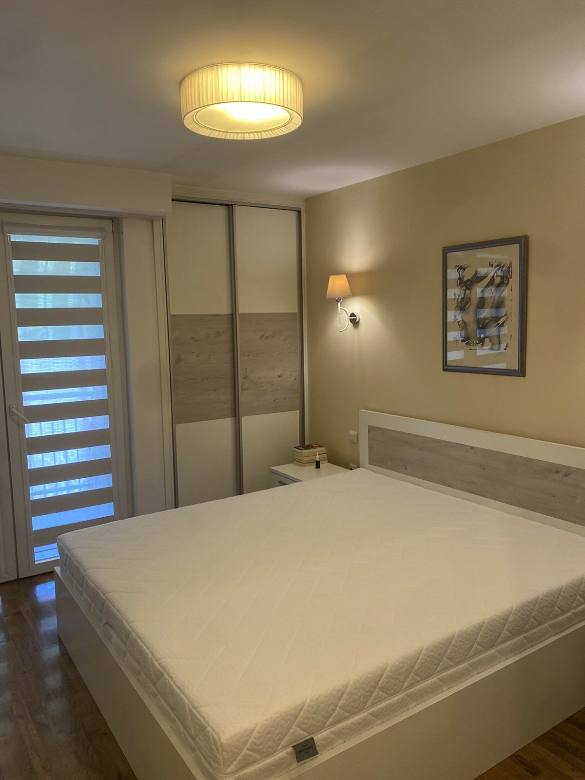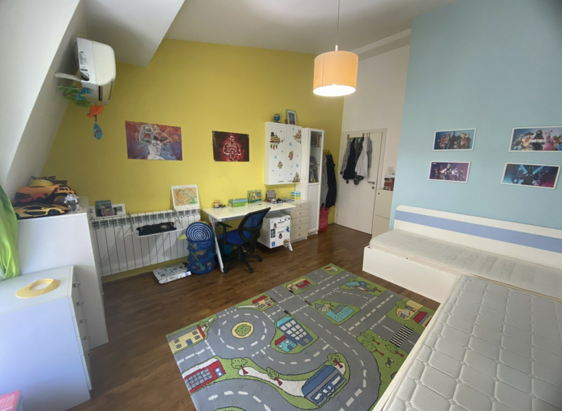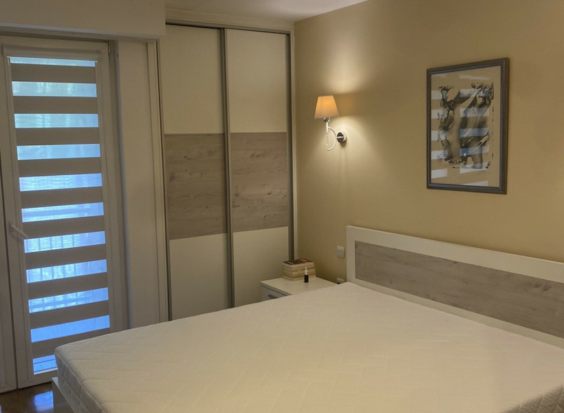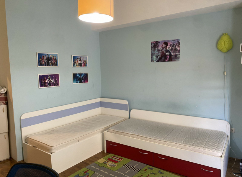 The apartment is located on the fifth floor with a total area of 90m2 and has one living room, fully equipped kitchen and a dining room, one bedroom with a terrace, children's room and a toilet.