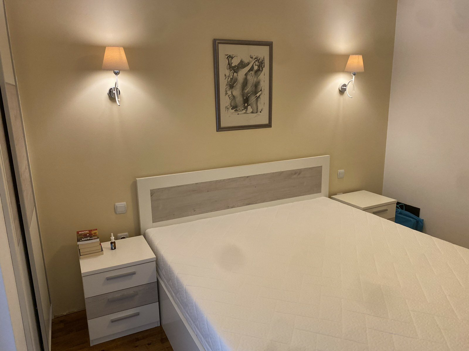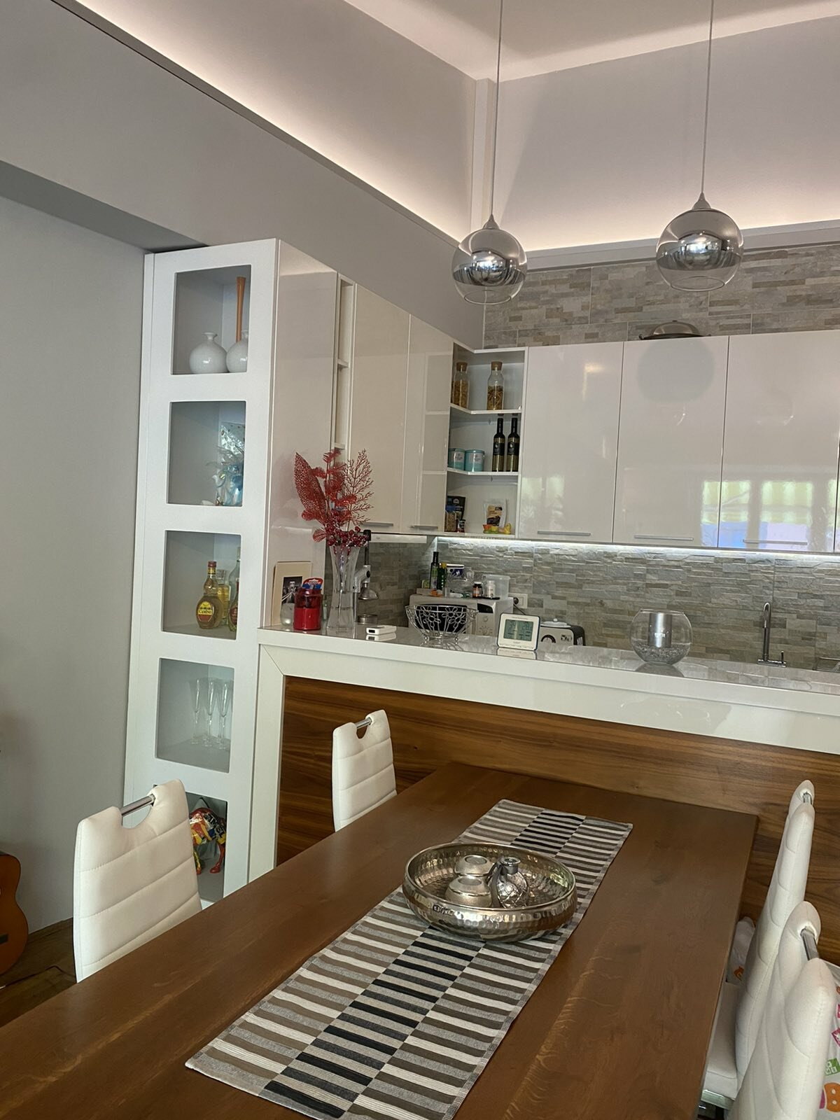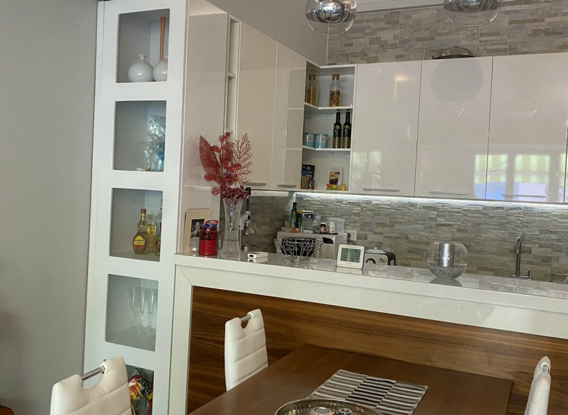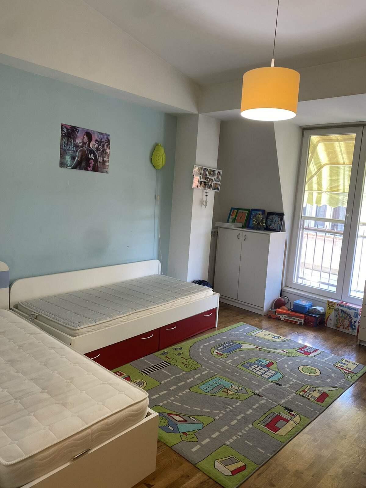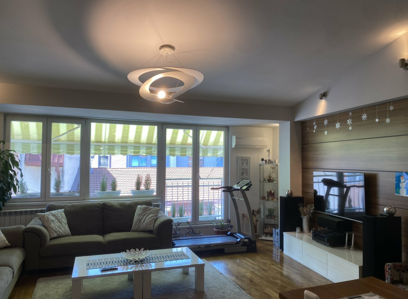 The apartment is located on the fifth floor with a total area of 90m2 and has one living room, fully equipped kitchen and a dining room, one bedroom with a terrace, children's room and a toilet.