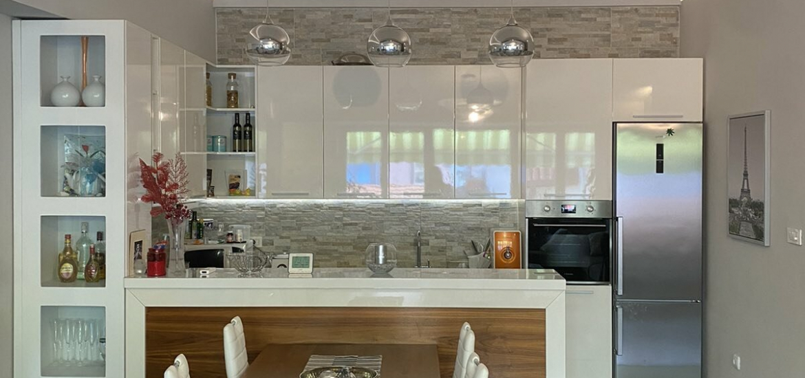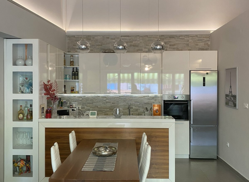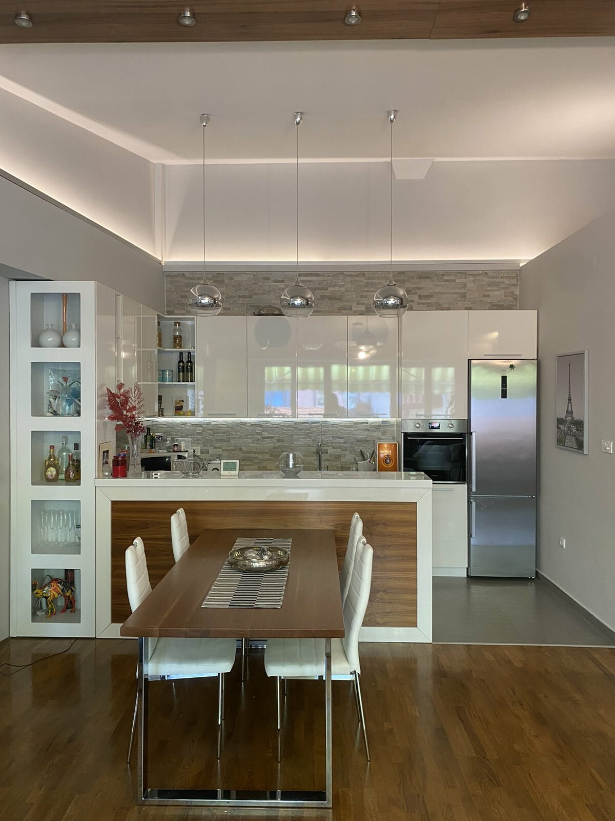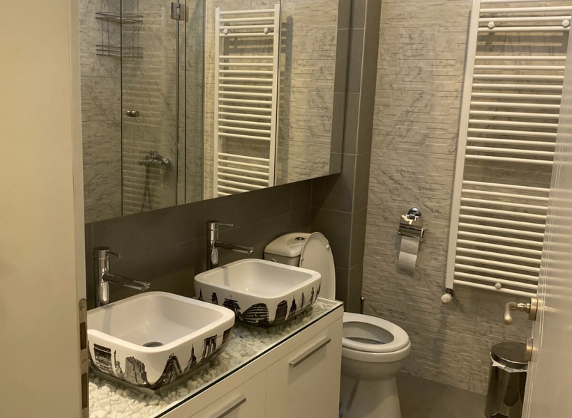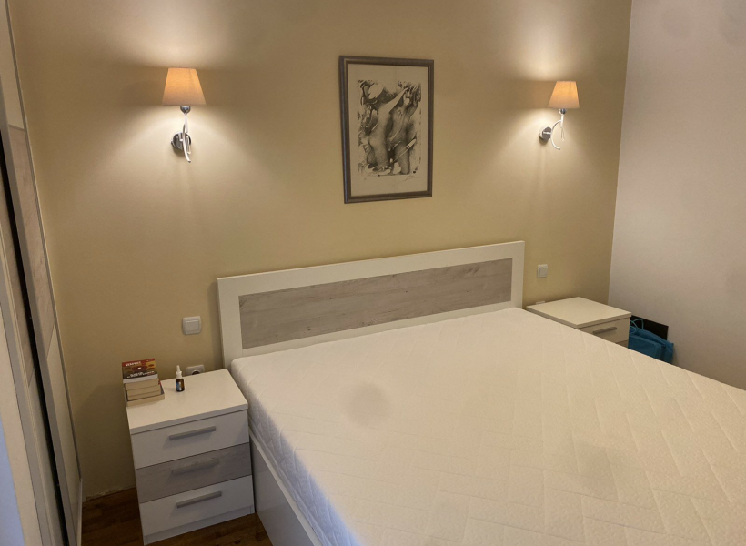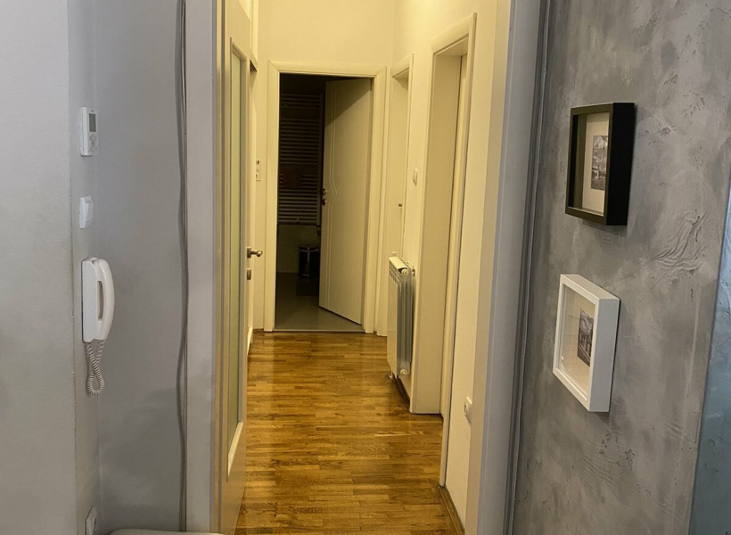 The apartment is located on the fifth floor with a total area of 90m2 and has one living room, fully equipped kitchen and a dining room, one bedroom with a terrace, children's room and a toilet.