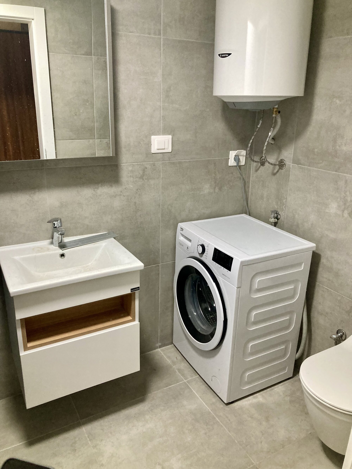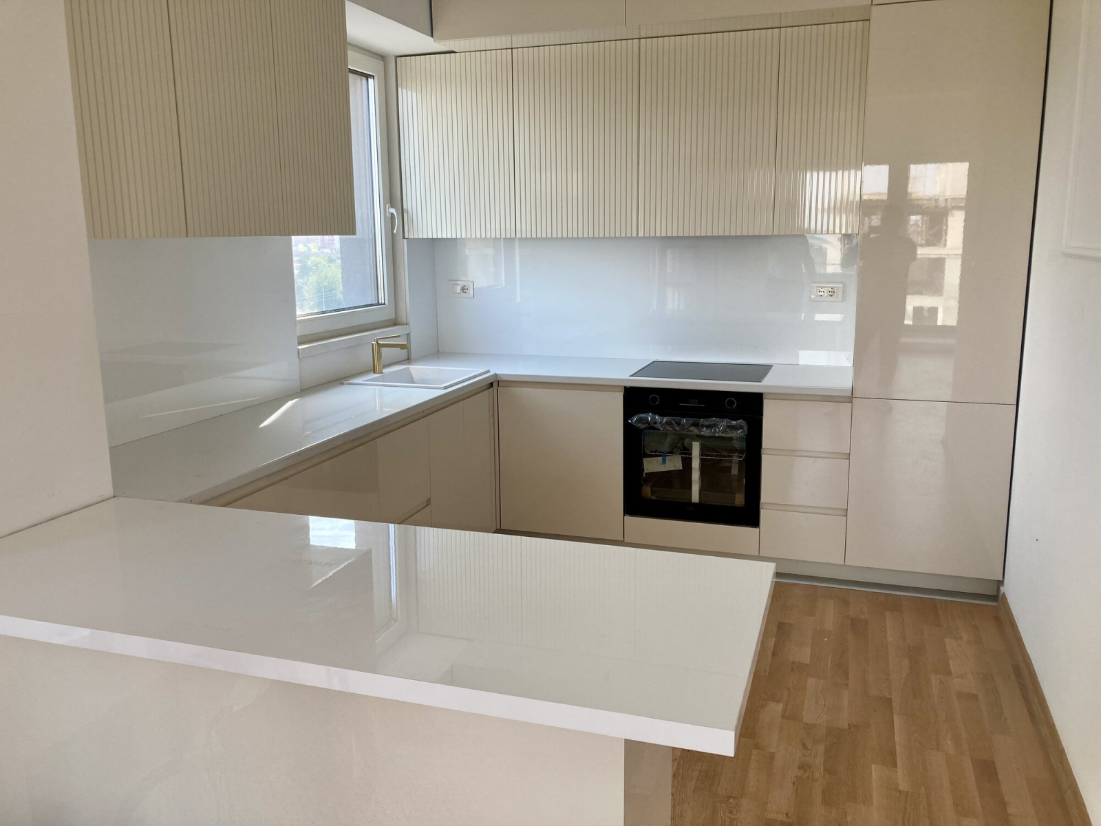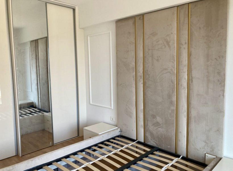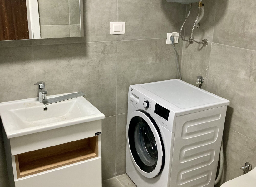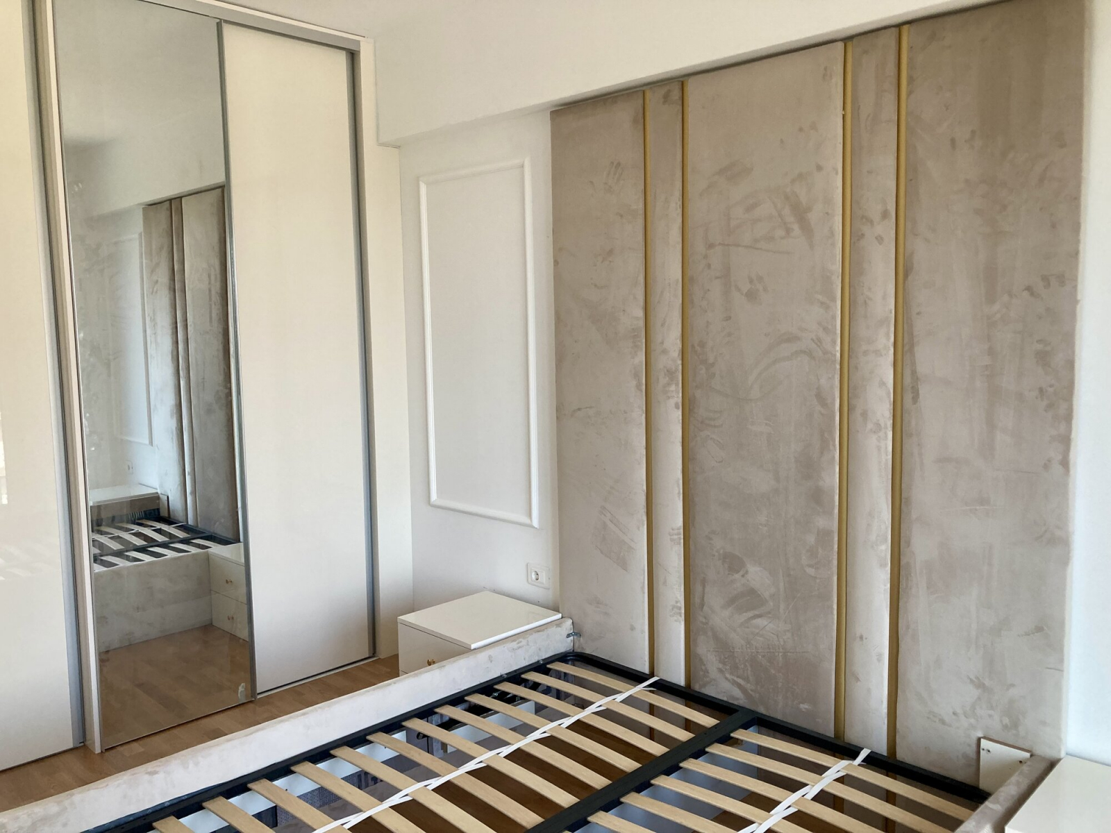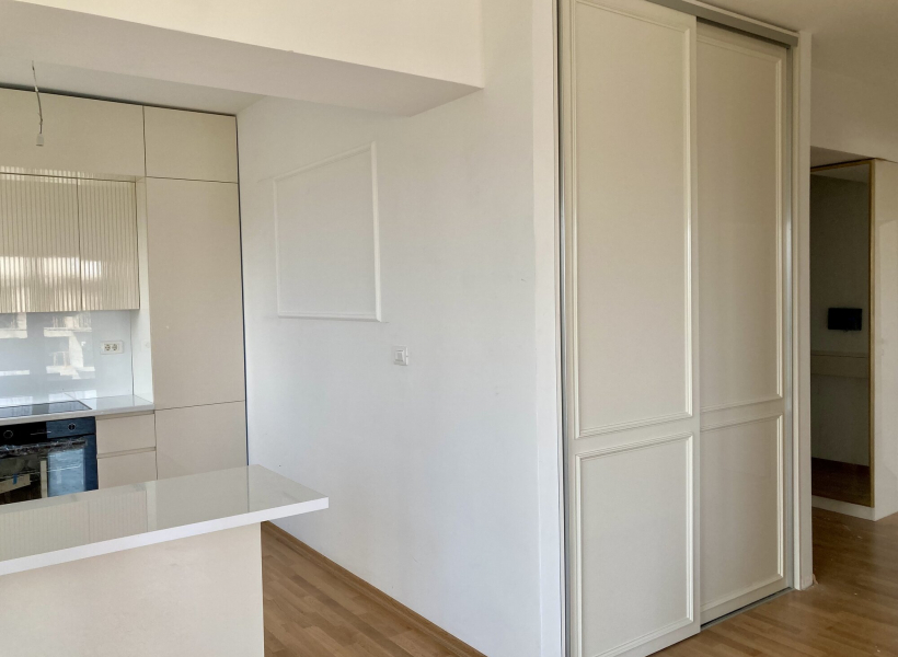 This modern furnished apartment has three rooms - one bedroom, one children's room and a comfortable living room with a dining room and a marble bar, as well as two bathrooms with showers and a pantry.