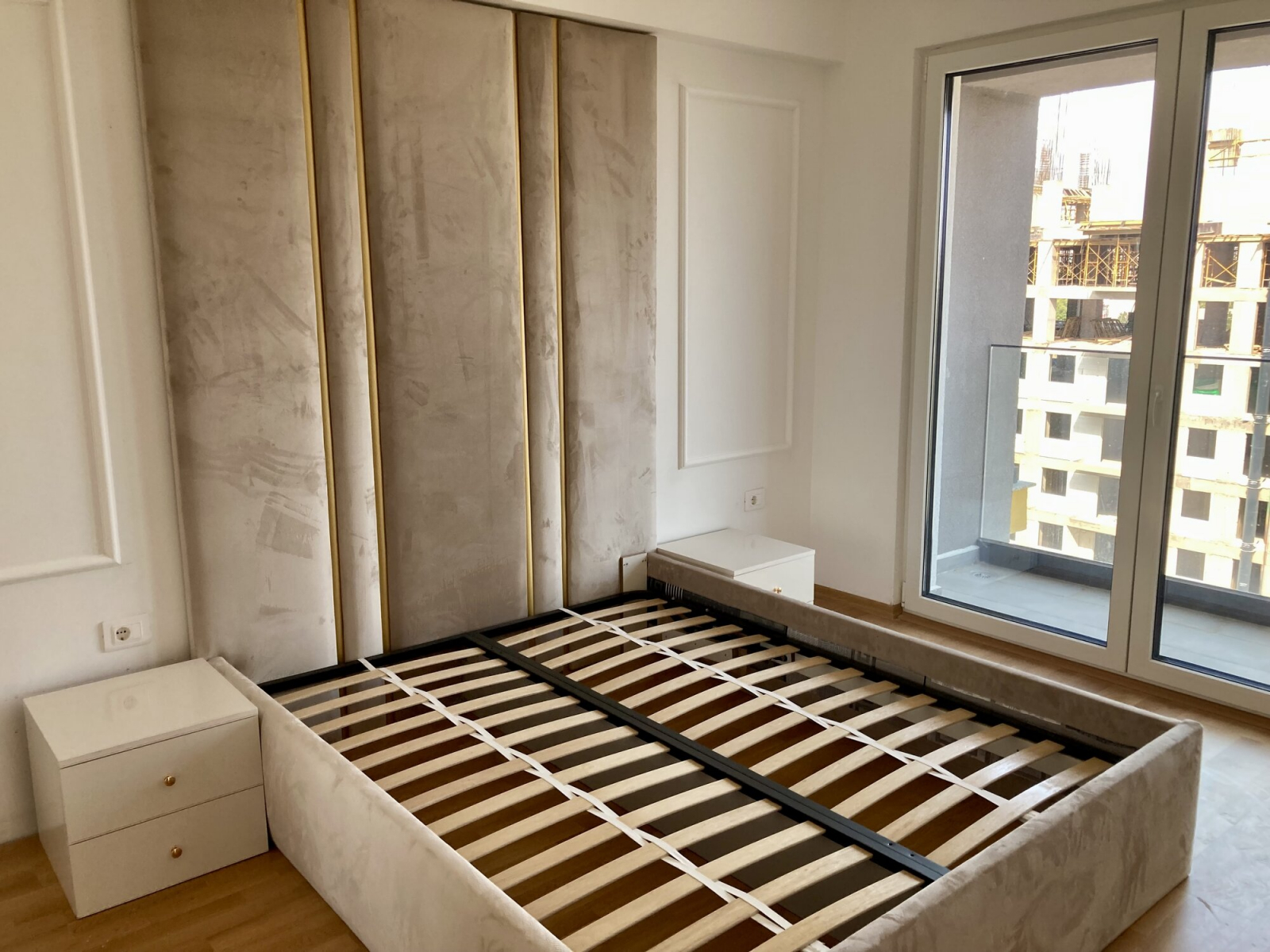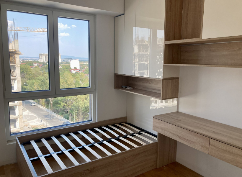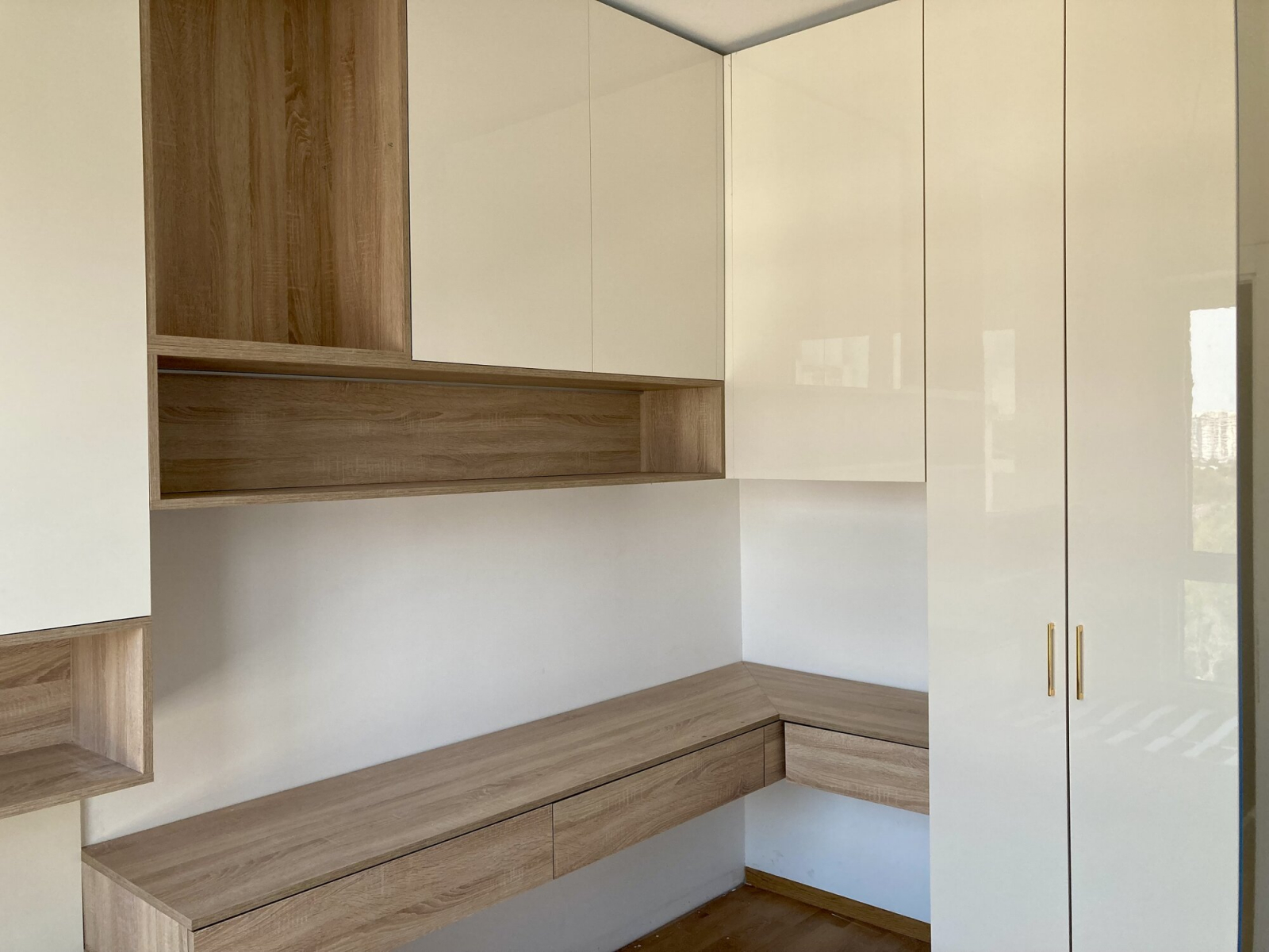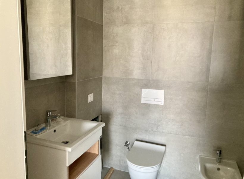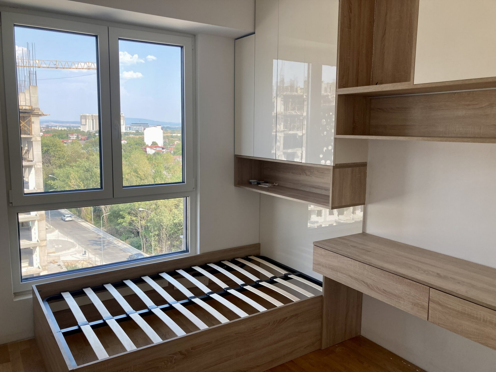 This modern furnished apartment has three rooms - one bedroom, one children's room and a comfortable living room with a dining room and a marble bar, as well as two bathrooms with showers and a pantry.