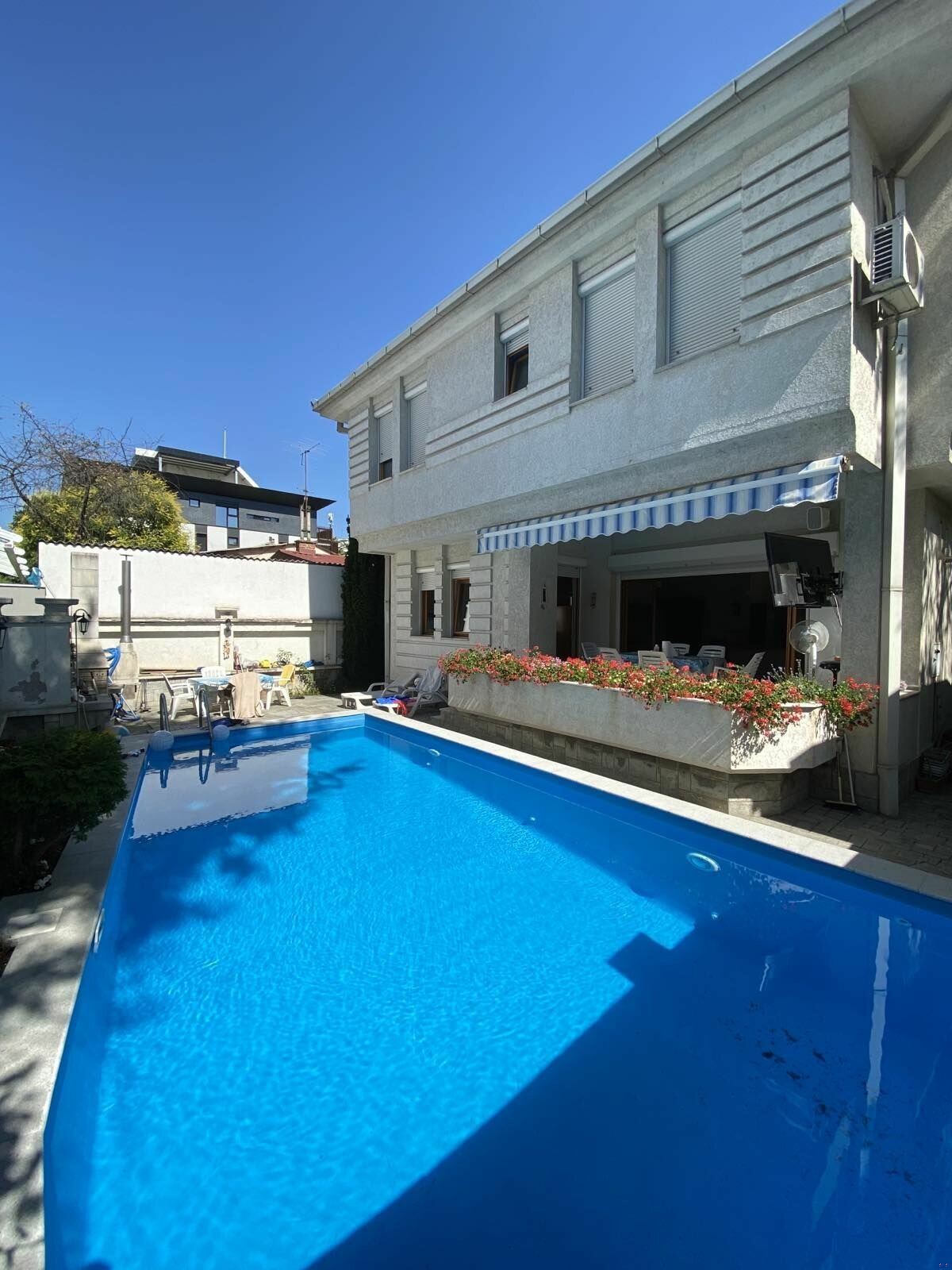 The house has swimming pool and yard with outside seating area.