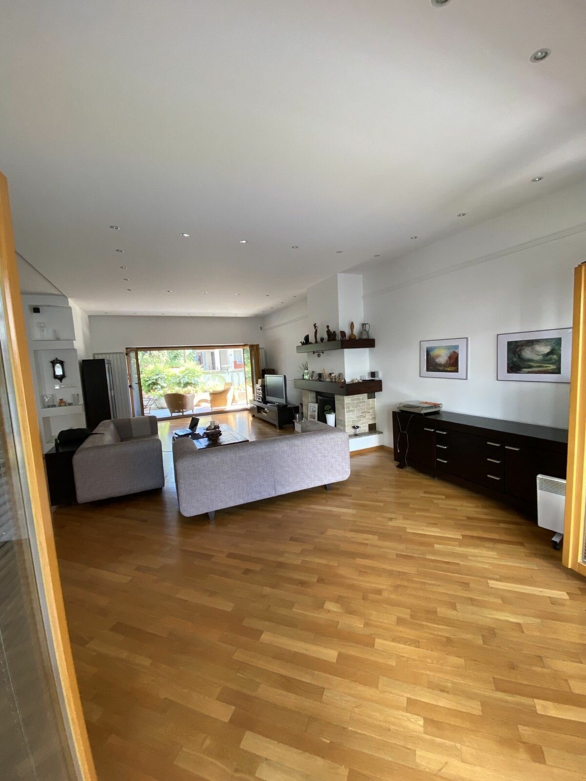 Heating and cooling in the house is regulated through central heating and air conditioning devices.