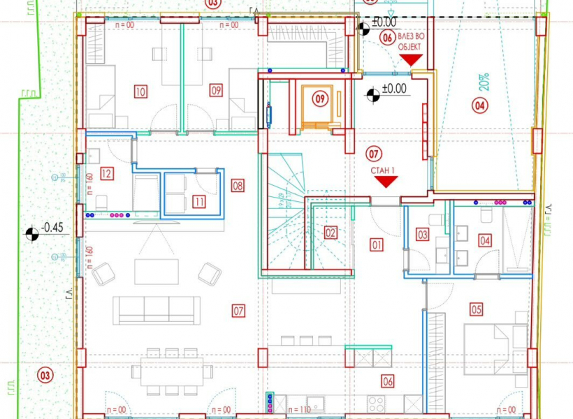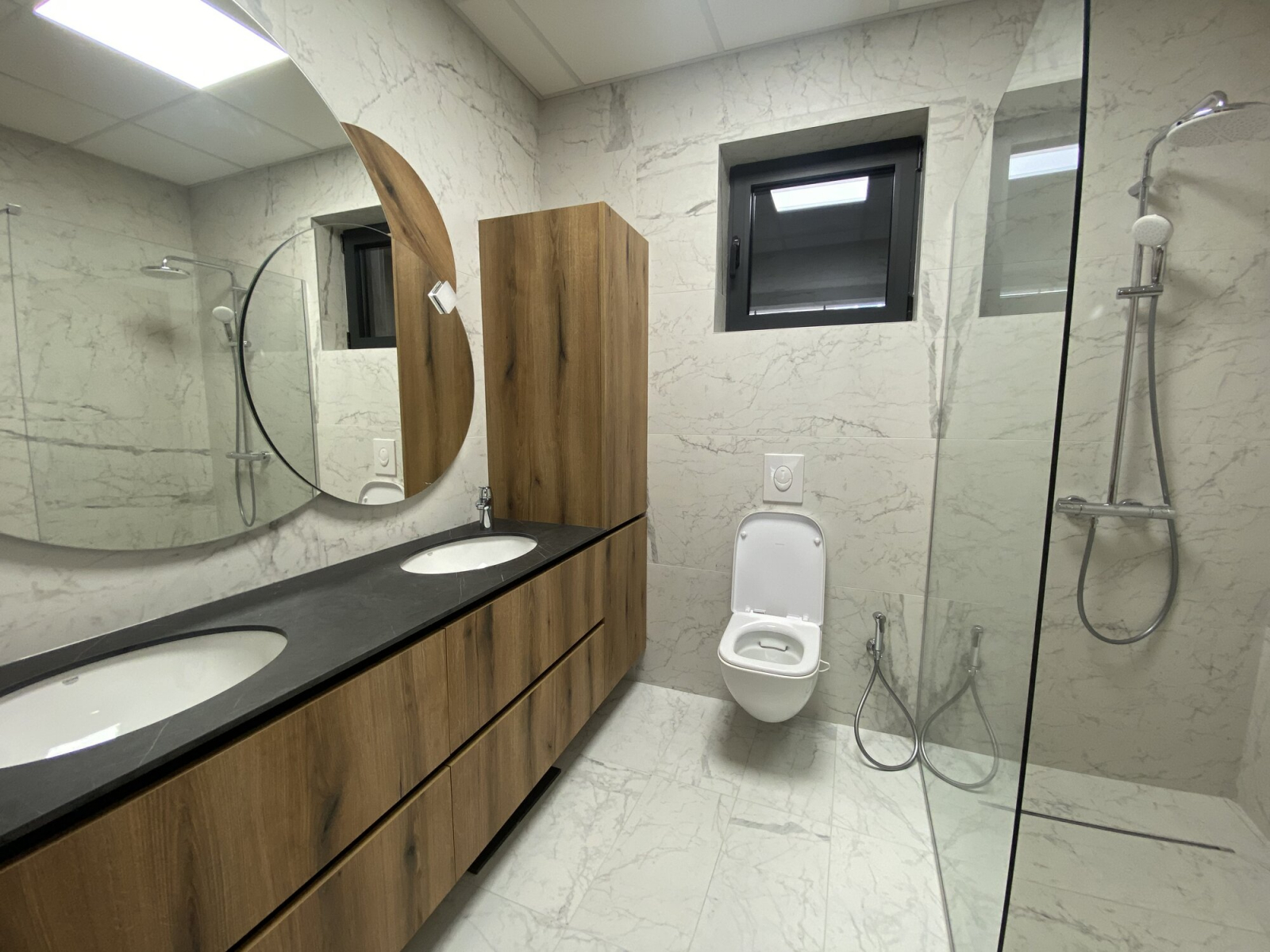 Heating and cooling are regulated by heat pumps with fan coils and floor heating.