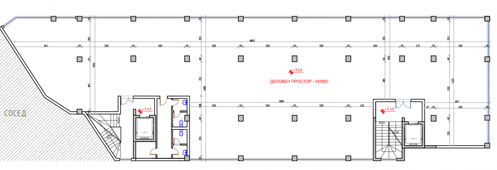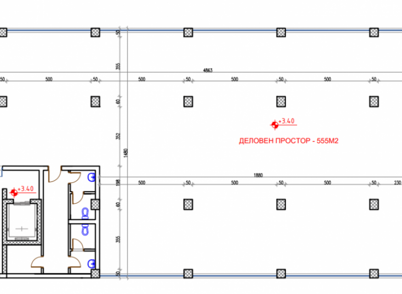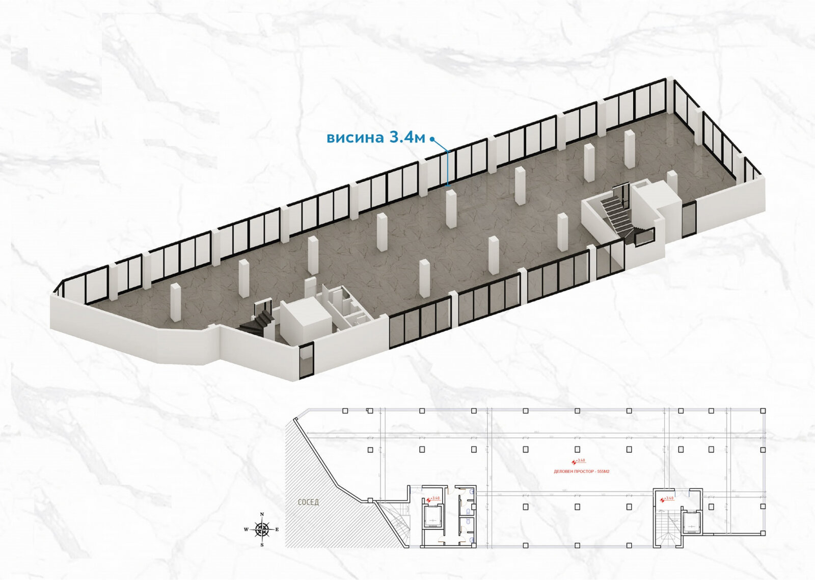 The business space has an area of 555m2 and a height of 3.4m, located on the first floor, in the final stage of construction.