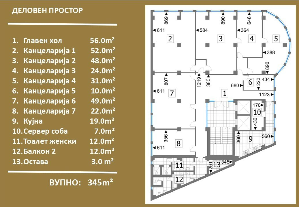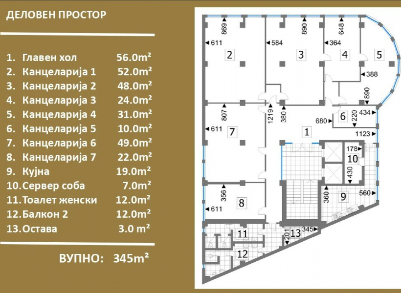 The space has a total area of 345m2, with a reception area, seven separate offices, two toilets, storage room and server room. The heating and cooling in the space is provided through a private heating and cooling system with fancoilers.