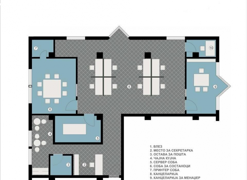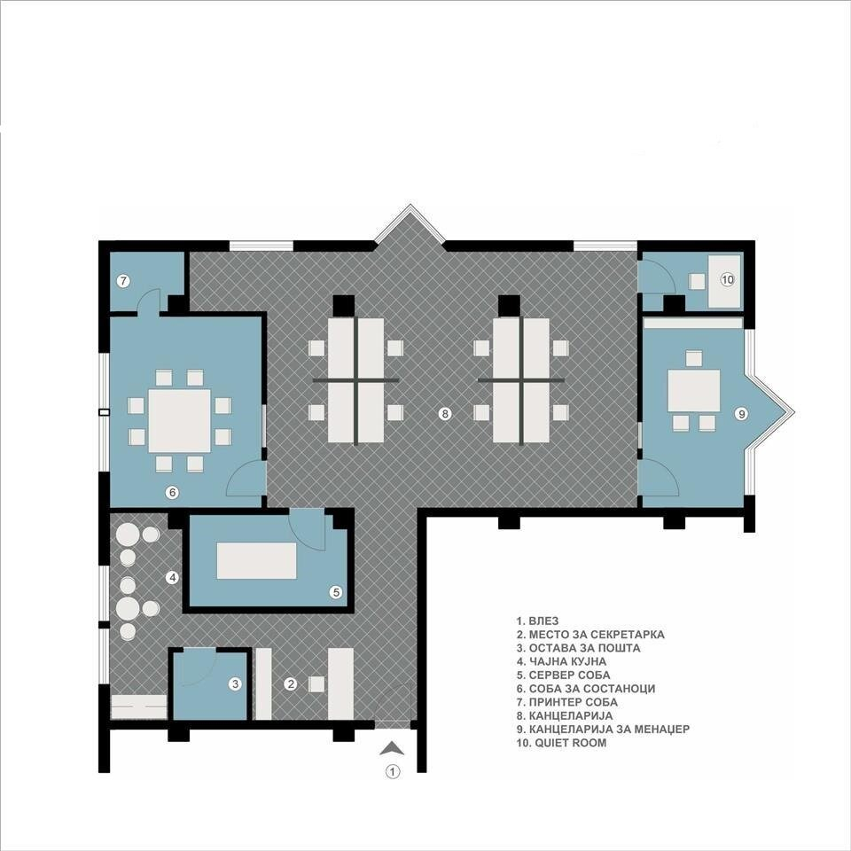 The space is quite bright, has South, East and North orientation, has one open space room, two offices, silent room, server room and kitchen. The space also has private toilet which is not listed on the property list.