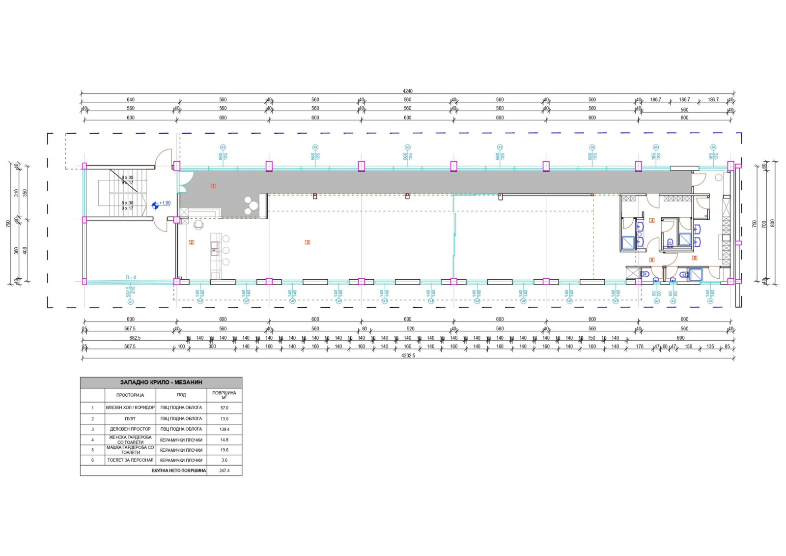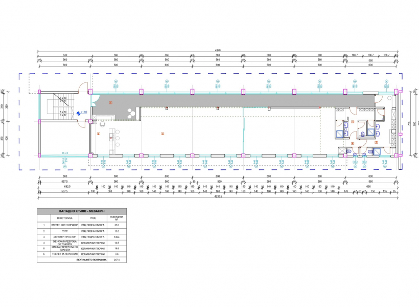 The space is located on a high ground floor and has a total area of 247m2, with two separate rooms and two toilets.