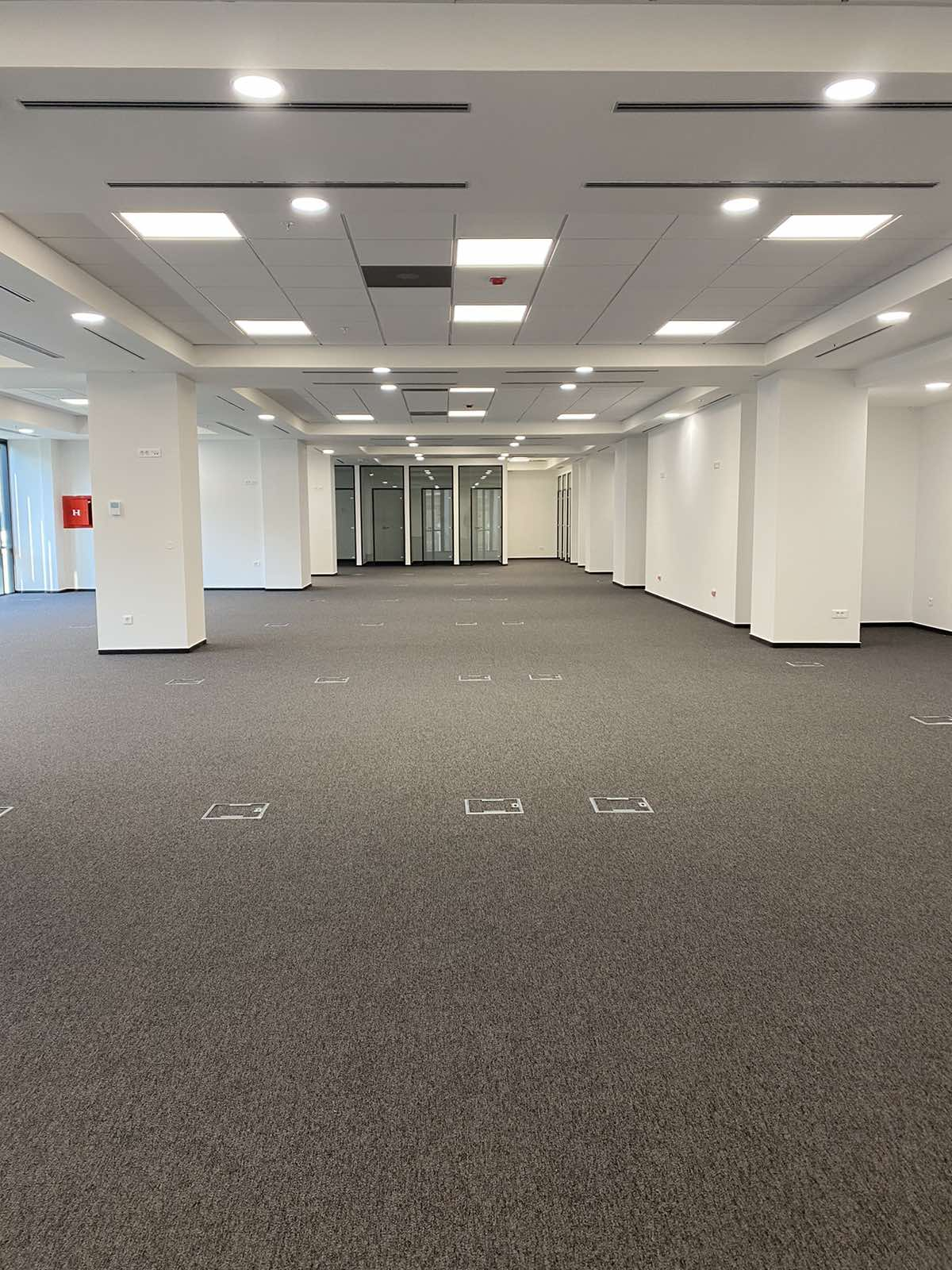 Some of the materials used in the business building - Schuco windows, Carrier cooling and heating system with 2 geothermal heat pumps, Rehau underfloor heating, raised flexible under Kingspan, 4 lifts Otis, Italian Marazzi tiles, Laufen and Grohe sanitary ware, LED lighting and Osram.