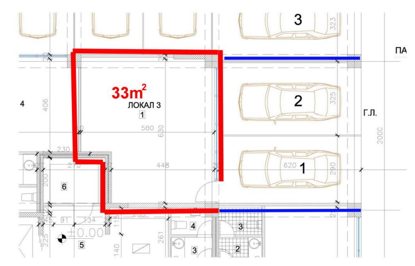 The business space is located in an attractive location, near a new complex of buildings, and has an open space of 33m2 on the ground floor.