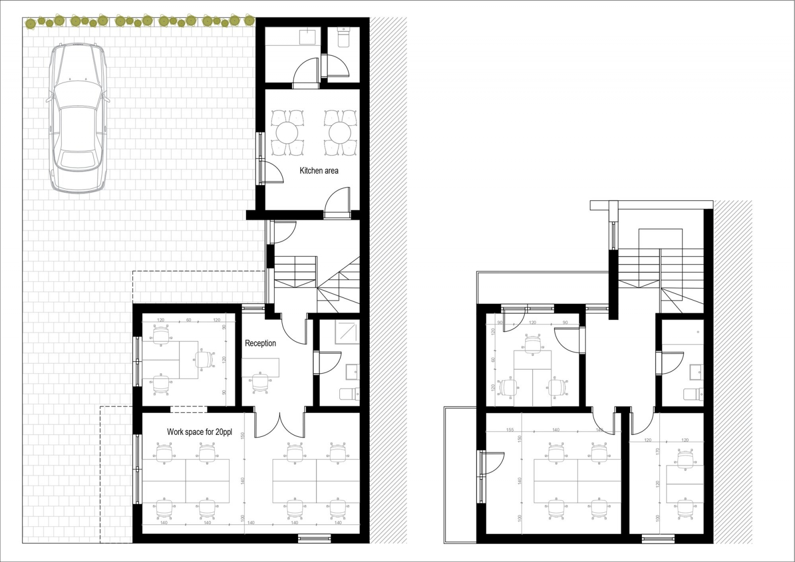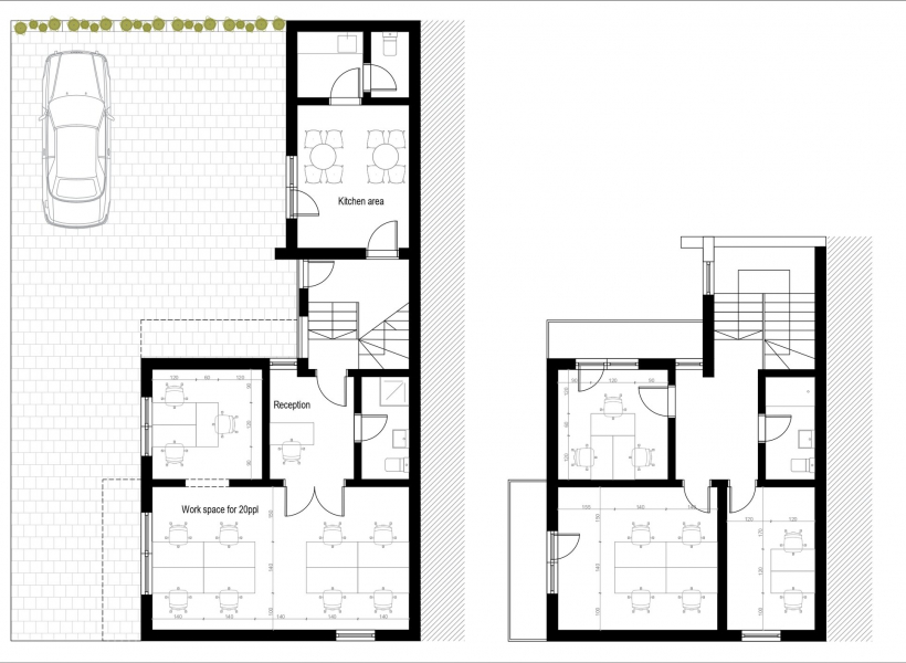 Ground floor: One spacious open space office, one smaller office, toilet, kitchen and pantry.